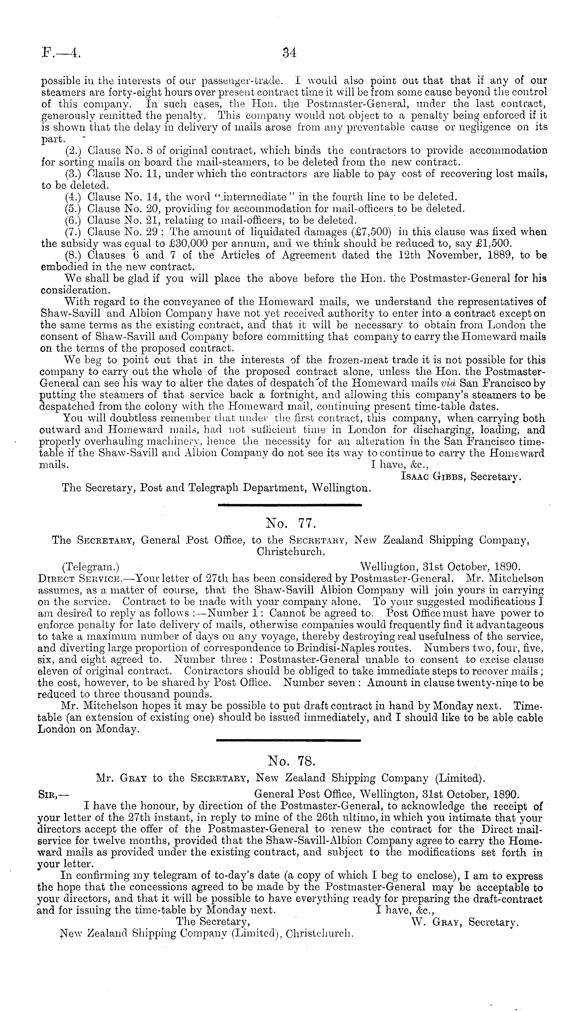 No, 77. The Secretary, General Post Office, to the Secretary, New Zealand Shipping Company, Christchurch. (Telegram.) Wellington, 31st October, 1890. Direct Service.—Your letter of 27th has been considered by Postmaster-General. Mr. Mitchelson assumes, as a matter of course, that the Shaw-Savill Albion Company will join yours in carrying on the service. Contract to be made with your company alone. To your suggested modifications I am desired to reply as follows : —Number 1: Cannot be agreed to. Post Office must have power to enforce penalty for late delivery of mails, otherwise companies would frequently find it advantageous to take a maximum number of days on any voyage, thereby destroying real usefulness of the service, and diverting large proportion of correspondence to Brindisi-Naples routes. Numbers two, four, five, six, and eight agreed to. Number three : Postmaster-General unable to consent to excise clause eleven of original contract. Contractors should be obliged to take immediate steps to recover mails ; the cost, however, to be shared by Post Office. Number seven : Amount in clause twenty-nine to be reduced to three thousand pounds. Mr. Mitchelson hopes it may be possible to put draft contract in hand by Monday next. Timetable (an extension of existing one) should be issued immediately, and I should like to be able cable London on Monday.