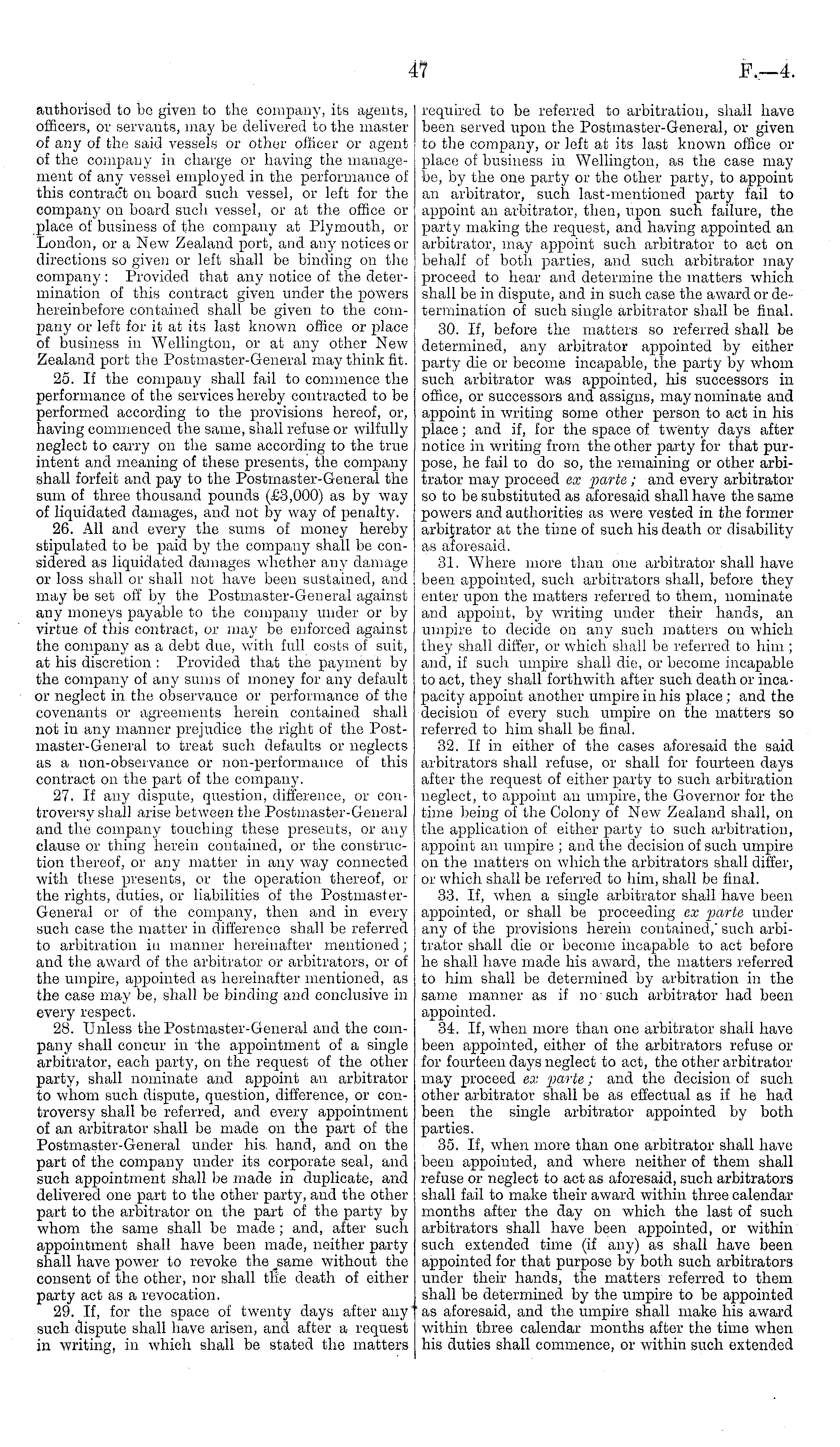 authorised to be given to the company, its agents, officers, or servauts, may be delivered to the master of any of the said vessels or other officer or agent of the company in charge or having the management of any vessel employed in the performance of this contract on board such vessel, or left for the company on board such vessel, or at the office or place of business of the company at Plymouth, or London, or a New Zealand port, and any notices or directions so given or left shall be binding on the company : Provided that any notice of the determination of this contract given under the powers hereinbefore contained shall be given to the company or left for it at its last known office or place of business in Wellington, or at any other New Zealand port the Postmaster-General may think fit. 25. If the company shall fail to commence the performance of the services hereby contracted to be performed according to the provisions hereof, or, having commenced the same, shall refuse or wilfully neglect to carry on the same according to the true intent and meaning of these presents, the company shall forfeit and pay to the Postmaster-General the sum of three thousand pounds (£3,000) as by way of liquidated damages, and not by way of penalty. 26. All and every the sums of money hereby stipulated to be paid by the company shall be considered as liquidated damages whether any damage or loss shall or shall not have been sustained, and may be set off by the Postmaster-General against any moneys payable to the company under or by virtue of this contract, or may be enforced against the company as a debt due, with full costs of suit, at his discretion : Provided that the payment by the company of any sums of money for any default or neglect in the observance or performance of the covenants or agreements herein contained shall not in any manner prejudice the right of the Post-master-General to treat such defaults or neglects as a non-observance or non-performance of this contract on the part of the company. 27. If any dispute, question, difference, or controversy shall arise between the Postmaster-General and the company touching these presents, or any clause or thing herein contained, or the construction thereof, or any matter in any way connected with these presents, or the operation thereof, or the rights, duties, or liabilities of the PostmasterGeneral or of the company, then and in every such case the matter in difference shall be referred to arbitration in manner hereinafter mentioned; and the award of the arbitrator or arbitrators, or of the umpire, appointed as hereinafter mentioned, as the case may be, shall be binding and conclusive in every respect. 28. Unless the Postmaster-General and the company shall concur in the appointment of a single arbitrator, each party, on the request of the other party, shall nominate and appoint an arbitrator to whom such dispute, question, difference, or controversy shall be referred, and every appointment of an arbitrator shall be made on the part of the Postmaster-General under his. hand, and on the part of the company under its corporate seal, and such appointment shall be made in duplicate, and delivered one part to the other party, and the other part to the arbitrator on the part of the party by whom the same shall be made; and, after such appointment shall have been made, neither party shall have power to revoke the _same without the consent of the other, nor shall the death of either party act as a revocation. 29. If, for the space of twenty days after any such dispute shall have arisen, and after a request in writing, in which shall bo stated the matters