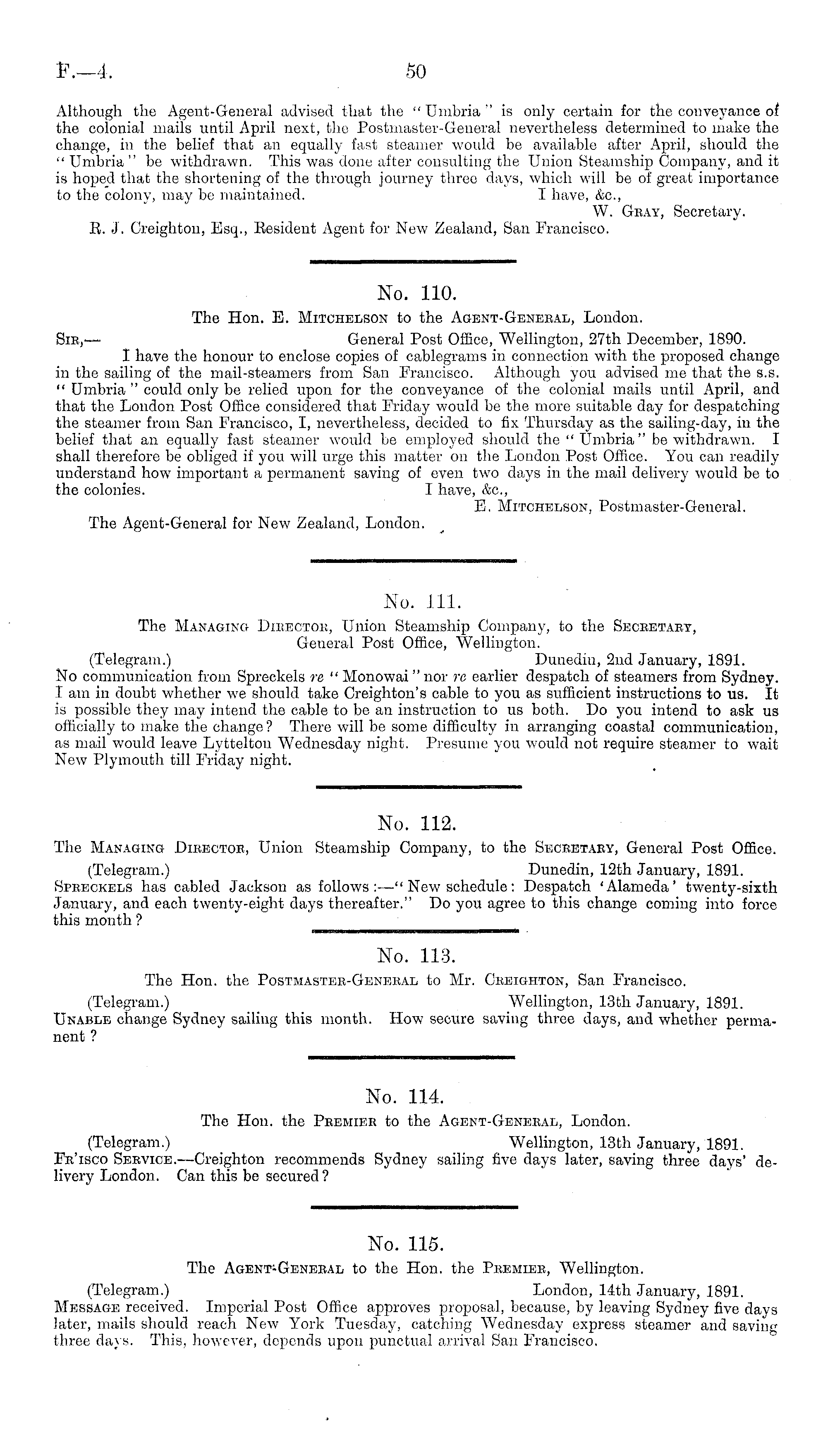 No. 110. The Hon. E. Mitchelson to the Agent-Genebal, London. Sib,— General Post Office, Wellington, 27th December, 1890. I have the honour to enclose copies of cablegrams in connection with the proposed change in the sailing of the mail-steamers from San Francisco. Although you advised me that the s.s. " Umbria " could only be relied upon for the conveyance of the colonial mails until April, and that the London Post Office considered that Friday would be the more suitable day for despatching the steamer from San Francisco, I, nevertheless, decided to fix Thursday as the sailing-day, in the belief that an equally fast steamer would be employed should the "Umbria" be withdrawn. I shall therefore be obliged if you will urge this matter on the London Post Office. You can readily understand how important a permanent saving of even two days in the mail delivery would be to the colonies. I have, &c, E. Mitchelson, Postmaster-General. The Agent-General for New Zealand, London.