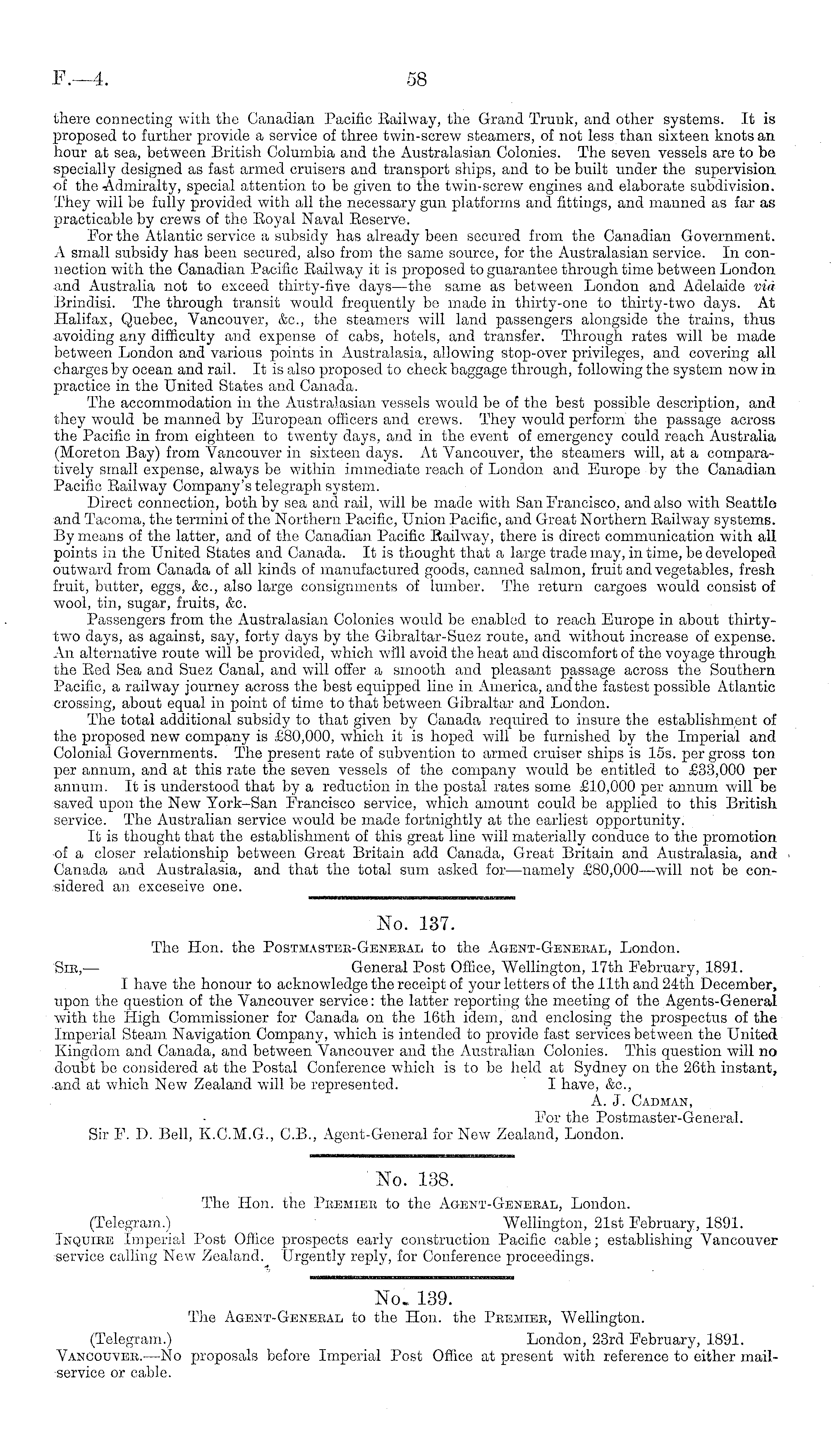 No. 138. The Hon. the Premier to the Agent-General, London. (Telegram.) Wellington, 21st February, 1891. Inquire Imperial Post Office prospects early construction Pacific cable; establishing Vancouver service calling New Zealand. Urgently reply, for Conference proceedings.
