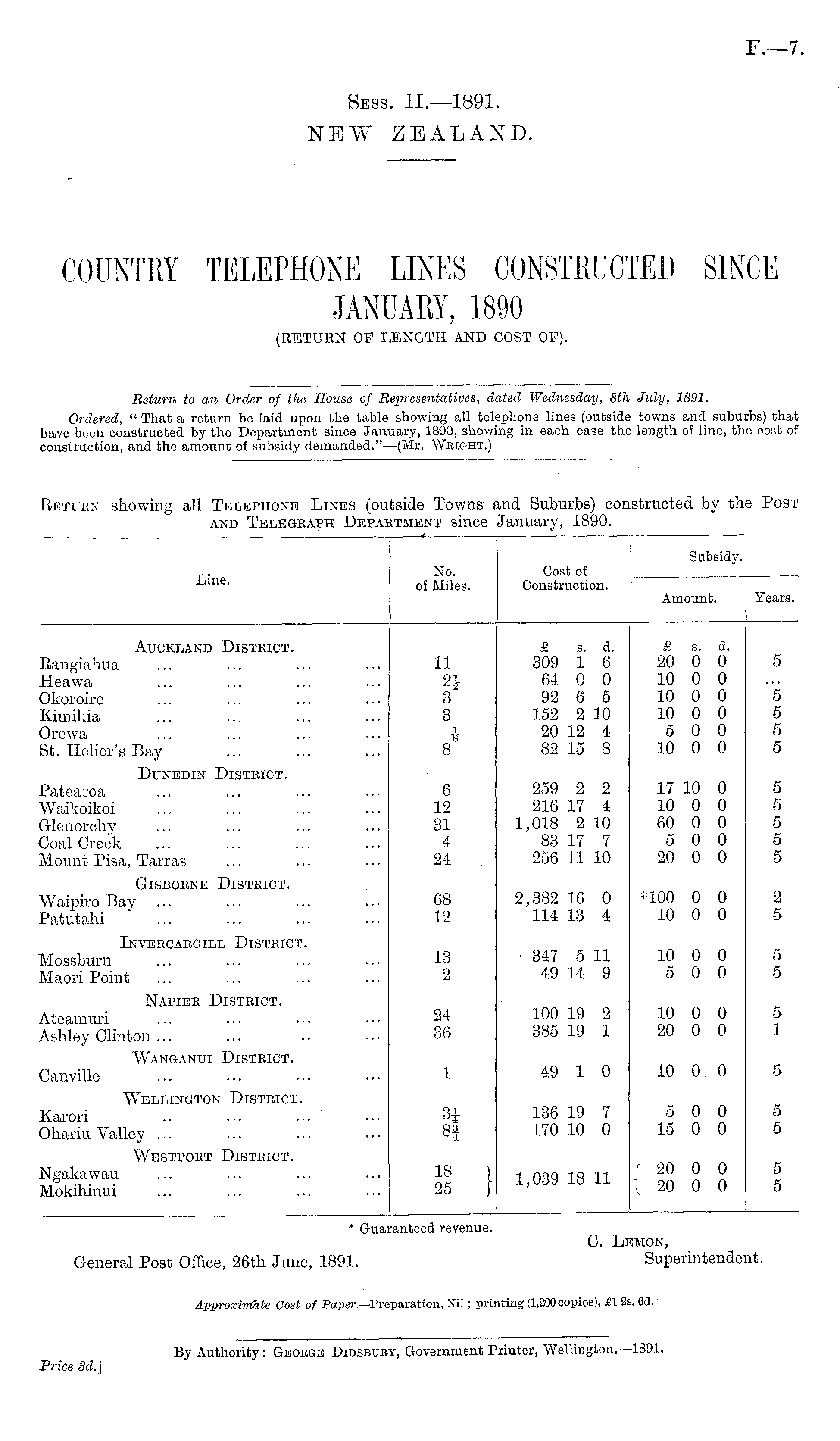 C. Lemon, General Post Office, 26th June, 1891. Superintendent. Approximate Cost of Paper. —Preparation, Nil; printing (1,200 copies), £1 2s. Cd.