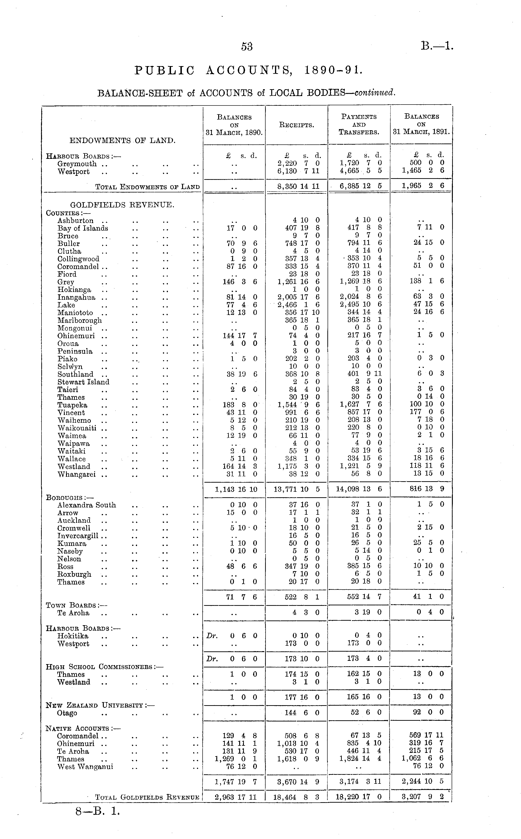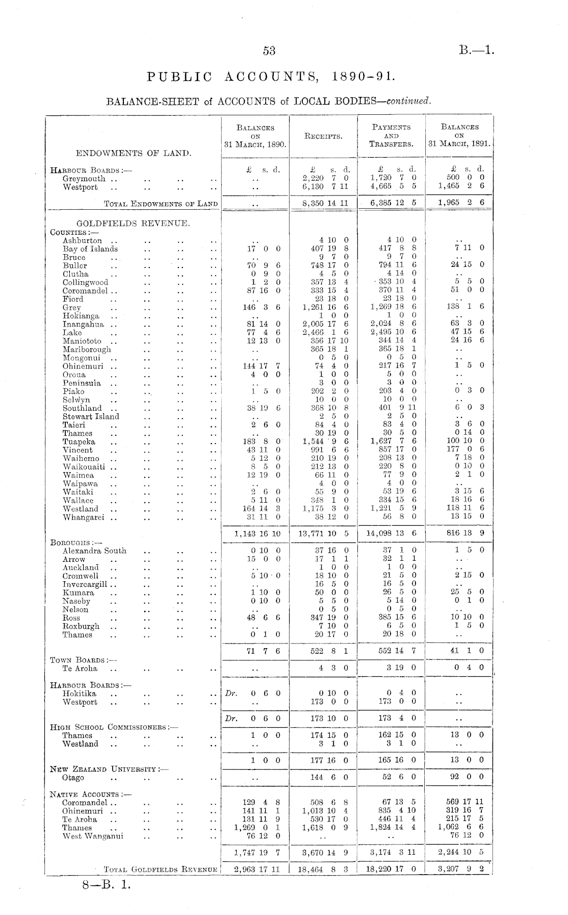 Balances on 31 Mabch, 1890. Receipts. Payments and Transfers. Balances on 31 March, 1891. ENDOWMENTS OP LAND. Habboub Boards :— Greymouth Westport £ s. d. £ B. d. 2,220 7 0 6,130 7 11 £ s. d. 1,720 7 0 4,665 5 5 £ s. d. 500 0 0 1,465 2 6 Total Endowments op Land 8,350 14 11 6,385 12 5 1,965 2 6 GOLDFIELDS REVENUE. Counties :— Ashburton Bay of Islands .. .. " .. Bruce Buller Clutha Oollingwood Coromandel Fiord Grey Hokianga .. Inangahua Lake Maniototo Marlborough Mongonui Ohinemuri Orona Peninsula Piako Selwyn Southland Stewart Island Taieri Thames Tuapeka Vincent Waihemo Waikouaiti Waimea Waipawa Waitaki Wallace Westland Whangarei 17 0 0 70 9 6 0 9 0 12 0 87 16 0 146' 3 6 81 14 0 77 4 6 12 13 0 144 17 7 4 0 0 4 10 0 407 19 8 9 7 0 748 17 0 4 5 0 357 13 4 333 15 4 23 18 0 1,261 16 6 10 0 2,005 17 6 2,466 1 6 356 17 10 365 18 1 0 5 0 74 4 0 10 0 3 0 0 202 2 0 10 0 0 368 10 8 2 5 0 84 4 0 30 19 0 1,544 9 6 991 6 6 210 19 0 212 13 0 66 11 0 4 0 0 55 9 0 348 1 0 1,175 3 0 38 12 0 4 10 0 417 8 8 9 7 0 794 11 6 4 14 0 • 353 10 4 370 11 4 23 18 0 1,269 18 6 10 0 2,024 8 6 2,495 10 6 344 14 4 365 18 1 0 5 0 217 16 7 5 0 0 3 0 0 203 4 0 10 0 0 401 9 11 2 5 0 83 4 0 30 5 0 1,627 7 6 857 17 0 208 13 0 220 8 0 77 9 0 4 0 0 53 19 6 334 15 6 1,221 5 9 56 8 0 711 0 24 15 0 5 5 0 51 0 0 138 1 6 63 3 0 47 15 6 24 16 6 15 0 15 0 03 0 38 19 6 60 3 2 6 0 183 8 0 43 11 0 5 12 0 8 5 0 12 19 0 3 6 0 0 14 0 100 10 0 177 0 6 7 18 0 0 10 0 2 10 2 6 0 5 11 0 164 14 3 31 11 0 3 15 6 18 16 6 118 11 6 13 15 0 Boboughs :— Alexandra South Arrow Auckland Cromwell Invercargill Kumara Naseby Nelson .. .. Boss Roxburgh Thames 1,143 16 10 13,771 10 5 14,098 13 6 816 13 9 0 10 0 15 0 0 37 16 0 17 1 1 10 0 18 10 0 16 5 0 50 0 0 5 5 0 0 5 0 347 19 0 7 10 0 20 17 0 37 1 0 32 1 1 10 0 21 5 0 16 5 0 26 5 0 5 14 0 0 5 0 385 15 6 6 5 0 20 18 0 15 0 5 10 0 2'l5 0 i'lO 0 0 10 0 25 5 0 0 10 48' 6 6 10 10 0 15 0 0 10 Town Boards :— Te Aroha 71 7 6 522 8 1 4 3 0 552 14 7 41 1 0 3 19 0 0 4 0 Habbour Boabds:— Hokitika Westport Dr. 0 6 0 0 10 0 173 0 0 0 4 0 173 0 0 High School Commissioners :— Thames Westland Dr. 0 6 0 10 0 173 10 0 174 15 0 3 10 173 4 0 162 15 0 3 10 13 0 0 New Zealand University :— Otago 10 0 177 16 0 165 16 0 13 0 0 92 0 0 144 6 0 52 6 0 Native Accounts :— Coromandel Ohinemuri Te Aroha Thames West Wahganui 129 4 8 141 11 1 131 11 9 1,269 0 1 76 12 0 508 6 8 1,013 10 4 530 17 0 1,618 0 9 67 13 5 835 4 10 446 11 4 1,824 14 4 569 17 11 319 16 7 215 17 5 1,062 6 6 76 12 0 1,747 19 7 3,670 14 9 3,174 3 11 2,244 10 5 Total Goldsields Revenue 2,963 17 11 18,464 8 3 18,220 17 0 3,207 9 2