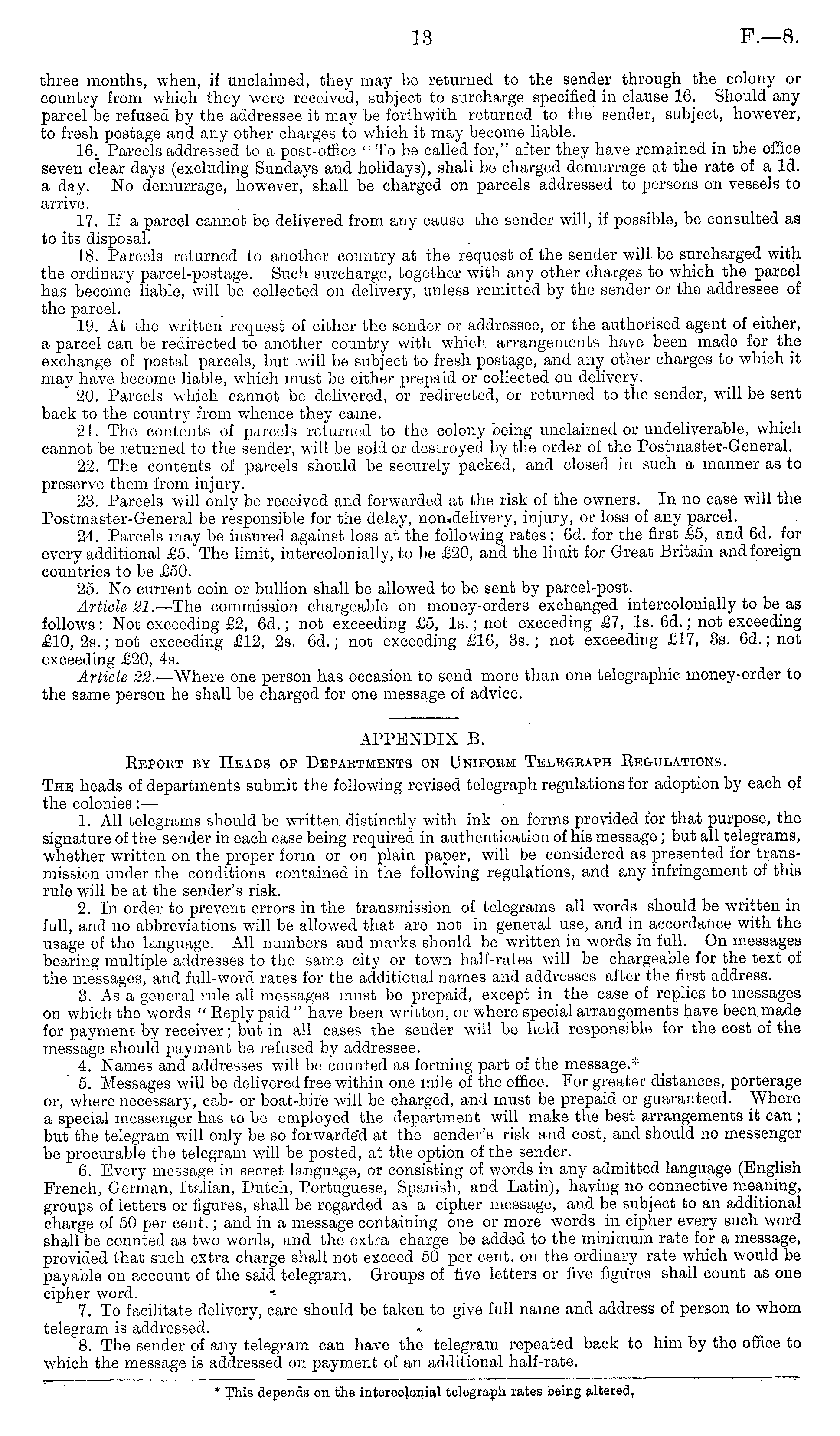 three months, when, if unclaimed, they may be returned to the sender through the colony or country from which they were received, subject to surcharge specified in clause 16. Should any parcel be refused by the addressee it may be forthwith returned to the sender, subject, however, to fresh postage and. any other charges to which it may become liable. 16., Parcels addressed to a post-office " To be called for," after they have remained in the office seven clear days (excluding Sundays and holidays), shall be charged demurrage at the rate of a Id. a day. No demurrage, however, shall be charged on parcels addressed to persons on vessels to arrive. 17. If a parcel cannot be delivered from any cause the sender will, if possible, be consulted as to its disposal. 18. Parcels returned to another country at the request of the sender will be surcharged with the ordinary parcel-postage. Such surcharge, together with any other charges to which the parcel has become liable, will be collected on delivery, unless remitted by the sender or the addressee of the parcel. 19. At the written request of either the sender or addressee, or the authorised agent of either, a parcel can be redirected to another country with which arrangements have been made for the exchange of postal parcels, but will be subject to fresh postage, and any other charges to which it may have become liable, which must be either prepaid or collected on delivery. 20. Parcels which cannot be delivered, or redirected, or returned to the sender, will be sent back to the country from whence they came. 21. The contents of parcels returned to the colony being unclaimed or undeliverablo, which cannot be returned to the sender, will be sold or destroyed by the order of the Postmaster-General. 22. The contents of parcels should be securely packed, and closed in such a manner as to preserve them from injury. 23. Parcels will only be received and forwarded at the risk of the owners. In no case will the Postmaster-General be responsible for the delay, nondelivery, injury, or loss of any parcel. 24. Parcels may be insured against loss at the following rates : 6d. for the first £5, and 6d. for every additional £5. The limit, intercolouially, to be £20, and the limit for Great Britain and foreign countries to be £50. 25. No current coin or bullion shall be allowed to be sent by parcel-post. Article 21. —The commission chargeable on money-orders exchanged intercolonially to be as follows: Not exceeding £2, 6d.; not exceeding £5, Is.; not exceeding £7, Is. 6d.; not exceeding £10, 25.; not exceeding £12, 2s. 6d.; not exceeding £16, 3s. ; not exceeding £17, 3s. 6d.; not exceeding £20, 4s. Article 22. —Where one person has occasion to send more than one telegraphic money-order to the same person he shall be charged for one message of advice.