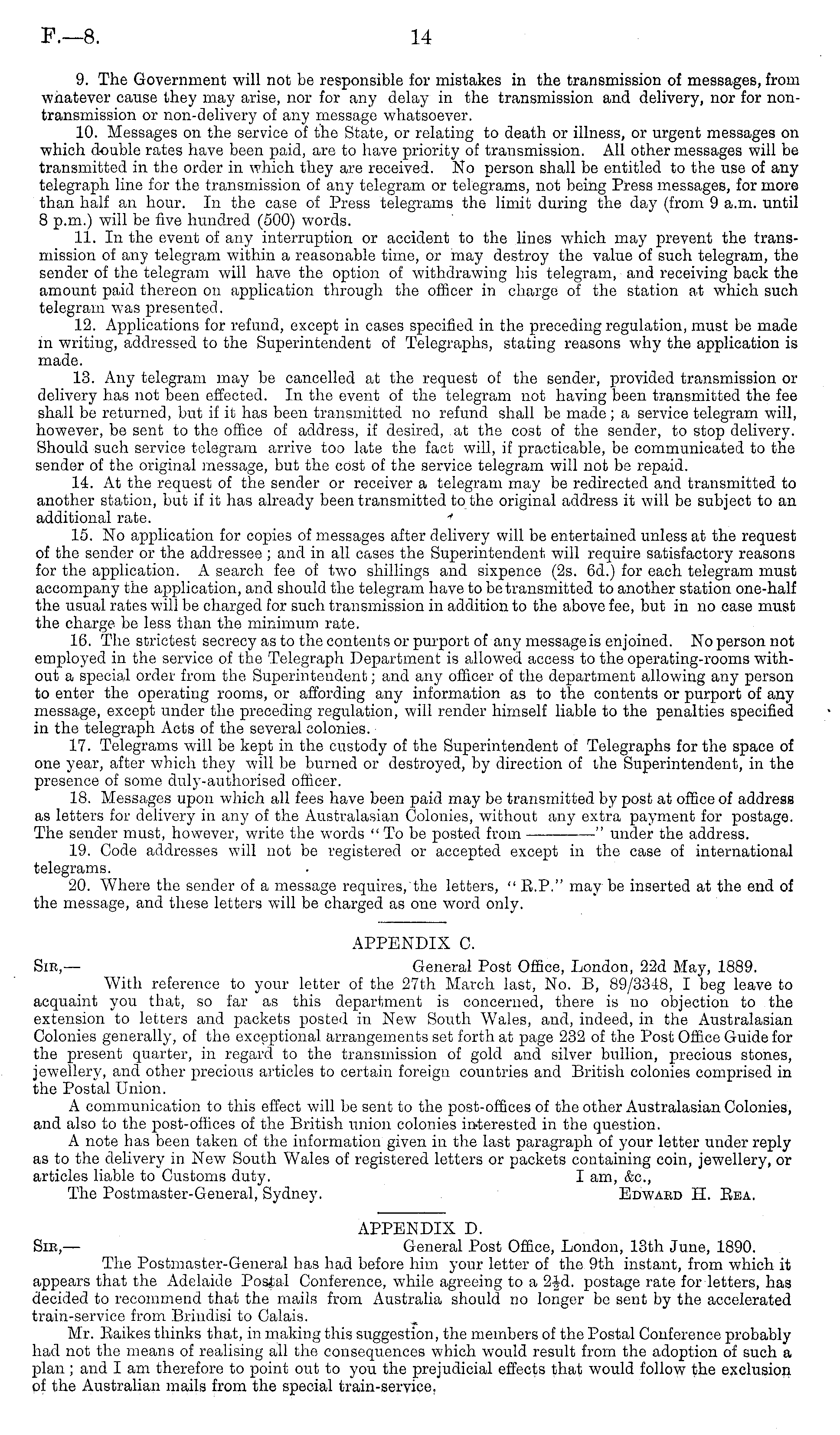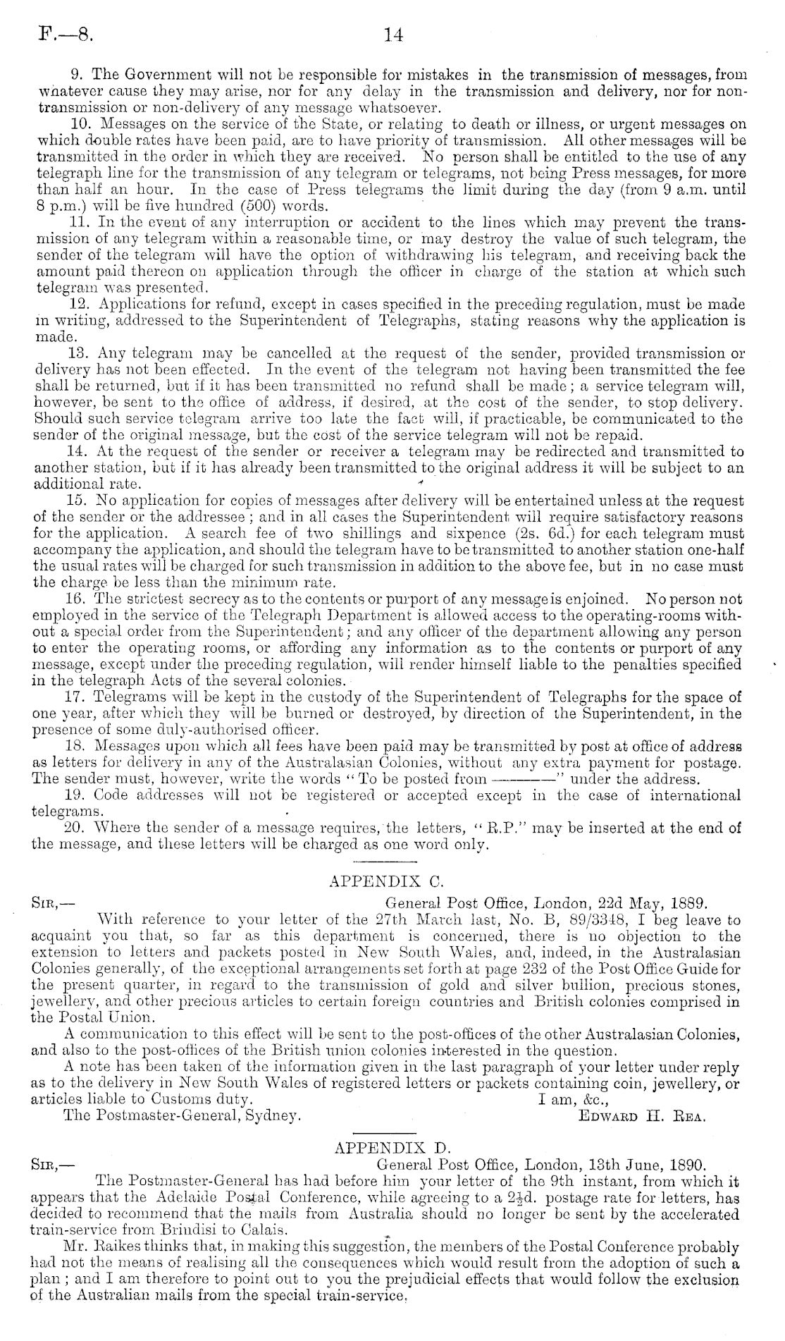 9. The Government will not be responsible for mistakes in the transmission of messages, from wnatever cause they may arise, nor for any delay in the transmission and delivery, nor for nontransmission or non-delivery of any message whatsoever. 10. Messages on the service of the State, or relating to death or illness, or urgent messages on which double rates have been paid, are to have priority of transmission. All other messages will be transmitted in the order in which they are received. No person shall be entitled to the use of any telegraph line for the transmission of any telegram or telegrams, not being Press messages, for more than half an hour. In the case of Press telegrams the limit during the day (from 9 a.m. until 8 p.m.) will be five hundred (500) words. 11. In the event of any interruption or accident to the lines which may prevent the transmission of any telegram within a reasonable time, or may destroy the value of such telegram, the sender of the telegram will have the option of withdrawing his telegram, and receiving back the amount paid thereon on application through the officer in charge of the station at which such telegram was presented. 12. Applications for refund, except in cases specified in the preceding regulation, must be made in writing, addressed to the Superintendent of Telegraphs, stating reasons why the application is made. 13. Any telegram may be cancelled at the request of the sender, provided transmission or delivery has not been effected. In the event of the telegram not having been transmitted the fee shall be returned, but if it has been transmitted no refund shall be made; a service telegram will, however, be sent to the office of address, if desired, at the cost of the sender, to stop delivery. Should such service telegram arrive too late the fact will, if practicable, be communicated to the sender of the original message, but the cost of the service telegram will not ha repaid. 14. At the request of the sender or receiver a telegram may be redirected and transmitted to another station, but if it has already been transmitted to the original address it will be subject to an additional rate. 15. No application for copies of messages after delivery will be entertained unless at the request of the sender or the addressee ; and in all cases the Superintendent will require satisfactory reasons for the application. A search fee of two shillings and sixpence (2s. 6d.) for each telegram must accompany the application, and should the telegram have to be transmitted to another station one-half the usual rates will be charged for such transmission in addition to the above fee, but in no case must the charge be less than the minimum rate. 16. The strictest secrecy as to the contents or purport of any message is enjoined. No person not employed in the service of the Telegraph Department is allowed access to the operating-rooms without a special order from the Superintendent; and any officer of the department allowing any person to enter the operating rooms, or affording any information as to the contents or purport of any message, except under the preceding regulation, will render himself liable to the penalties specified in the telegraph Acts of the several colonies. 17. Telegrams will be kept in the custody of the Superintendent of Telegraphs for the space of one year, after which they will be burned or destroyed, by direction of the Superintendent, in the presence of some duly-authorised officer. 18. Messages upon which all fees have been paid may be transmitted by post at office of address as letters for delivery in any of the Australasian Colonies, without any extra payment for postage. The sender must, however, write the words " To be posted from " under the address. 19. Code addresses will not be registered or accepted except in the case of international telegrams. 20. Where the sender of a message requires, the letters, " R.P." may be inserted at the end of the message, and these letters will be charged as one word only.