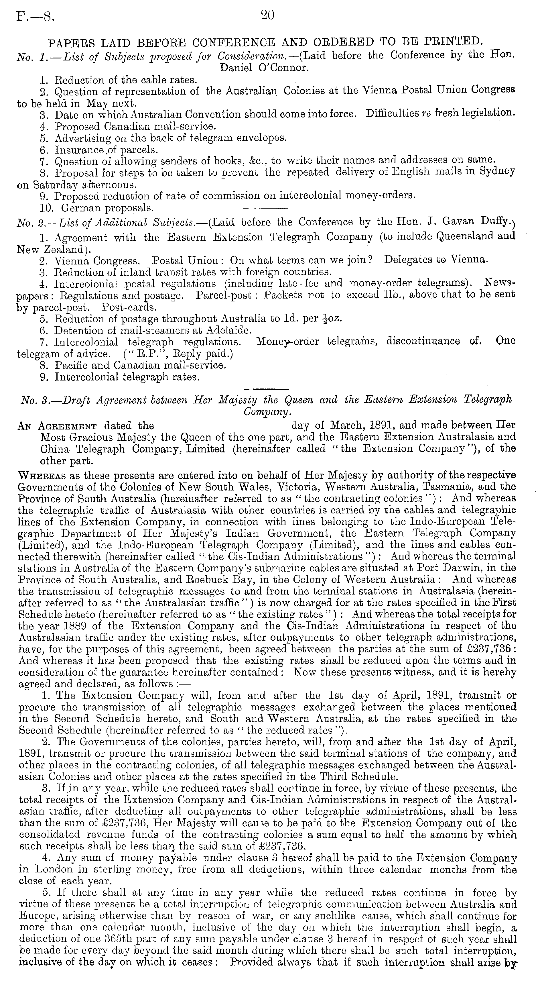 No. 2. — List of Additional Subjects. —(Laid before the Conference by the Hon. J. Gavan Duffy.-) 1. Agreement with the Eastern Extension Telegraph Company (to include Queensland and New Zealand). 2. Vienna Congress. Postal Union :On what terms can we join ? Delegates to Vienna. 3. Eeduction of inland transit rates with foreign countries. 4. Intercolonial postal regulations (including late-fee and money-order telegrams). Newspapers : Eegulations and postage. Parcel-post : Packets not to exceed lib., above that to be sent by parcel-post. Post-cards. 5. Eeduction of postage throughout Australia to Id. per 6. Detention of mail-steamers at Adelaide. 7. Intercolonial telegraph regulations. Money-order telegrams, discontinuance of, One telegram of advice. (" E.P.", Eeply paid.) 8. Pacific and Canadian mail-service. 9. Intercolonial telegraph rates.