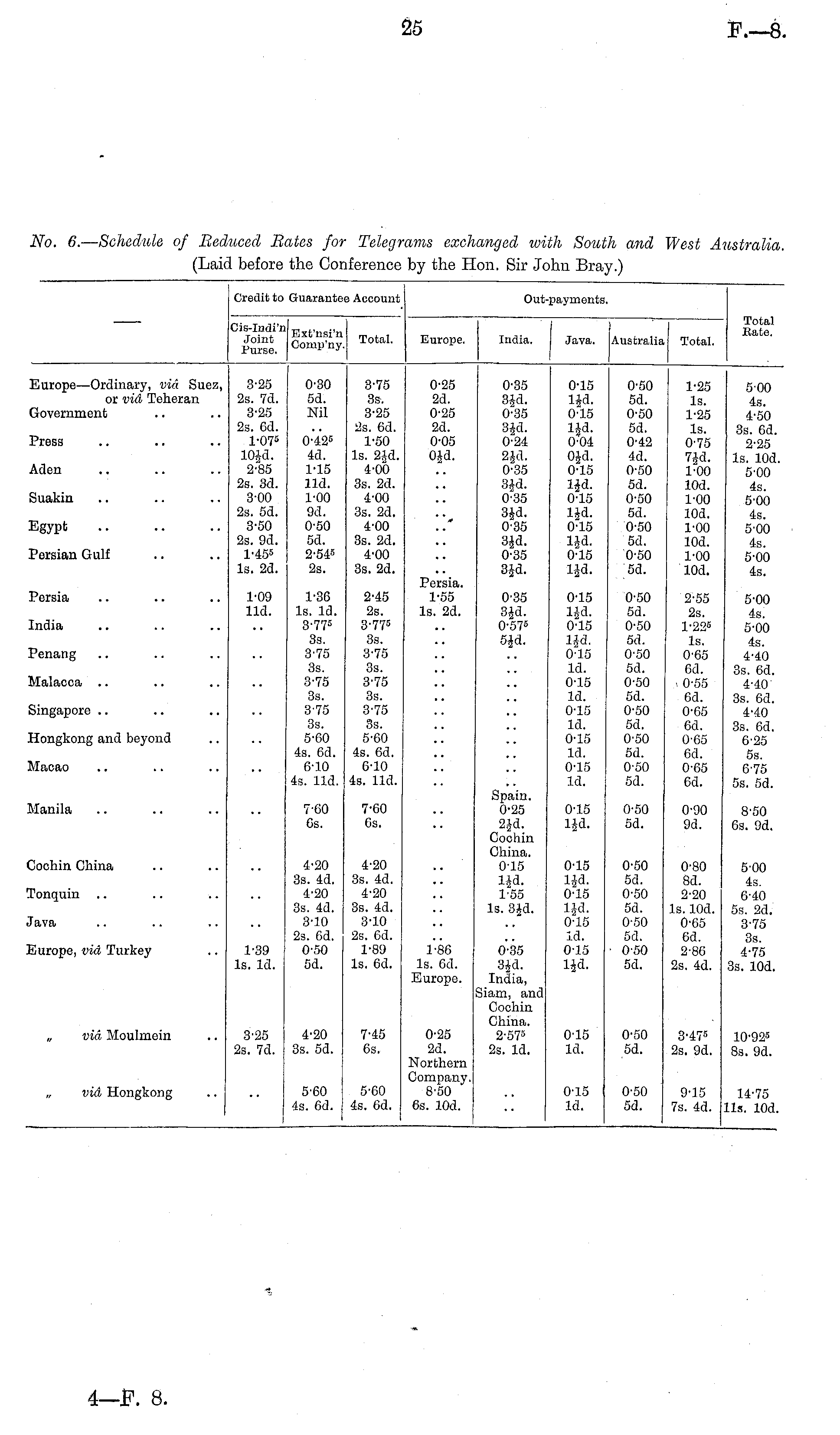 Credit to Guarantee Account Out-payments. Cis-Indi'n F _ t , n ..,,, Europe. India. Java. Australia Total. Total Bate. Europe—Ordinary, via Suez, or via Teheran Government Press Aden 3-25 2s. 7d. 3-25 2s. 6d. 1-07 5 10 Jd. 2-85 2s. 3d. 3-00 2s. 5d. 3-50 2s. 9d. 1'45 5 Is. 2d. O30 5d. Nil 0-42 5 4d. 1-13 lid. 1-00 9d. 0'50 5d. 2-54 5 2s. 3-75 3s. 3'25 2s. 6d. 1-50 Is. 2M. 4'00 3s. 2d. 4-00 3s. 2d. 4-00 3s. 2d. 4'00 3s. 2d. 0-25 2d. 0-25 2d. 0-05 OJd. 0-35 Sid. 0-35 3Jd. 0-24 2Jd. 0-35 3Jd. 0-35 3Jd. 0'35 3Jd. 0-35 3Jd. 0-15 IJd. 0-15 IJd. 0-04 Oid. 0-15 ljd. 0-15 ljd. 0-15 ljd. 0-15 lid. 0'50 5d. 0-50 5d. 0'42 4a. 0-50 6d. 0-50 5a. 0-50 5d. 0'50 5a. 1-26 Is. 1-25 Is. 075 7Jd. 1-00 ioa. 1-00 10d. 1-00 ioa. l-QO 10d. 500 4s. 4-50 3s. 6d. 2-25 Is. lOd. 5-00 4s. 5-00 4s. 5-00 4s. 5-00 4s. Suakin Egypt Persian Gulf Persia 1-09 lid. 1-36 Is. Id, 3-77 5 3s. 3-75 3s. 3-75 3s. 3'75 3s. 5-60 4s. 6d. 6-10 4s. lid. 2-45 2s. 3-77 5 3s. 3-75 3s. 3-75 3s. 3-75 3s. 5-60 4s. 6d. 6-10 4s. lid. Persia. 1-55 Is. 2d. 0'35 3id. 0-575 5^d. 0-15 lid. 0-15 lid. 0-15 Id. 0-15 Id. 0-15 Id. 0-15 Id. 0-15 Id. 0-50 5d. 0-50 5d. 0-50 5d. 0-50 5d. 0-50 5a. 0'50 5d. 0-50 5d. 2-55 2s. 1-22 5 Is. 0-65 6d. 0-55 6d. 0-65 6d. 0-65 6d. 0-65 6d. 5-00 4s. 5-00 4s. 4-40 3s. 6d. 4-40 3s. 6d. 4'40 3s. 6d. 6'25 5s. 675 5s. 5d. India Penang Malacca Singapore Hongkong and beyond Macao Manila Cochin China 7-GO Cs. 4-20 3s. 4d. 4-20 3s. 4d. 3-10 2s. Gd. 0-50 5d. 7'60 Cs. 4'20 3s. 4d. 4-20 3s. 4d. 3-10 2s. 6d. 1-8'J Is. 6d. Spain. 0-25 2Jd. Cochin China. 015 ljd. 1-65 Is. 3Jd. 0-15 lid. 0'15 lid. 0-15 lid. 0-15 Id. 0-15 lid. 0-50 5d. 0-50 5a. 0'50 5d. 0-50 5d. 0-50 5d. 0-90 9d. 0'80 8d. 2-20 Is. lOd. O65 6d. 2-86 2s. 4d. 8-50 6s. 9d. 5-00 4s. 6-40 5s. 2d. 3-75 3s. 4-75 3s. lOd. Tonquin Java Europe, vid Turkey 1-39 Is. Id. 1-86 Is. 6d. Europe. 0-35 3Jd. India, Siam, and Cochin China. 2'57 5 2s. Id. „ via Moulmein 0-25 2d. Northern Company. 8-50 6s. ioa. 3'47 5 2s. 9d. 10-92 5 8s. 9d. 3'25 2s. 7d. 4'20 3s. 5d. 7'45 6s. 0-15 Id. 0-50 5d. „ via Hongkong 5-60 4s. 6d. 5'60 4s. 6d. 0-15 Id. 0-50 5d. 9-15 7s. 4d. 14-75 11s. lOd.