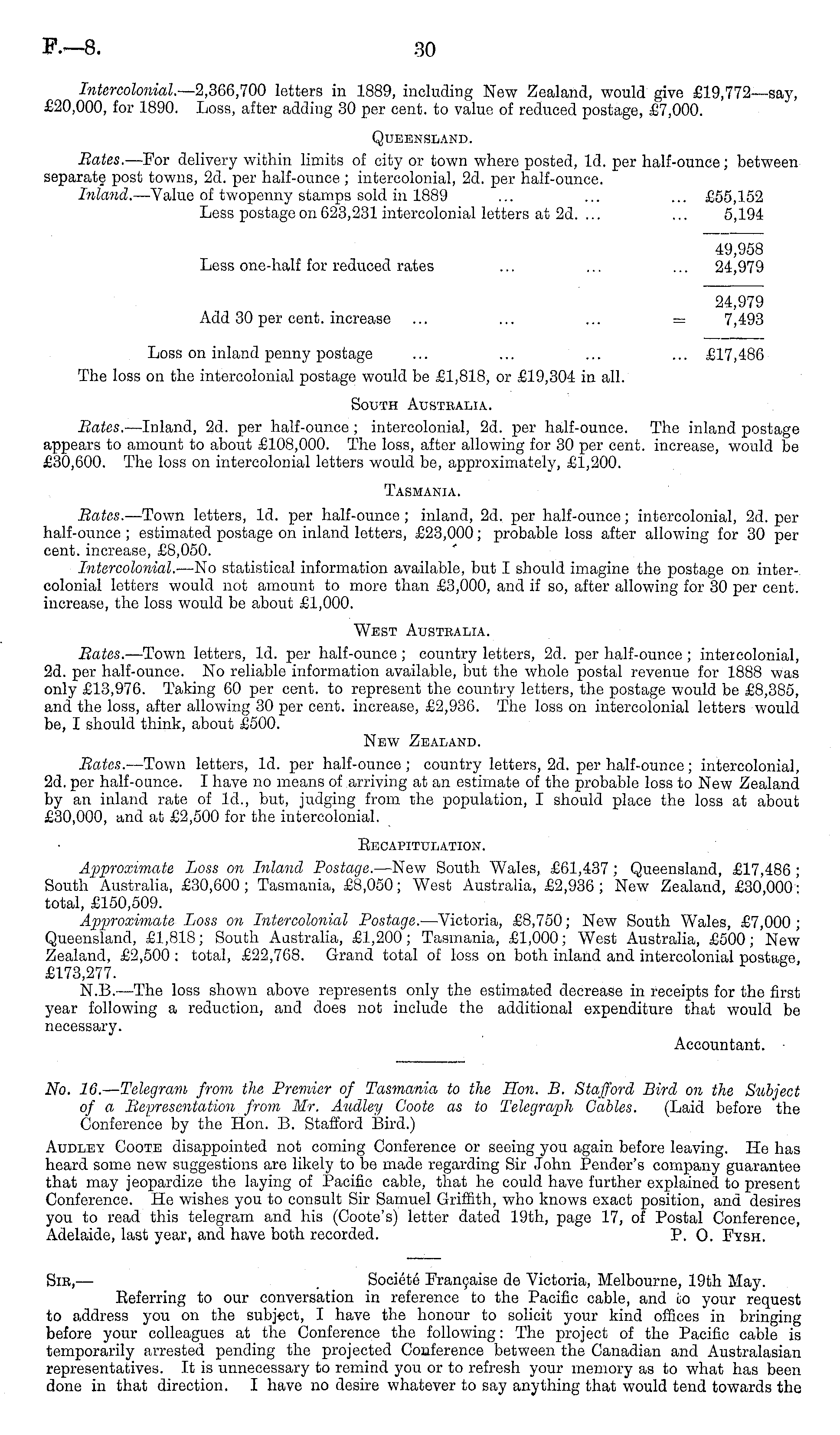 No. 16. — Telegram from the Premier of Tasmania to the Hon. B. Stafford Bird on the Subject of a lie-presentation from Mr. Audley Goote as to Telegraph Gables. (Laid before the Conference by the Hon. B. Stafford Bird.) Audley Coote disappointed not coming Conference or seeing you again before leaving. He has heard some new suggestions are likely to be made regarding Sir John Pender's company guarantee that may jeopardize the laying of Pacific cable, that he could have further explained to present Conference. He wishes you to consult Sir Samuel Griffith, who knows exact position, and desires you to read this telegram and his (Coote's) letter dated 19th, page 17, of Postal Conference, Adelaide, last year, and have both recorded. P. 0. Fysh.
