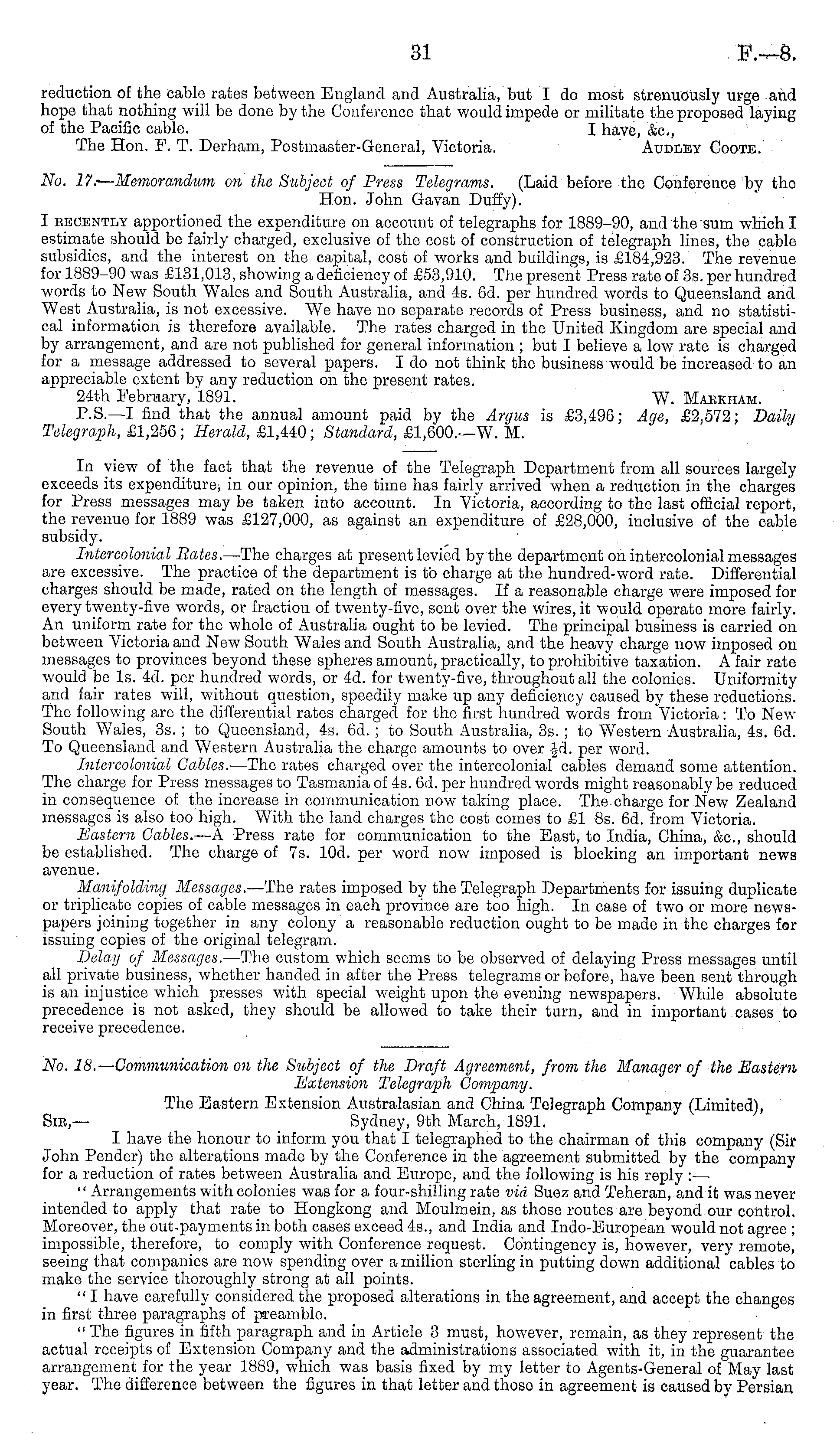 No. 18. — Communication on the Subject of the Draft Agreement, from the Manager of the Eastern Extension Telegraph Company. The Eastern Extension Australasian and China Telegraph Company (Limited), Sib,— Sydney, 9th March, 1891. I have the honour to inform you that I telegraphed to the chairman of this company (Sir John Pender) the alterations made by the Conference in the agreement submitted by the company for a reduction of rates between Australia and Europe, and the following is his reply :— " Arrangements with colonies was for a four-shilling rate via Suez and Teheran, and it was never intended to apply that rate to Hongkong and Moulmein, as those routes are beyond our control. Moreover, the out-payments in both cases exceed 45., and India and Indo-European would not agree ; impossible, therefore, to comply with Conference request. Contingency is, however, very remote, seeing that companies are now spending over a million sterling in putting down additional cables to make the service thoroughly strong at all points. " I have carefully considered the proposed alterations in the agreement, and accept the changes in first three paragraphs of preamble. " The figures in fifth paragraph and in Article 3 must, however, remain, as they represent the actual receipts of Extension Company and the administrations associated with it, in the guarantee arrangement for the year 1889, which was basis fixed by my letter to Agents-General of May last year. The difference between the figures in that letter and those in agreement is caused by Persian