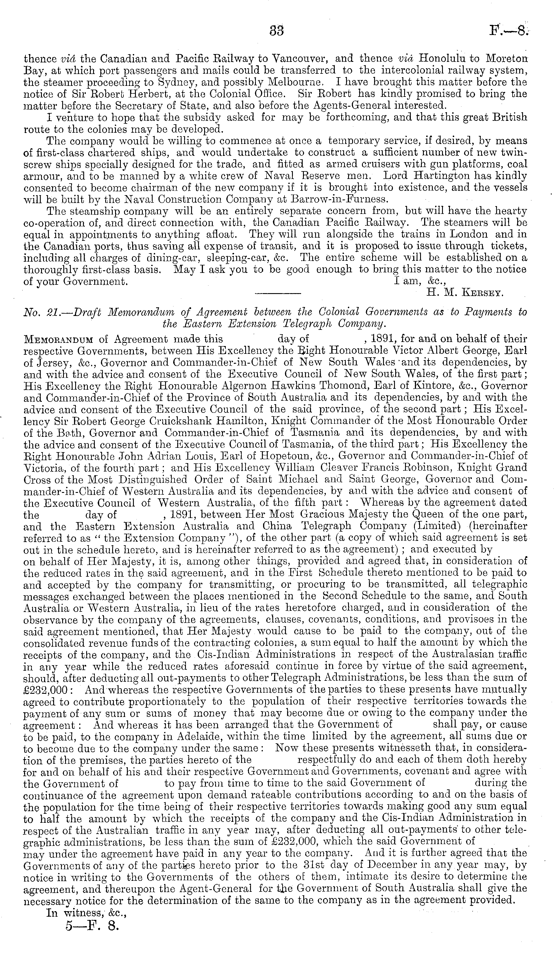 No. 21. — Draft Memorandum of Agreement between the Colonial Governments as to Payments to the Eastern Extension Telegraph Company. Memoeandum of Agreement made this day of , 1891, for and on behalf of their respective Governments, between His Excellency the Bight Honourable Victor Albert George, Earl of Jersey, &c, Governor and Commander-in-Chief of New South Wales and its dependencies, by and with the advice and consent of the Executive Council of New South Wales, of the first part; His Excellency the Eight Honourable Algernon Hawkins Thomond, Earl of Kintore, &c, Governor and Commander-in-Chief of the Province of South Australia and its dependencies, by and with the advice and consent of the Executive Council of the said province, of the second part ; His Excellency Sir Eobert George Cruickshank Hamilton, Knight Commander of the Most Honourable Order of the Bath, Governor and Commander-in-Chief of Tasmania and its dependencies, by and with the advice and consent of the Executive Council of Tasmania, of the third part; His Excellency the Eight Honourable John Adrian Louis, Earl of Hopetoun, &c, Governor and Commander-in-Chief of Victoria, of the fourth part; and His Excellency William Cleaver Francis Robinson, Knight Grand Cross of the Most Distinguished Order of Saint Michael and Saint George, Governor and Com-mander-in-Chief of Western Australia and its dependencies, by and with the advice and consent of the Executive Council of Western Australia, of the fifth part : Whereas by the agreement dated the day of , 1891, between Her Most Gracious Majesty the Queen of the one part, and the Eastern Extension Australia and China Telegraph Company (Limited) (hereinafter referred to as " the Extension Company "), of the other part (a copy of which said agreement is set out in the schedule hereto, and is hereinafter referred to as the agreement) ; and executed by on behalf of Her Majesty, it is, among other things, provided and agreed that, in consideration of the reduced rates in the said agreement, and in the First Schedule thereto mentioned to be paid to and accepted by the company for transmitting, or procuring to be transmitted, all telegraphic messages exchanged between the places mentioned in the Second Schedule to the same, and South Australia or Western Australia, in lieu of the rates heretofore charged, and in consideration of the observance by the company of the agreements, clauses, covenants, conditions, and provisoes in the said agreement mentioned, that Her Majesty would cause to be paid to the company, out of the consolidated revenue funds of the contracting colonies, a sum equal to half the amount by which the receipts of the company, and the Cis-Indian Administrations in respect of the Australasian traffic in any year while the reduced rates aforesaid continue in force by virtue of the said agreement, should, after deducting all out-payments to other Telegraph Administrations, be less than the sum of £232,000 : And whereas the respective Governments of the parties to these presents have mutually agreed to contribute proportionately to the population of their respective territories towards the payment of any sum or sums of money that may become due or owing to the company under the agreement : And whereas it has been arranged that the Government of shall pay, or cause to be paid, to the company in. Adelaide, within the time limited by the agreement, all sums due or to become due to the company under the same : Now these presents witnesseth that, in consideration of the premises, the parties hereto of the respectfully do and each of them doth hereby for and on behalf of his and their respective Government and Governments, covenant and agree with the Government of to pay from time to time to the said Government of during the continuance of the agreement upon demand rateable contributions according to and on the basis of the population for the time being of their respective territories towards making good any sum equal to half the amount by which the receipts of the company and the Cis-Indian Administration in respect of the Australian traffic in any year may, after deducting all out-payments' to other telegraphic administrations, be less than the sum of £232,000, which the said Government of may under the agreement have paid in any year to the company. And it is further agreed that the Governments of any of the parties hereto prior to the 31st day of December in any year may, by notice in writing to the Governments of the others of them, intimate its desire to determine the agreement, and thereupon the Agent-General for the Government of South Australia shall give the necessary notice for the determination of the same to the company as in the agreement provided. In witness, &c, 5—F. 8.