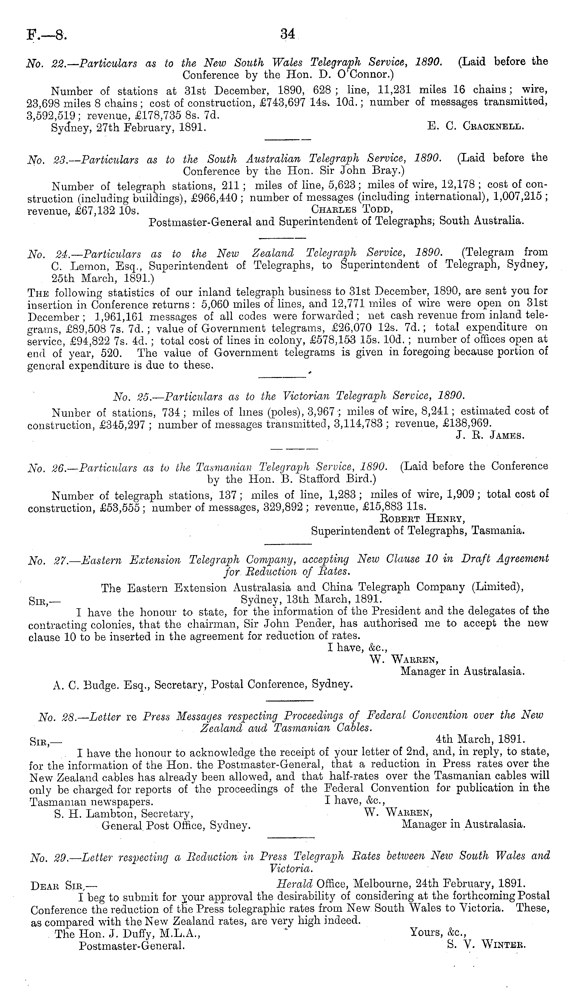 No. 26. — Particulars as to the Tasmanian Telegraph Service, 1890. (Laid before the Conference by the Hon. B. Stafford Bird.) Number of telegraph stations, 137; miles of line, 1,283 ; miles of wire, 1,909; total cost of construction, £53,555 ; number of messages, 329,892 ; revenue, £15,883 11s. Eobbet Heney, Superintendent of Telegraphs, Tasmania.