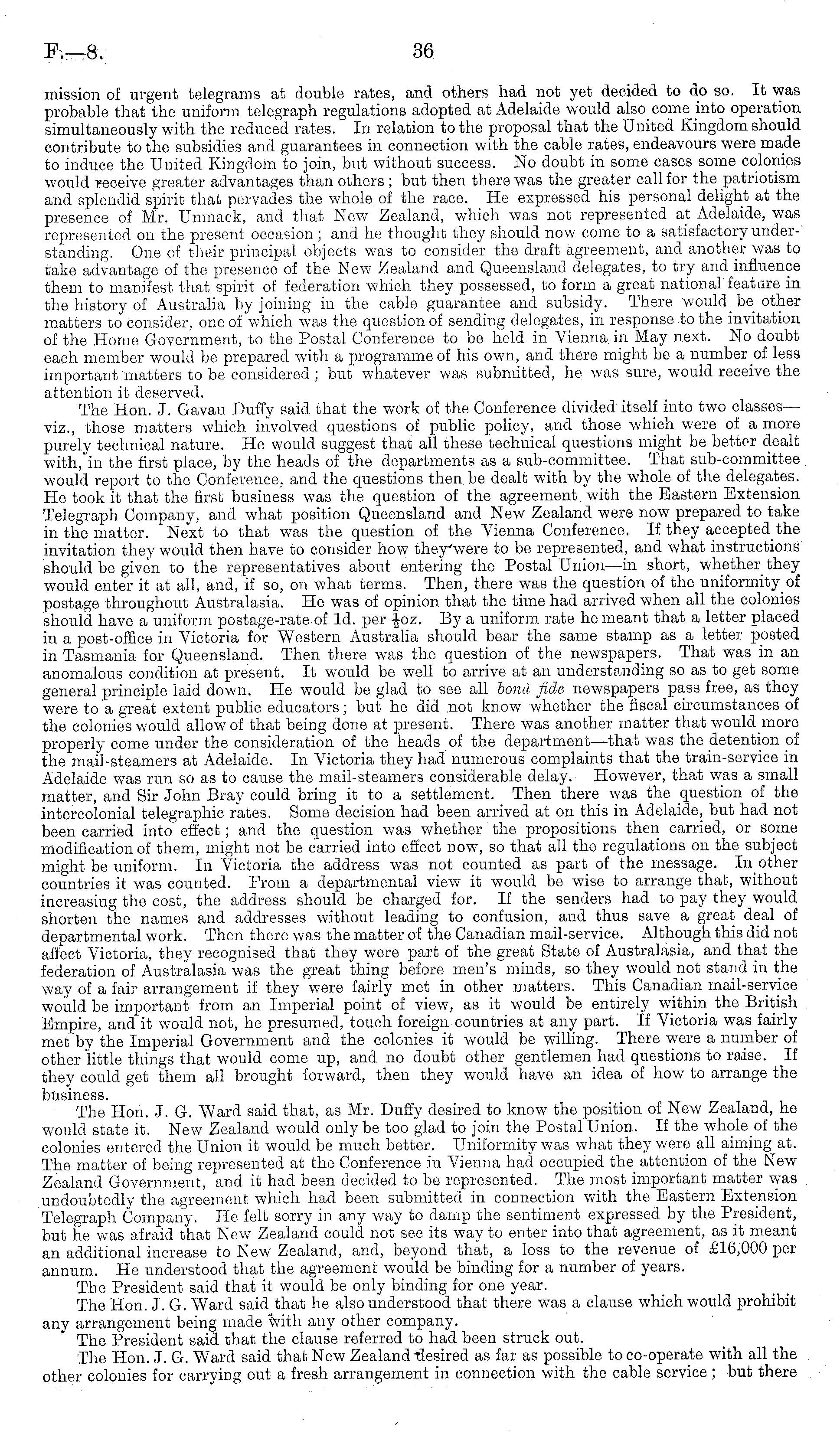 mission of urgent telegrams at double rates, and others had not yet decided to do so. It was probable that the uniform telegraph regulations adopted at Adelaide would also come into operation simultaneously with the reduced rates. In relation to the proposal that the United Kingdom should contribute to the subsidies and guarantees in connection with the cable rates, endeavours were made to induce the United Kingdom to join, but without success. No doubt in some cases some colonies would receive greater advantages than others ; but then there was the greater call for the patriotism and splendid spirit that pervades the whole of the race. He expressed his personal delight at the presence of Mr. Unmack, and that New Zealand, which was not represented at Adelaide, was represented on the present occasion ; and he thought they should now come to a satisfactory understanding. One of their principal objects was to consider the draft agreement, and another was to take advantage of the presence of the New Zealand and Queensland delegates, to try and influence them to manifest that spirit of federation which they possessed, to form a great national feature in the history of Australia'by joining in the cable guarantee and subsidy. There would be other matters to consider, one of which was the question of sending delegates, in response to the invitation of the Home Government, to the Postal Conference to be held in Vienna in May next. No doubt each member would be prepared with a programme of his own, and there might be a number of less important matters to be considered ; but whatever was submitted, he was sure, would receive the attention it deserved. The Hon. J. Gavan Duffy said that the work of the Conference divided itself into two classes — viz., those matters which involved questions of public policy, and those which were of a more purely technical nature. He would suggest that all these technical questions might be better dealt with, in the first place, by the heads of the departments as a sub-committee. That sub-committee would report to the Conference, and the questions then, be dealt with by the whole of the delegates. He took it that the first business was the question of the agreement with the Eastern Extension Telegraph Company, and what position Queensland and New Zealand were now prepared to take in the matter. Next to that was the question of the Vienna Conference. If they accepted the invitation they would then have to consider how they'were to be represented, and what instructions should be give"n to the representatives about entering the Postal Union —in short, whether they would enter it at all, and, if so, on what terms. Then, there was the question of the uniformityof postage throughout Australasia. He was of opinion that the time had arrived when all the colonies should have a uniform postage-rate of Id. per Joz. By a uniform rate he meant that a letter placed in a post-office in Victoria for Western Australia should bear the same stamp as a letter posted in Tasmania for Queensland. Then there was the question of the newspapers. That was in an anomalous condition at present. It would be well to arrive at an understanding so as to get some general principle laid down. He would be glad to see all bond fide newspapers pass free, as they were to a great extent public educators; but he did not know whether the fiscal circumstances of the colonies would allow of that being done at present. There was another matter that would more properly come under the consideration of the heads of the department —that was the detention of the mail-steamers at Adelaide. In Victoria they had numerous complaints that the train-service in Adelaide was run so as to cause the mail-steamers considerable delay. However, that was a small matter, and Sir John Bray could bring it to a settlement. Then there was the question of the intercolonial telegraphic rates. Some decision had been arrived at on this in Adelaide, but had not been carried into effect; and the question was whether the propositions then carried, or some modification of them, might not be carried into effect now, so that all the regulations on the subject might be uniform. In Victoria the address was not counted as part of the message. In other countries it was counted. From a departmental view it would be wise to arrange that, without increasing the cost, the address should be charged for. If the senders had to pay they would shorten the names and addresses without leading to confusion, and thus save a great deal of departmental work. Then there was the matter of the Canadian mail-service. Although this did not affect Victoria, they recognised that they were part of the great State o£ Australasia, and that the federation of Australasia was the great thing before men's minds, so they would not stand in the way of a fair arrangement if they were fairly met in other matters. This Canadian mail-service would be important from an Imperial point of view, as it would be entirely within the British Empire, and it would not, he presumed, touch foreign countries at any part. If Victoria was fairly met by the Imperial Government and the colonies it would be willing. There were a number of other little things that would, come up, and no doubt other gentlemen had questions to raise. If they could get them all brought forward, then they would have an idea of how to arrange the business. The Hon. J. G. Ward said that, as Mr. Duffy desired to know the position of New Zealand, he would state it. New Zealand would only be too glad to join the Postal Union. If the whole of the colonies entered the Union it would be much better. Uniformity was what they were all aiming at. The matter of being represented at the Conference in Vienna had occupied the attention o£ the New Zealand Government, and it had been decided to bo represented. The most important matter was undoubtedly the agreement which had been submitted in connection with the Eastern Extension T