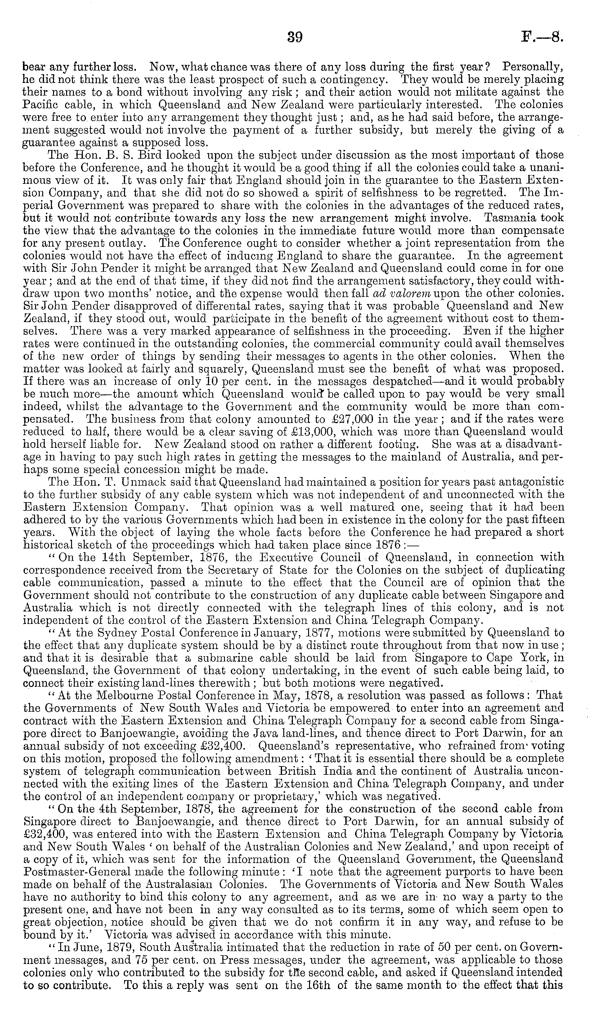 bear any further loss. Now, what chance was there of any loss during the first year? Personally, he did not think there was the least prospect of such a contingency. They would be merely placing their names to a bond without involving any risk ; and their action would not militate against the Pacific cable, in which Queensland and New Zealand were particularly interested. The colonies were free to enter into any arrangement they thought just; and, as he had said before, the arrangement suggested would not involve the payment of a further subsidy, but merely the giving of a guarantee against a supposed loss. The Hon. B. S. Bird looked upon the subject under discussion as the most important of those before the Conference, and he thought it would be a good thing if all the colonies could take a unanimous view of it. It was only fair that England should join in the guarantee to the Eastern Extension Company, and that she did not do so showed a spirit of selfishness to be regretted. The Imperial Government was prepared to share with the colonies in the advantages of the reduced rates, but it would not contribute towards any loss the new arrangement might involve. Tasmania took the view that the advantage to the colonies in the immediate future would more than compensate for any present outlay. The Conference ought to consider whether a joint representation from the colonies would not have the effect of inducing England to share the guarantee. In the agreement with Sir John Pender it might be arranged that New Zealand and Queensland could come in for one year; and at the end of that time, if they did not find the arrangement satisfactory, they could withdraw upon two months' notice, and the expense would then fall ad valorem upon the other colonies. Sir John Pender disapproved of differental rates, saying that it was probable Queensland and New Zealand, if they stood out, would participate in the benefit of the agreement without cost to themselves. There was a very marked appearance of selfishness in the proceeding. Even if the higher rates were continued in the outstanding colonies, the commercial community could avail themselves of the new order of things by sending their messages to agents in the other colonies. When the matter was looked at fairly and squarely, Queensland must see the benefit of what was proposed. If there was an increase of only 10 per cent, in the messages despatched—and it would probably be much more—the amount which Queensland would be called upon to pay would be very small indeed, whilst the advantage to the Government and the community would be more than compensated. The business from that colony amounted to £27,000 in the year ; and if the rates were reduced to half, there would be a clear saving of £13,000, which was more than Queensland would hold herself liable for. New Zealand stood on rather a different footing. She was at a disadvantage in having to pay such high rates in getting the messages to the mainland of Australia, and perhaps some special concession might be made. The Hon. T. Unmack said that Queensland had maintained a position for years past antagonistic to the further subsidy of any cable system which was not independent of and unconnected with the Eastern Extension Company. That opinion was a well matured one, seeing that it had been adhered to by the various Governments which had been in existence in the colony for the past fifteen years. With the object of laying the whole facts before the Conference he had prepared a short historical sketch of the proceedings which had taken place since 1876 : — " On the 14th September, 1876, the Executive Council of Queensland, in connection with correspondence received from the Secretary of State for the Colonies on the subject of duplicating cable communication, passed a minute to the effect that the Council are of opinion that the Government should not contribute to the construction of any duplicate cable between Singapore and Australia which is not directly connected with the telegraph lines of this colony, and is not independent of the control of the Eastern Extension and China Telegraph Company. "At the Sydney Postal Conference in January, 1877, motions were submitted by Queensland to the effect that any duplicate system should be by a distinct route throughout from that now in use; and that it is desirable that a submarine cable should be laid from Singapore to Cape York, in Queensland, the Government of that colony undertaking, in the event of such cable being laid, to connect their existing land-lines therewith; but both motions were negatived. "At the Melbourne Postal Conference in May, 1878, a resolution was passed as follows : That the Governments of New South Wales and Victoria be empowered to enter into an agreement and contract with the Eastern Extension and China Telegraph Company for a second cable from Singapore direct to Banjoewangie, avoiding the Java land-lines, and thence direct to Port Darwin, for an annual subsidy of not exceeding £32,400. Queensland's representative, who refrained from voting on this motion, proposed the following amendment: ' That it is essential there should be a complete system of telegraph communication between British India and the continent of Australia unconnected with the exiting lines of the Eastern Extension and China Telegraph Company, and under the control of an independent company or proprietary,' which was negatived. " On the 4th September, 1878, the agreement for the construction of the second cable from Singapore direct to Banjoewangie, and thence direct to Port Darwin, for an annual subsidy of £32,400, was entered into with the Eastern Extension and China Telegraph Company by Victoria and New South Wales ' on behalf of the Australian Colonies and New Zealand,' and upon receipt of a copy of it, wdiich was sent for the information of the Queensland Government, the Queensland Postmaster-General made the following minute : 'I note that the agreeme