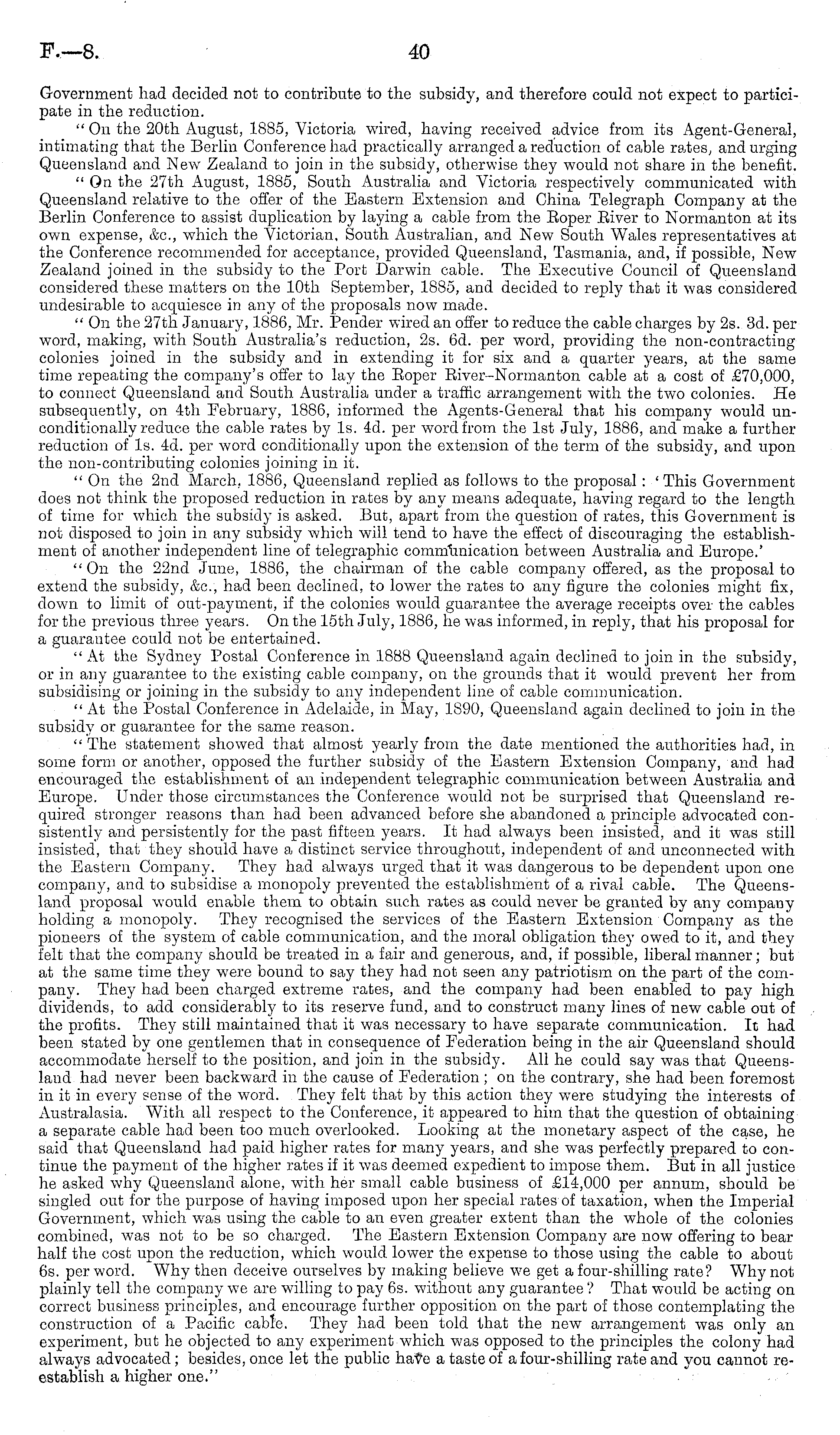 Government had decided not to contribute to the subsidy, and therefore could not expect to participate in the reduction. "On the 20th August, 1885, Victoria wired, having received advice from its Agent-General, intimating that the Berlin Conference had practically arranged a reduction of cable rates, and urging Queensland and New Zealand to join in the subsidy, otherwise they would not share in the benefit. " On the 27th August, 1885, South Australia and Victoria respectively communicated with Queensland relative to the offer of the Eastern Extension and China Telegraph Company at the Berlin Conference to assist duplication by laying a cable from the Roper River to Normanton at its own expense, &c, which the Victorian, South Australian, and New South Wales representatives at the Conference recommended for acceptance, provided Queensland, Tasmania, and, if possible, New Zealand joined in the subsidy to the Port Darwin cable. The Executive Council of Queensland considered these matters on the 10th September, 1885, and decided to reply that it was considered undesirable to acquiesce in any of the proposals now made. " On the 27th January, 1886, Mr. Pender wired an offer to reduce the cable charges by 2s. 3d. per word, making, with South Australia's reduction, 2s. 6d. per word, providing the non-contracting colonies joined in the subsidy and in extending it for six and a quarter years, at the same time repeating the company's offer to lay the Roper River-Normanton cable at a cost of £70,000, to connect Queensland and South Australia under a traffic arrangement with the two colonies. He subsequently, on 4th February, 1886, informed the Agents-General that his company would unconditionally reduce the cable rates by Is. 4d. per word from the Ist July, 1886, and make a further reduction of Is. 4d. per word conditionally upon the extension of the term of the subsidy, and upon the non-contributing colonies joining in it. " On the 2nd March, 1886, Queensland replied as follows to the proposal : 'This Government does not think the proposed reduction in rates by any means adequate, having regard to the length of time for which the subsidy is asked. But, apart from the question of rates, this Government is not disposed to join in any subsidy which will tend to have the effect of discouraging the establishment of another independent line of telegraphic communication between Australia and Europe.' "On the 22nd June, 1886, the chairman of the cable company offered, as the proposal to extend the subsidy, &c, had been declined, to lower the rates to any figure the colonies might fix, clown to limit of out-payinent, if the colonies would guarantee the average receipts over the cables for the previous three years. On the 15th July, 1886, he was informed, in reply, that his proposal for a guarantee could not be entertained. " At the Sydney Postal Conference in 1888 Queensland again declined to join in the subsidy, or in any guarantee to the existing cable company, on the grounds that it would prevent her from subsidising or joining in the subsidy to any independent line of cable communication. " At the Postal Conference in Adelaide, in May, 1890, Queensland again declined to join in the subsidy or guarantee for the same reason. "The statement showed that almost yearly from the date mentioned the authorities had, in some form or another, opposed the further subsidy of the Eastern Extension Company, and had encouraged the establishment of an independent telegraphic communication between Australia and Europe. Under those circumstances the Conference would not be surprised that Queensland required stronger reasons than had been advanced before she abandoned a principle advocated consistently and persistently for the past fifteen years. It had always been insisted, and it was still insisted, that they should have a distinct service throughout, independent of and unconnected with the Eastern Company. They had always urged that it was dangerous to be dependent upon one company, and to subsidise a monopoly prevented the establishment of a rival cable. The Queensland proposal would enable them to obtain such rates as could never be granted by any company holding a monopoly. They recognised the services of the Eastern Extension Company as the pioneers of the system of cable communication, and the moral obligation they owed to it, and they felt that the company should be treated in a fair and generous, and, if possible, liberal manner; but at the same time they were bound to say they had not seen any patriotism on the part of the company. They had been charged extreme rates, and the company had been enabled to pay high dividends, to add considerably to its reserve fund, and to construct many lines of new cable out of the profits. They still maintained that it was necessary to have separate communication. It had been stated by one gentlemen that in consequence of Federation being in the air Queensland should accommodate herself to the position, and join in the subsidy. All he could say was that Queensland had never been backward in the cause of Federation; on the contrary, she had been foremost in it in every sense of the word. They felt that by this action they were studying the interests of Australasia. With all respect to the Conference, it appeared to him that the question of obtaining a separate cable had been too much overlooked. Looking at the monetary aspect of the case, he said that Queensland had paid higher rates for many years, and she was perfectly prepared to continue the payment of the higher rates if it was deemed expedient to impose them. But in all justice he asked why Queensland alone, with her small cable business of £14,000 per annum, should be singled out for the purpose of having imposed upon her special rates of taxation, when the Imperial Government, which was using the cable to an even greater extent than the whole of the colonies combined, was not to be so charged. The Eastern Extension Compa