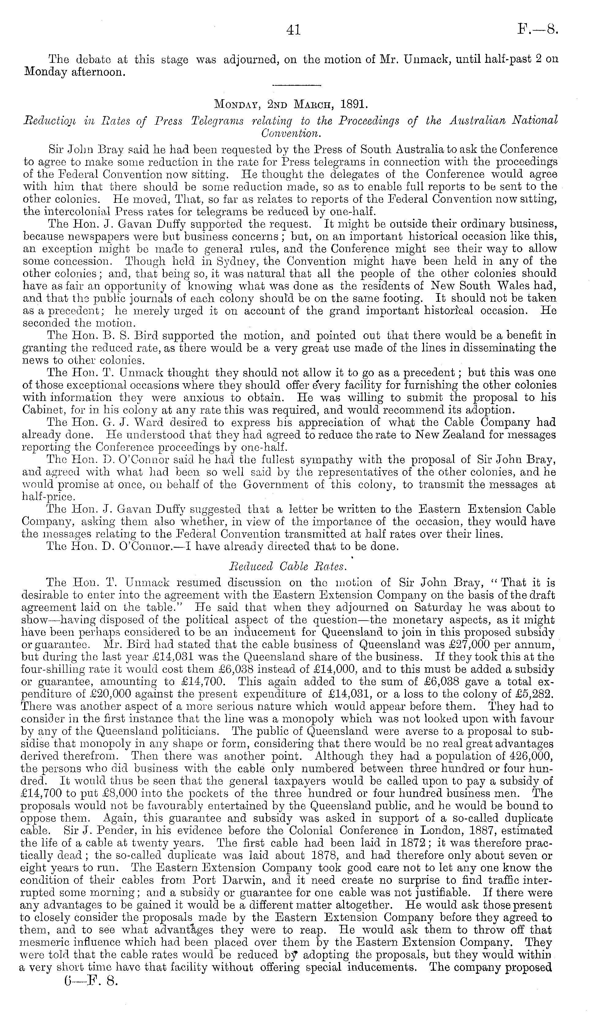 Monday, 2nd March, 1891. Reductioji in Rates of Press Telegrams relating to the Proceedings of the Australian National Convention. Sir John Bray said he had been requested by the Press of South Australia to ask the Conference to agree to make some reduction in the rate for Press telegrams in connection with the proceedings of the Federal Convention now sitting. He thought the delegates of the Conference would agree with him that there should be some reduction made, so as to enable full reports to be sent to the other colonies. He moved, That, so far as relates to reports of the Federal Convention now sitting, the intercolonial Press rates for telegrams be reduced by one-half. The Hon. J. Gavan Duffy supported the request. It might be outside their ordinary business, because newspapers were but business concerns ; but, on an important historical occasion like this, an exception might be made to general rules, and the Conference might see their way to allow some concession. Though held in Sydney, the Convention might have been held in any of the other colonies; and, that being so, it was natural that all the people of the other colonies should have as fair an opportunity of knowing what was done as the residents of New South Wales had, and that the public journals of each colony should be on the same footing. It should not be taken as a precedent; he merely urged it on account of the grand important historical occasion. He seconded the motion. The Hon. B. S. Bird supported the motion, and pointed out that there would be a benefit in granting the reduced rate, as there would be a very great use made of the lines in disseminating the news to other colonies. The Hon. T. CJnmack thought they should not allow it to go as a precedent; but this was one of those exceptional occasions where they should offer every facility for furnishing the other colonies with information they were anxious to obtain. He was willing to submit the proposal to his Cabinet, for in his colony at any rate this was required, and would recommend its adoption. The Hon. G. J. Ward desired to express bis appreciation of what the Cable Company had already done. He understood that they had agreed to reduce the rate to New Zealand for messages reporting the Conference proceedings by one-half. The Hon. D. O'Connor said he had the fullest sympathy with the proposal of Sir John Bray, and agreed with what had been so well said by the representatives of the other colonies, and he would promise at once, on behalf of the Government of this colony, to transmit the messages at half-price. The Hon. J. Gavan Duffy suggested that a letter be written to the Eastern Extension Cable Company, asking them also whether, in view of the importance of the occasion, they would have the messages relating to the Federal Convention transmitted at half rates over their lines. The Hon. D. O'Connor.—l have already directed that to be done. Reduced Cable Rates. The Hon. T. Unmack resumed discussion on the motion of Sir John Bray, " That it is desirable to enter into the agreement with the Eastern Extension Company on the basis of the draft agreement laid on the table." He said that when they adjourned on Saturday he was about to show—having disposed of the political aspect of the question —the monetary aspects, as it might have been perhaps considered to be an inducement for Queensland to join in this proposed subsidy or guarantee. Mr. Bird had stated that the cable business of Queensland was £27,000 per annum, but during the last year £14,031 was the Queensland share of the business. If they took this at the four-shilling rate it would cost them £6,038 instead of £14,000, and to this must be added a subsidy or guarantee, amounting to £14,700. This again added to the sum of £6,038 gave a total expenditure of £20,000 against the present expenditure of £14,031, or a loss to the colony of £5,282. There was another aspect of a more serious nature which would appear before them. They had to consider in the first instance that the line was a monopoly which was not looked upon with favour by any of the Queensland politicians. The public of Queensland were averse to a proposal to subsidise that monopoly in any shape or form, considering that there would bo no real great advantages derived therefrom. Then there was another point. Although they had a population of 426,000, the persons who did business with the cable only numbered between three hundred or four hundred. It would thus be seen that the general taxpayers would be called upon to pay a subsidy of £14,700 to put £8,000 into the pockets of the three hundred or four hundred business men. The proposals would not be favourably entertained by the Queensland public, and he would be bound to oppose them. Again, this guarantee and subsidy was asked in support of a so-called duplicate cable. Sir J. Pender, in his evidence before the Colonial Conference in London, 1887, estimated the life of a cable at twenty years. The first cable had been laid in 1872 ;it was therefore practically dead; the so-called duplicate was laid about 1878, and had therefore only about seven or eight years to run. The Eastern Extension Company took good care not to let any one know the condition of their cables from Port Darwin, and it need create no surprise to find traffic interrupted some morning; and a subsidy or guarantee for one cable was not justifiable. If there were any advantages to be gained it would, be a different matter altogether. He would ask those present to closely consider the proposals made by the Eastern Extension Company before they agreed to them, and to see what advantages they were to reap. He would ask them to throw off that mesmeric influence which had been placed over them by the Eastern Extension Company. They were told that the cable rates would be reduced by* adopting the proposals, but they would within a very short time have that facility without offering special inducements. The company prop