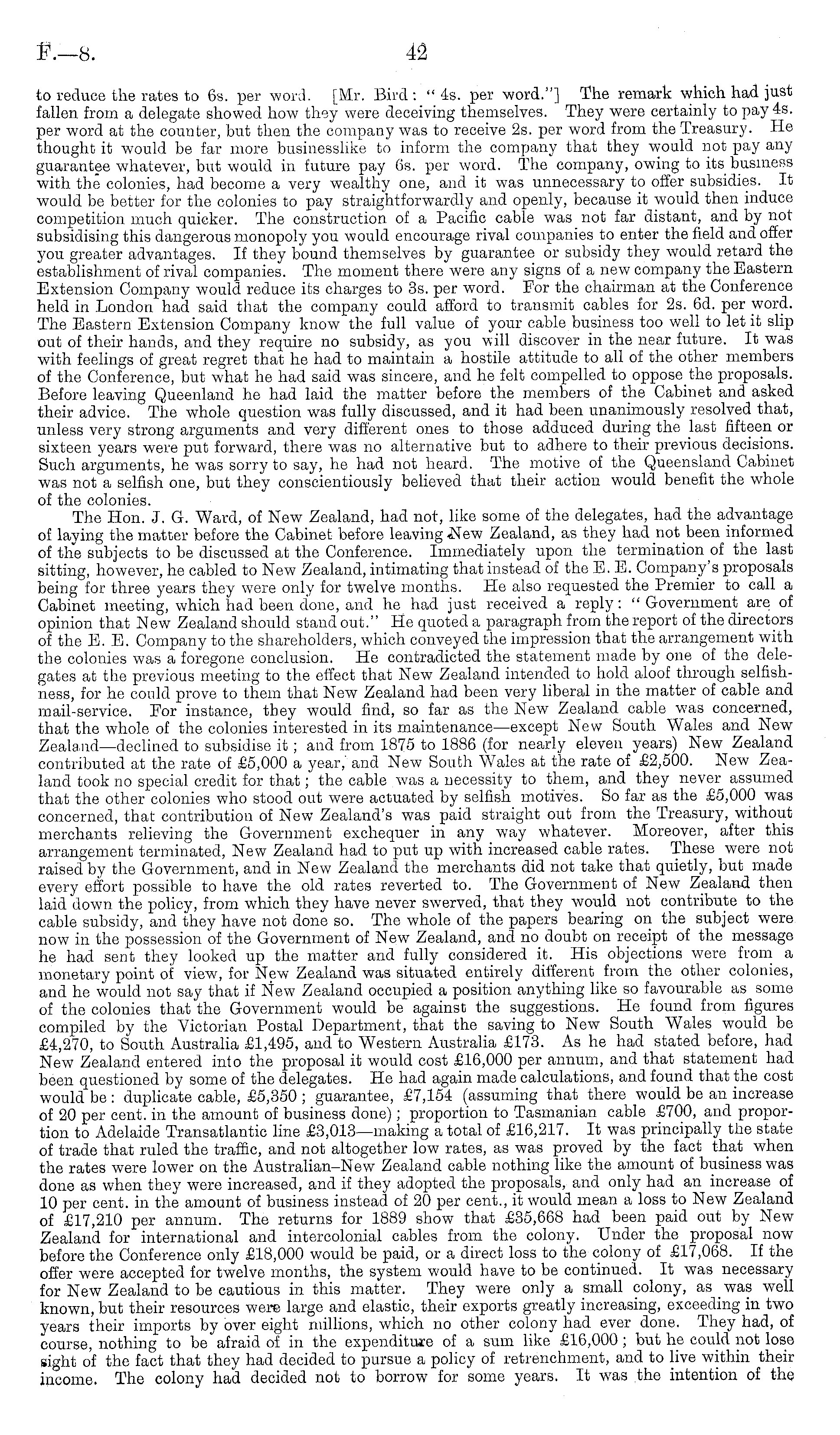 to reduce the rates to 6s. per word. [Mr. Bird: "4s. per word."] The remark which had just fallen from a delegate showed how they were deceiving themselves. They were certainly to pay 4s. per word at the counter, but then the company was to receive 2s. per word from the Treasury. He thought it would be far more businesslike to inform the company that they would not pay any guarantee whatever, but would in future pay 6s. per word. The company, owing to its business with the colonies, had become a very wealthy one, and it was unnecessary to offer subsidies. It would be better for the colonies to pay straightforwardly and openly, because it would then induce competition much quicker. The construction of a Pacific cable was not far distant, and by not subsidising this dangerous monopoly you would encourage rival companies to enter the field and offer you greater advantages. If they bound themselves by guarantee or subsidy they would retard the establishment of rival companies. The moment there were any signs of a new company the Eastern Extension Company would reduce its charges to 3s. per word. For the chairman at the Conference held in London had said that the company could afford to transmit cables for 2s. 6d. per word. The Eastern Extension Company know the full value of your cable business too well to let it slip out of their hands, and they require no subsidy, as you will discover in the near future. It was with feelings of great regret that he had to maintain a hostile attitude to all of the other members of the Conference, but what he had said was sincere, and he felt compelled to opposethe proposals. Before leaving Queenland he had laid the matter before the members of the Cabinet and asked their advice. The whole question was fully discussed, and it had been unanimously resolved that, unless very strong arguments and very different ones to those adduced during the last fifteen or sixteen years were put forward, there was no alternative but to adhere to their previous decisions. Such arguments, he was sorry to say, he had not heard. The motive of the Queensland Cabinet was not a selfish one, but they conscientiously believed that their action would benefit the whole of the colonies. The Hon. J. G. Ward, of New Zealand, had not, like some of the delegates, had the advantage of laying the matter before the Cabinet before leaving<New Zealand, as they had not been informed of the subjects to be discussed at the Conference. Immediately upon the termination of the last sitting, however, he cabled to New Zealand, intimating that instead of the E. E. Company's proposals being for three years they were only for twelve months. He also requested the Premier to call a Cabinet meeting, which had been clone, and he had just received a reply: " Government are of opinion that New Zealand should stand out." He quoted a paragraph from the report of the directors of the E. E. Company to the shareholders, which conveyed the impression that the arrangement with the colonies was a foregone conclusion. He contradicted the statement made by one of the delegates at the previous meeting to the effect that New Zealand intended to hold aloof through selfishness, for he could prove to them that New Zealand had been very liberal in the matter of cable and mail-service. For instance, they would find, so far as the Now Zealand cable was concerned, that the whole of the colonies interested in its maintenance—except New South Wales and NewZealand—declined to subsidise it ; and from 1875 to 1886 (for nearly eleven years) New Zealand contributed at the rate of £5,000 a year,' and New South Wales at the rate of £2,500. New Zealand took no special credit for that; the cable was a necessity to them, and they never assumed that the other colonies who stood out were actuated by selfish motives. So far as the £5,000 was concerned, that contribution of New Zealand's was paid straight out from the Treasury, without merchants relieving the Government exchequer in any way whatever. Moreover, after this arrangement terminated, New Zealand had to put up with increased cable rates. These were not raised by the Government, and in New Zealand the merchants did not take that quietly, but made every effort possible to have the old rates reverted to. The Government of New Zealand then laid down the policy, from which they have never swerved, that they would not contribute to the cable subsidy, and they have not done so. The whole of the papers bearing on the subject were now in the possession of the Government of New Zealand, and no doubt on receipt of the message he had sent they looked up the matter and fully considered it. His objections were from a monetary point of view, for New Zealand was situated entirely different from the other colonies, and he would not say that if New Zealand occupied a position anything like so favourable as some of the colonies that the Government would be against the suggestions. He found from figures compiled by the Victorian Postal Department, that the saving to New South Wales would be £4,270, to South Australia £1,495, and to Western Australia £173. As he had stated before, had New Zealand entered into the proposal it would cost £16,000 per annum, and that statement had been questioned by some of the delegates. He had again made calculations, and found that the cost would be : duplicate cable, £5,350 ; guarantee, £7,154 (assuming that there would be an increase of 20 per cent, in the amount of business done); proportion to Tasmanian cable £700, and proportion to Adelaide Transatlantic line £3,ol3—making a total of £16,217. It was principally the state of trade that ruled the traffic, and not altogether low rates, as was proved by the fact that when the rates were lower on the Australian-New Zealand cable nothing like the amount of business was done as when they were increased, and if they adopted the proposals, and only had an increase of 10 per cent, in the amount of business inste
