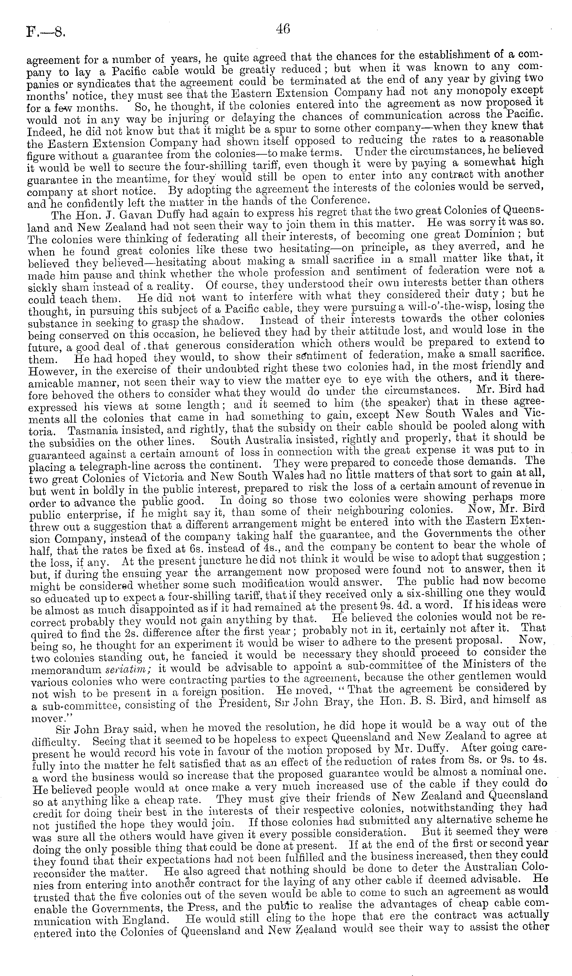 agreement for a number of years, he quite agreed that the chances for the establishment of a company to lay a Pacific cable would be greatly reduced; but when it was known to any companies or syndicates that the agreement could be terminated at the end of any year by giving two months' notice, they must see that the Eastern Extension Company had not any monopoly except for a few months. So, he thought, if the colonies entered into the agreement as now proposed it would not in any way be injuring or delaying the chances of communication across the 1 aciiie Indeed he did not know but that it might be a spur to some other company—when they knew that the Eastern Extension Company had shown itself opposed to reducing the rates to a reasonable figure without a guarantee from the colonies—to make terms. Under the circumstances, he believed it would be well to secure the four-shilling tariff, even though it were by paying a somewhat high guarantee in the meantime, for they would still be open to enter into any contract with another company at short notice. By adopting the agreement the interests of the colonies would be served, and he confidently left the matter in the hands of the Conference. The Hon J Gavaii Duffy had again to express his regret that the two great Colonies of Queensland and New Zealand had not seen their way to join them in this matter. He was sorry it was so The colonies were thinking of federating all their interests, of becoming one great Dominion ; but when he found great colonies like these two hesitating—on principle, as they averred, and he believed they believed—hesitating about making a small sacrifice in a small matter like that, it made him pause and think whether the whole profession and sentiment of federation were not a sickly sham instead of a reality. Of course, they understood their own interests better than others could teach them. He did not want to interfere with what they considered their duty ; but he thought in pursuing this subject of a Pacific cable, they were pursuing a will-o -the-wisp, losing the substance in seeking to grasp the shadow. Instead of their interests towards the other colonies beino- conserved on this occasion, he believed they had by their attitude lost, and would lose in the future a good deal of .that generous consideration which others would be prepared to extend to them ' He had hoped they would, to show their sentiment of federation, make a small sacrifice However in the exercise of their undoubted right these two colonies had, m the most friendly and amicable'manner, not seen their way to view the matter eye to eye with the others, and it therefore behoved the others to consider what they would do under the circumstances. _ Mr. Bird had expressed his views at some length; and it seemed to him (the speaker) that in these agreements all the colonies that came in had something to gain, except New South Wales and Victoria. Tasmania insisted, and rightly, that the subsidy on their cable should be pooled along with the subsidies on the other lines. South Australia insisted, rightly and properly, that it should be guaranteed against a certain amount of loss in connection with the great expense it was put to in placin" a telegraph-line across the continent. They were prepared to concede those demands. Ihe two Treat Colonies of Victoria and New South Wales had no little matters of that sort to gam at all, but went in boldly in the public interest, prepared to risk the loss of a certain amount of revenue in order to advance the public good. In doing so those two colonies were showing perhaps more public enterprise, if he might say it, than some of their neighbouring colonies Now, Mr. Bird threw out a suggestion that a different arrangement might be entered into with the Eastern Extension Company, instead of the company taking half the guarantee, and the Governments the other half that the rates be fixed at 6s. instead of 45., and the company be content to bear the whole ot the loss if any At the present juncture he did not think it would be wise to adopt that suggestion; but if during the ensuing year the arrangement now proposed were found not to answer then it might be considered whether some such modification would answer. The public had now become so educated up to expect a four-shilling tariff, that if they received only a six-shilling one they would be almost as much disappointed as if it had remained at the present 9s. 4d. a word. If his ideas were correct probably they would not gain anything by that. He believed the colonies would not be required to find the 2s. difference after the first year ; probably not in it, certainly not after it. lhat being so he thought for an experiment it would be wiser to adhere to the present proposal. _ Now, two colonies standing out, he fancied it would be necessary they should proceed to consider he memorandum seriatim; it would be advisable to appoint a sub-committee of the Ministers of the various colonies who were contracting parties to the agreement, because the other gentlemen would not wish to be present in a foreign position. He moved, « That the agreement be considered by a sub-committee, consisting of the President, Sir John Bray, the Hon. B. S. Bird, and himself as >V6Sir John Bray said, when he moved the resolution, he did hope it would be a way out of the difficulty. Seeing that it seemed to be hopeless to expect Queensland and New Zealand to agree at present he would record his vote in favour of the motion proposed by Mr. Duffy. After going carefully into the matter he felt satisfied that as an effect of the reduction of rates from Bs. or 9s. to 4s. a word the business would so increase that the proposed guarantee would be almost a nomma one. He believed people would at once make a very much increased use of the cable if they could do so at anything like a cheap rate. They must give their friends of New Zealand and Queensland credit for doing their best in the interests of t
