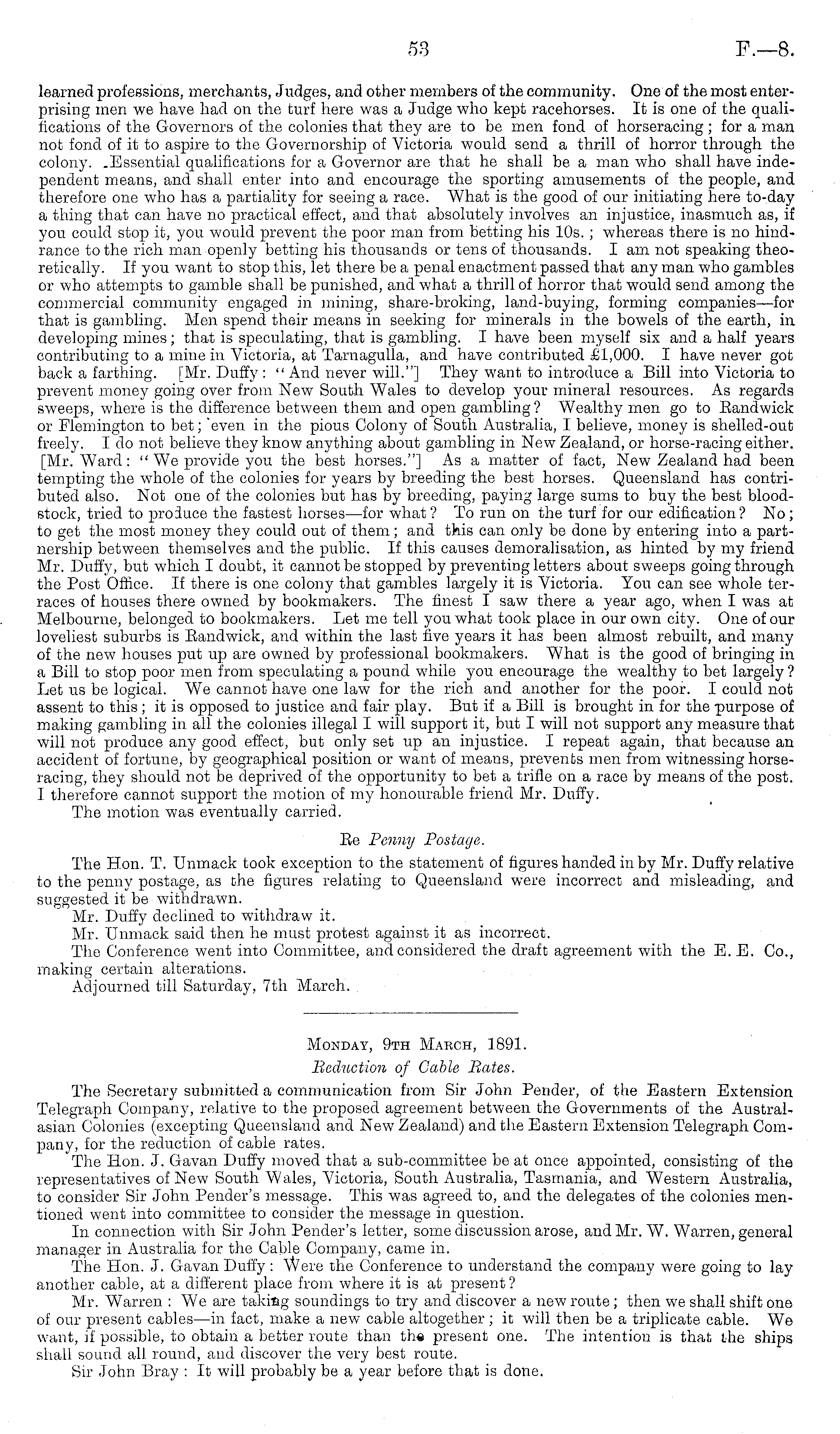 learned professions, merchants, Judges, and other members of the community. One of the most enterprising men we have had on the turf here was a Judge who kept racehorses. It is one of the qualifications of the Governors of the colonies that they are to be men fond of horseracing ; for a man not fond of it to aspire to the Governorship of Victoria would send a thrill of horror through the colony. .Essential qualifications for a Governor are that he shall be a man who shall have independent means, and shall enter into and encourage the sporting amusements of the people, and therefore one who has a partiality for seeing a race. What is the good of our initiating here to-day a thing that can have no practical effect, and that absolutely involves an injustice, inasmuch as, if you could stop it, you would prevent the poor man from betting his 10s. ; whereas there is no hindrance to the rich man openly betting his thousands or tens of thousands. I am not speaking theoretically. If you want to stop this, let there be a penal enactment passed that any man who gambles or who attempts to gamble shall be punished, and what a thrill of horror that would send among the commercial community engaged in mining, share-broking, land-buying, forming companies—for that is gambling. Men spend their means in seeking for minerals in the bowels of the earth, in developing mines; that is speculating, that is gambling. I have been myself six and a half years contributing to a mine in Victoria, at Tarnagulla, and have contributed £1,000. I have never got back a farthing. [Mr. Duffy : " And never will."] They want to introduce a Bill into Victoria to prevent money going over from New South Wales to develop your mineral resources. As regards sweeps, where is the difference between them and open gambling ? Wealthy men go to Eandwick or Elemington to bet; "even in the pious Colony of South Australia, I believe, money is shelled-out freely. Ido not believe they know anything about gambling in New Zealand, or horse-racing either. [Mr. Ward: "We provide you the best horses."] As a matter of fact, New Zealand had been tempting the whole of the colonies for years by breeding the best horses. Queensland has contributed also. Not one of the colonies but has by breeding, paying large sums to buy the best bloodstock, tried to proiuce the fastest horses—for what? To run on the turf for our edification? No; to get the most money they could out of them; and this can only be done by entering into a partnership between themselves and the public. If this causes demoralisation, as hinted by my friend Mr. Duffy, but which I doubt, it cannot be stopped by preventing letters about sweeps going through the Post Office. If there is one colony that gambles largely it is Victoria. You can see whole terraces of houses there owned by bookmakers. The finest I saw there a year ago, when I was at Melbourne, belonged to bookmakers. Let me tell you what took place in our own city. One of our loveliest suburbs is Randwick, and within the last five years it has been almost rebuilt, and many of the new houses put up are owned by professional bookmakers. What is the good of bringing in a Bill to stop poor men from speculating a pound while you encourage the wealthy to bet largely ? Let us be logical. We cannot have one law for the rich and another for the poor. I could not assent to this ;it is opposed to justice and fair play. But if a Bill is brought in for the purpose of making gambling in all the colonies illegal I will support it, but I will not support any measure that will not produce any good effect, but only set up an injustice. I repeat again, that because an accident of fortune, by geographical position or want of means, prevents men from witnessing horseracing, they should not be deprived of the opportunity to bet a trifle on a race by means of the post. I therefore cannot support the motion of my honourable friend Mr. Duffy. The motion was eventually carried. Ec Penny Postage. The Hon. T. Unmack took exception to the statement of figures handed in by Mr. Duffy relative to the penny postage, as the figures relating to Queensland were incorrect and misleading, and suggested it be withdrawn. Mr. Duffy declined to withdraw it. Mr. Unmack said then he must protest against it as incorrect. The Conference went into Committee, and considered the draft agreement with the E. E. Co., making certain alterations. Adjourned till Saturday, 7th March.