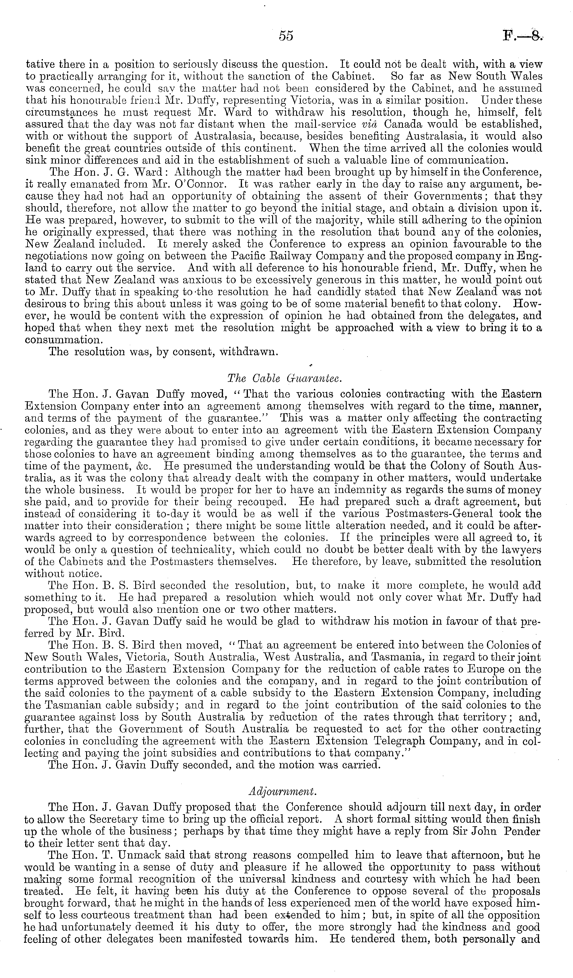 tative there in a position to seriously discuss the question. It could not be dealt with, with a view to practically arranging for it, without the sanction of the Cabinet. So far as New South Wales was concerned, he could say the matter had not been considered by the Cabinet, and he assumed that his honourable friend Mr. Daffy, representing Victoria, was in a similar position. Under these circumstances he must request Mr. Ward to withdraw his resolution, though he, himself, felt assured that the day was not far distant when the mail-service via Canada would be established, with or without the support of Australasia, because, besides benefiting Australasia, it would also benefit the great countries outside of this continent. When the time arrived all the colonies would sink minor differences and aid in the establishment of such a valuable line of communication. The Hon. J. G. Ward : Although the matter had been brought up by himself in the Conference, it really emanated from Mr. O'Connor. It was rather early in the day to raise any argument, because they had not had an opportunity of obtaining the assent of their Governments; that they should, therefore, not allow the matter to go beyond the initial stage, and obtain a division upon it. He was prepared, however, to submit to the will of the majority, while still adhering to the opinion he originally expressed, that there was nothing in the resolution that bound any of the colonies, New Zealand included. It merely asked the Conference to express an opinion favourable to the negotiations now going on between the Pacific Railway Company and the proposed company in England to carry out the service. And with all deference to his honourable friend, Mr. Duffy, when he stated that New Zealand was anxious to be excessively generous in this matter, he would point out to Mr. Duffy that in speaking to the resolution he had candidly stated that New Zealand was not desirous to bring this about unless it was going to be of some material benefit to that colony. However, he would be content with the expression of opinion he had obtained from the delegates, and hoped that when they next met the resolution might be approached with a view to bring it to a consummation. The resolution was, by consent, withdrawn. The Gable Guarantee. The Hon. J. Gavan Duffy moved, " That the various colonies contracting with the Eastern Extension Company enter into an agreement among themselves with regard to the time, manner, and terms of the payment of the guarantee." This was a matter only affecting the contracting colonies, and as they were about to enter into an agreement with the Eastern Extension Company regarding the guarantee they had promised to give under certain conditions, it became necessary for those colonies to have an agreement binding among themselves as to the guarantee, the terms and time of the payment, &c. He presumed the understanding would be that the Colony of South Australia, as it was the colony that already dealt with the company in other matters, would undertake the whole business. It would be proper for her to have an indemnity as regards the sums of money she paid, and to provide for their being recouped. He had prepared such a draft agreement, but instead of considering it to-day it would be as well if the various Postmasters-General took the matter into their consideration ; there might be some little alteration needed, and it could be afterwards agreed to by correspondence between the colonies. If the principles were all agreed to, it would be only a question of technicality, which could no doubt be better dealt with by the lawyers of the Cabinets and the Postmasters themselves. He therefore, by leave, submitted the resolution without notice. The Hon. B. S. Bird seconded the resolution, but, to make it more complete, he would add something to it. He had prepared a resolution which would not only cover what Mr. Duffy had proposed, but would also mention one or two other matters. The Hon. J. Gavan Duffy said he would be glad to withdraw his motion in favour of that preferred by Mr. Bird. The Hon. B. S. Bird then moved, " That an agreement be entered into between the Colonies of New South Wales, Victoria, South Australia, West Australia, and Tasmania, in regard to their joint contribution to the Eastern Extension Company for the reduction of cable rates to Europe on the terms approved between the colonies and the company, and in regard to the joint contribution of the said colonies to the payment of a cable subsidy to the Eastern Extension Company, including the Tasmanian cable subsidy; and in regard to the joint contribution of the said colonies to the guarantee against loss by South Australia by reduction of the rates through that territory; and, further, that the Government of South Australia be requested to act for the other contracting colonies in concluding the agreement with the Eastern Extension Telegraph Company, and in collecting and paying the joint subsidies and contributions to that company." The Hon. J. Gavin Duffy seconded, and the motion was carried. Adjournment. The Hon. J. Gavan Duffy proposed that the Conference should adjourn till next day, in order to allow the Secretary time to bring up the official report. A short formal sitting would then finish up the whole of the business; perhaps by that time they might have a reply from Sir John Pender to their letter sent that day. The Hon. T. Unmack said that strong reasons compelled him to leave that afternoon, but he would be wanting in a sense of duty and pleasure if he allowed the opportunity to pass without making some formal recognition of the universal kindness and courtesy with which he had been treated. He felt, it having been his duty at the Conference to oppose several of the proposals brought forward, that he might in the hands of less experienced men of the world have exposed himself to less courteous treatment than had been extended to him; but, in spite of all the oppo