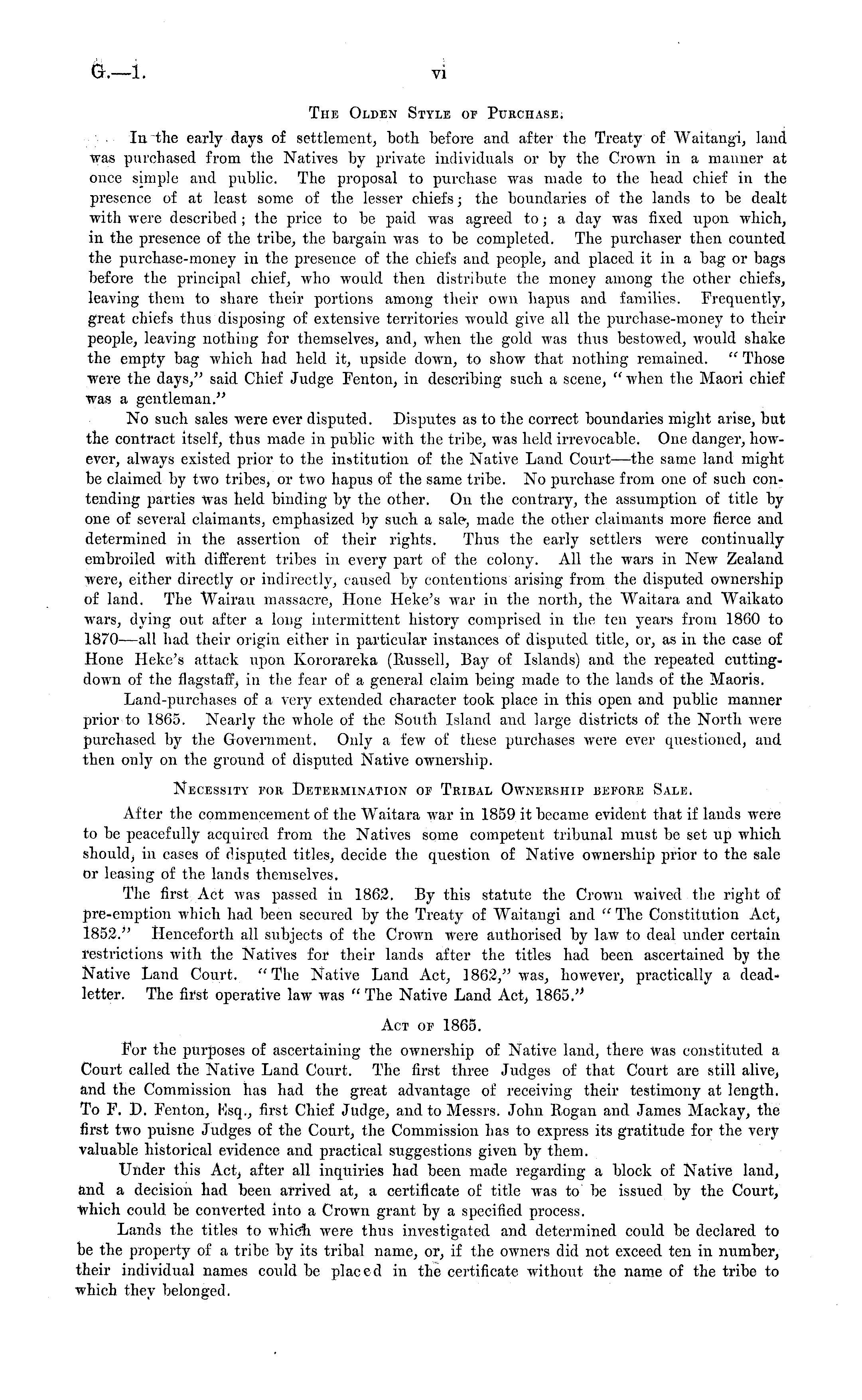 The Olden Style of Purchase; In the early days of settlement, both before and after the Treaty of Waitangi, land was purchased from the Natives by private individuals or by the Crown in a manner at once simple and public. The proposal to purchase was made to the head chief in the presence of at least some of the lesser chiefs; the boundaries of the lands to be dealt with were described ; the price to be paid was agreed to; a day was fixed upon which, in the presence of the tribe, the bargain was to be completed. The purchaser then counted the purchase-money in the presence of the chiefs and people, and placed it in a bag or bags before the principal chief, who would then distribute the money among the other chiefs, leaving them to share their portions among their own hapus and families. Frequently, great chiefs thus disposing of extensive territories would give all the purchase-money to their people, leaving nothing for themselves, and, when the gold was thus bestowed, would shake the empty bag which had held it, upside down, to show that nothing remained. " Those were the days," said Chief Judge Fenton, in describing such a scene, "when the Maori chief was a gentleman." No such sales were ever disputed. Disputes as to the correct boundaries might arise, but the contract itself, thus made in public with the tribe, was held irrevocable. One danger, however, always existed prior to the institution of the Native Land Court —the same land might be claimed by two tribes, or two hapus of the same tribe. No purchase from one of such contending parties was held binding by the other. On the contrary, the assumption of title by one of several claimants, emphasized by such a sale, made the other claimants more fierce and determined in the assertion of their rights. Thus the early settlers were continually embroiled with different tribes in every part of the colony. All the wars in New Zealand were, either directly or indirectly, caused by contentious arising from the disputed ownership of land. The Wairau massacre, Hone Heke's war in the north, the Waitara and Waikato wars, dying out after a long intermittent history comprised in the ten years from 1860 to 1870 —all had their origin either in particular instances of disputed title, or, as in the case of Hone Heke's attack upon Kororareka (Russell, Bay of Islands) and the repeated cuttingdown of the flagstaff in the fear of a general claim being made to the lands of the Maoris. Land-purchases of a very extended character took place in this open and public manner prior to 1865. Nearly the whole of the South Island and large districts of the North were purchased by the Government. Only a few of these purchases were ever questioned, and then only on the ground of disputed Native ownership. Necessity for Determination of Tribal Ownership before Sale. After the commencement of the Waitara war in 1859 it became evident that if lauds were to be peacefully acquired from the Natives some competent tribunal must be set up which should; in eases of disputed titles, decide the question of Native ownership prior to the sale or leasing of the lands themselves. The first Act was passed in 1862. By this statute the Crown waived the right of pre-emption which had been secured by the Treaty of Waitangi and " The Constitution Act, 1852." Henceforth all subjects of the Crown were authorised by law to deal under certain restrictions with the Natives for their lands after the titles had been ascertained by the Native Land Court. "The Native Land Act, 1862," was, however, practically a deadletter. The fh'st operative law was " The Native Land Act, 1865." Act of 1865. For the purposes of ascertaining the ownership of Native land, there was constituted a Court called the Native Land Court. The first three Judges of that Court are still alive, and the Commission has had the great advantage of receiving their testimony at length. To F. D. Fenton, Ksq., first Chief Judge, and to Messrs. John Rogan and James Mackay, the first two puisne Judges of the Court, the Commission has to express its gratitude for the very valuable historical evidence and practical suggestions given by them. Under this Act; after all inquiries had been made regarding a block of Native land, and a decision had been arrived at, a certificate of title was to be issued by the Court, which could be converted into a Crown grant by a specified process. Lands the titles to which were thus investigated and determined could be declared to be the property of a tribe by its tribal name, or, if the owners did not exceed ten in number, their individual names could be placed in the certificate without the name of the tribe to which they belonged.