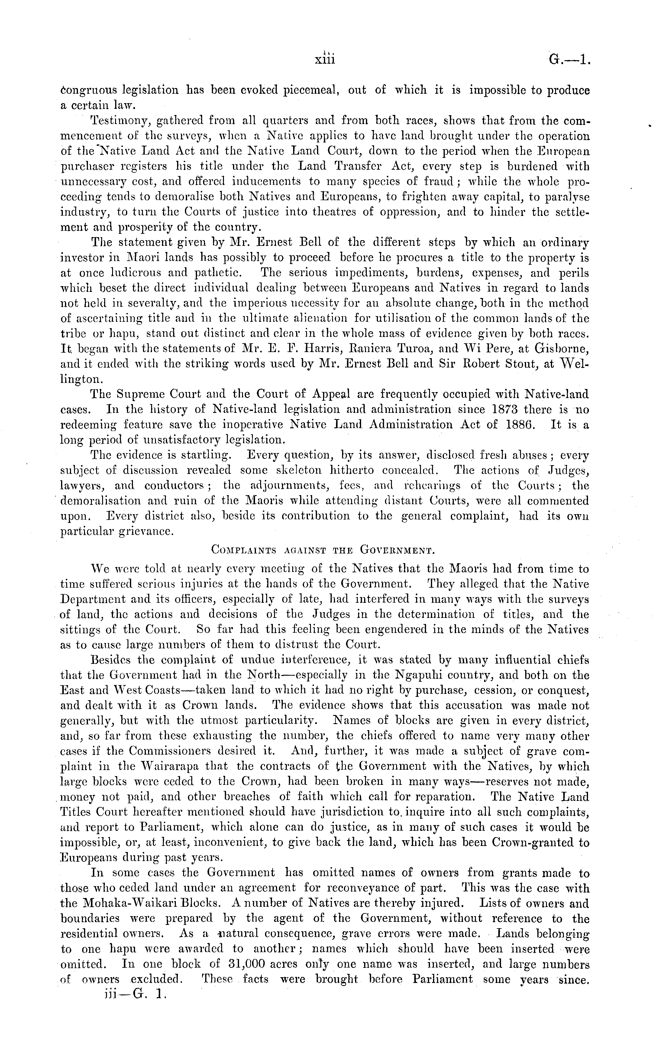 Congruous legislation has been evoked piecemeal, out of which it is impossible to produce a certain law. Testimony, gathered from all quarters and from both races, shows that from the commencement of the surveys, when a Native applies to have land brought under the operation of the Native Land Act and the Native Land Court, down to the period when the European purchaser registers his title under the Land Transfer Act, every step is burdened Avith unnecessary cost, and offered inducements to many species of fraud ; while the whole proceeding tends to demoralise both Natives and Europeans, to frighten away capital, to paralyse industry, to turn the Courts of justice into theatres of oppression, and to hinder the settlement and prosperity of the country. The statement giAren by Mr. Ernest Bell of the different steps by which an ordinary investor in Maori lands has possibly to proceed before he procures a title to the property is at once ludicrous and pathetic. The serious impediments, burdens, expenses, and perils which beset the direct individual dealing between Europeans and Natives in regard to lands not held in seA'eralty, and the imperious necessity for an absolute change, both in the method of ascertaining title and in the ultimate alienation for utilisation of the common lands of the tribe or hapu, stand out distinct and clear in the whole mass of evidence given by both races. It began with the statements of Mr. E. F. Harris, Raniera Turoa, and Wi Pere, at Gisborne, and it ended Avith the striking Avords used by Mr. Ernest Bell and Sir Robert Stout, at Wellington. The Supreme Court and the Court of Aj>peal are frequently occupied with Native-land cases. In the history of Native-land legislation and administration since 1873 there is no redeeming feature save the inoperative Native Land. Administration Act of 1886. It is a long period of unsatisfactory legislation. The evidence is startling. Every question, by its answer, disclosed fresh abuses; every subject of discussion revealed some skeleton hitherto concealed. The actions of Judges, laAvyers, and conductors; the adjournments, fees, and rehcarings of the Courts; the demoralisation and ruin of the Maoris Avhile attending distant Courts, were all commented upon. Every district also, beside its contribution to the general complaint, had its own particular grievance. Complaints against the Goa'ernment. We were told at nearly every meeting of the Natives that the Maoris had from time to time suffered serious injuries at the hands of the Government. They alleged that the NatiA'e Department and its officers, especially of late, had interfered in many Avays with the surveys of land, the actions and decisions of the Judges in the determination of titles, and the sittings of the Court. So far had this feeling been engendered in the minds of the Natives as to cause large numbers of them to distrust the Court. Besides the complaint of undue interference, it Avas stated by many influential chiefs that the Government had in the North —especially in the Ngapuhi country, and both on the East and West Coasts—taken land to which it had no right by jyurchase, cession, or conquest, and dealt with it as CroAvn lands. The evidence shows that this accusation Avas made not generally, but with the utmost particularity. Names of blocks are given in every district, and, so far from these exhausting the number, the chiefs offered to name very many other cases if the Commissioners desired it. And, further, it was made a subject of grave complaint in the W rairarapa that the contracts of the Government Avith the Natives, by which large blocks were ceded to the Crown, had been broken in many ways —reserves not made, money not paid, and other breaches of faith Avhich call for reparation. The Native Land Titles Court hereafter mentioned should have jurisdiction to. inquire into all such complaints, and report to Parliament, Avhich alone can do justice, as in many of such cases it Avould be impossible, or, at least, inconvenient, to give back the land, Avhich has been CroAvn-granted to Europeans during past years. In some cases the GoA'ernment has omitted names of owners from grants made to those who ceded land under an agreement for reconveyance of part. This Avas the case with the Mohaka-Waikari Blocks. A number of Natives are thereby injured. Lists of OAvners and boundaries Avere prepared by the agent of the GoA'ernment, without reference to the residential OAvners. As a natural consequence, grave errors were made. Lands belonging to one hapu Avere aAvardcd to another; names which should have been inserted were omitted. In one block of 31,000 acres only one name was inserted, and large numbers of OAvners excluded. These facts were brought before Parliament some vears since. iii—G. 1.