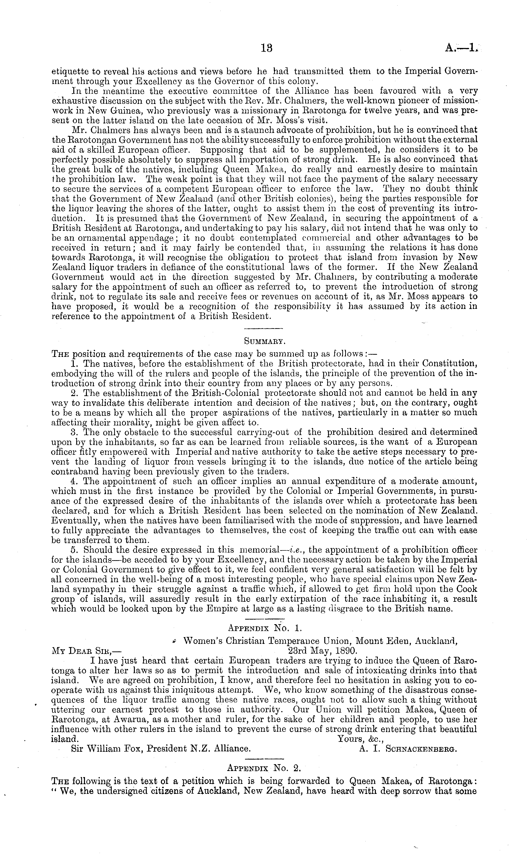 Appendix No. 1. Women's Christian Temperance Union, Mount Eden, Auckland, My Deae Sib — 23rd May, 1890. I have just heard that certain European traders are trying to induce the Queen of Rarotonga to alter her laws so as to permit the introduction and sale of intoxicating drinks into that island. We are agreed on prohibition, I know, and therefore feel no hesitation in asking you to cooperate with us against this iniquitous attempt. We, who know something of the disastrous consequences of the liquor traffic among these native races, ought not to allow such a thing without uttering our earnest protest to those in authority. Our Union will petition Makea, Queen of Earotonga, at Awarua, as a mother and ruler, for the sake of her children and people, to use her influence with other rulers in the island to prevent the curse of strong drink entering that beautiful island. Yours, &c, Sir William Fox, President N.Z. Alliance. A. I. Schnackenbeeg.