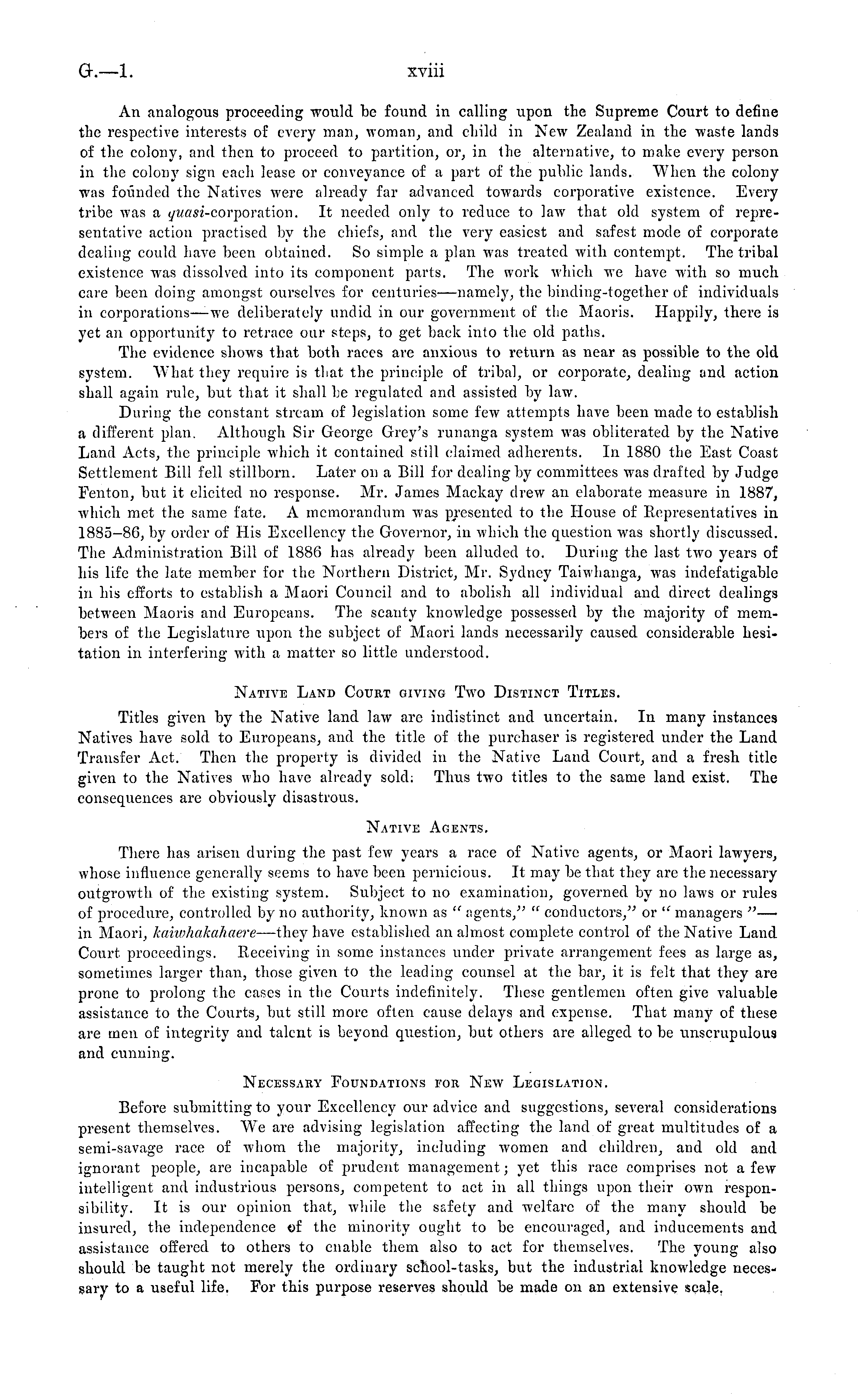 An analogous proceeding would be found in calling upon the Supreme Court to define the respective interests of every man, woman, and child in New Zealand in the waste lands of the colony, and then to proceed to partition, or, in the alternative, to make every person in the colony sign each lease or conveyance of a part of the public lands. When the colony was founded the Natives were already far advanced towards corporative existence. Every tribe Avas a i/wose-corporation. It needed only to reduce to law that old system of representative action practised by the chiefs, and the very easiest and safest mode of corporate dealing could have been obtained. So simple a plan was treated with contempt. The tribal existence was dissolved into its component parts. The work which we have with so much care been doing amongst ourselves for centuries —namely, the binding-together of individuals in corporations —-we deliberately undid in our government of the Maoris. Happily, there is yet an opportunity to retrace our steps, to get back into the old paths. The evidence shows that both races are anxious to return as near as possible to the old system. What they require is that the principle of tribal, or corporate, dealing and action shall again rule, but that it shall be regulated and assisted by law. During the constant stream of legislation some few attempts have been made to establish a different plan. Although Sir George Grey's runanga system Avas obliterated by the Native Land Acts, the principle which it contained still claimed adherents. In 1880 the East Coast Settlement Bill fell stillborn. Later on a Bill for dealing by committees was drafted by Judge Fenton, but it elicited no response. Mr. James Mackay drew an elaborate measure in 1887, which met the same fate. A memorandum was presented to the House of Representatives in 1885-86, by order of His Excellency the Governor, in Avhich the question Avas shortly discussed. The Administration Bill of 1886 has already been alluded to. During the last two years of his life the late member for the Northern District, Mr. Sydney Taiwhanga, was indefatigable in his efforts to establish a Maori Council and to abolish all individual and direct dealings between Maoris and Europeans. The scanty knowledge possessed by the majority of members of the Legislature upon the subject of Maori lands necessarily caused considerable hesitation in interfering with a matter so little understood. Native Land Court giving Two Distinct Titles. Titles given by the Native land law are indistinct and uncertain. In many instances Natives have sold to Europeans, and the title of the purchaser is registered under the Land Transfer Act. Then the property is divided in the Native Land Court, and a fresh title giA'en to the Natives who have already sold: Thus two titles to the same land exist. The consequences are obviously disastrous. Native Agents. There has arisen during the past few years a race of NatiA'e agents, or Maori lawyers, Avhose influence generally seems to have been pernicious. It may be that they are the necessary outgroAvth of the existing system. Subject to no examination, governed by no laAvs or rules of procedure, controlled by no authority, known as " agents," " conductors," or " managers " — in Maori, kaiwhakahaere —they have established an almost complete control of the Native Land Court proceedings. Receiving in some instances under private arrangement fees as large as, sometimes larger than, those giA'en to the leading counsel at the bar, it is felt that they are prone to prolong the cases in the Courts indefinitely. These gentlemen often give valuable assistance to the Courts, but still more often cause delays and expense. That many of these are men of integrity and talent is beyond question, but others are alleged to be unscrupulous and cunning. Necessary Foundations for New Legislation. Before submitting to your Excellency our advice and suggestions, seA'eral considerations present themselves. W Te are advising legislation affecting the land of great multitudes of a semi-savage race of whom the majority, including Avomen and children, and old and ignorant people, are incapable of prudent management; yet this race comprises not a few intelligent and industrious persons, competent to act in all things upon their OAvn responsibility. It is our opinion that, while the safety and welfare of the many should be insured, the independence of the minority ought to be encouraged, and inducements and assistance offered to others to enable them also to act for themselves. The young also should be taught not merely the ordinary school-tasks, but the industrial knowledge necessary to a useful life. For this purpose reserves should be made on an extensive scale.
