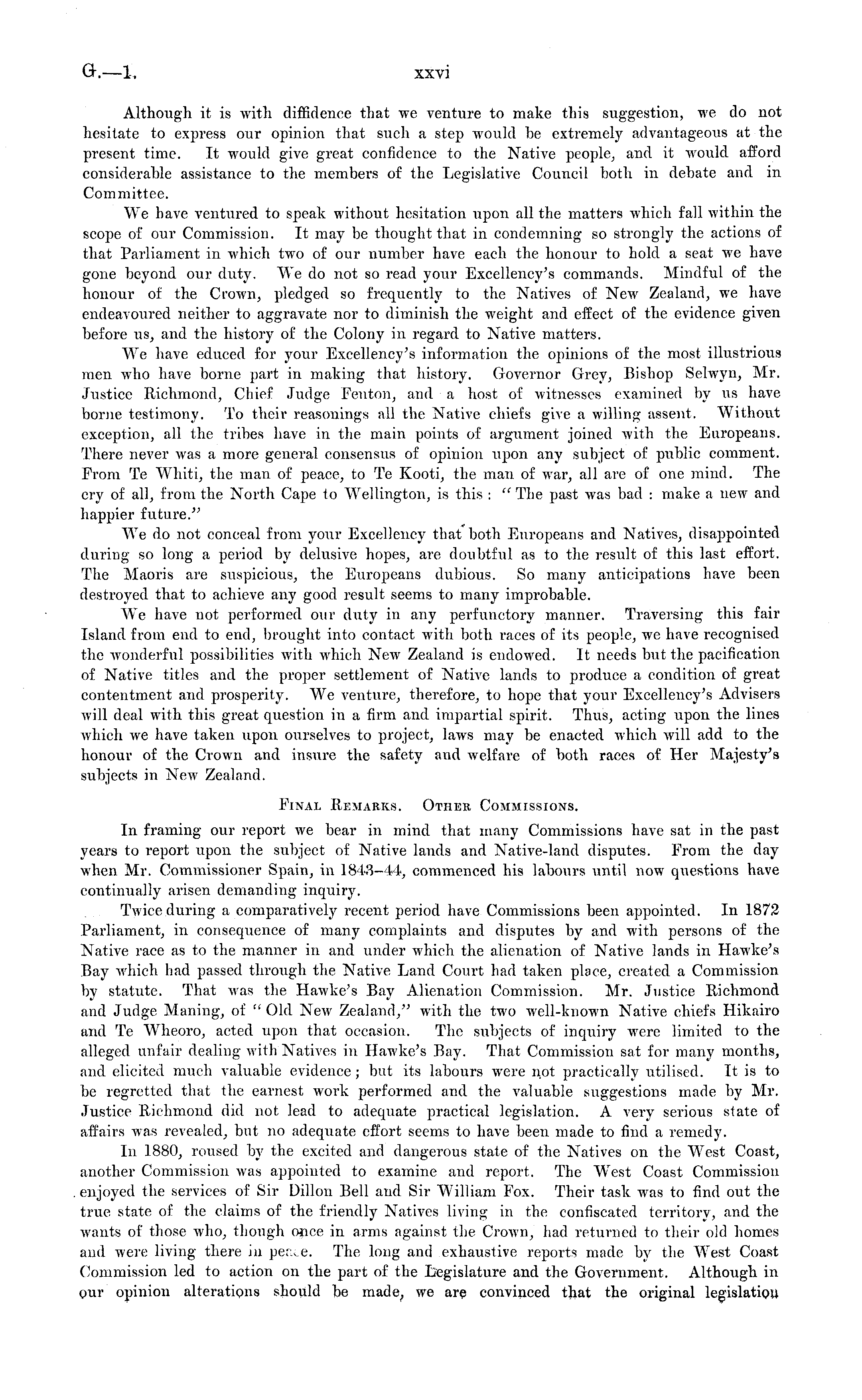 Although it is with diffidence that we A'enture to make this suggestion, we do not hesitate to express our opinion that such a step would be extremely advantageous at the present time. It would give great confidence to the Native people, and it would afford considerable assistance to the members of the Legislative Council both in debate and in Committee. We have ventured to speak without hesitation upon all the matters which fall within the scope of our Commission. It may be thought that in condemning so strongly the actions of that Parliament in which two of our number have each the honour to hold a seat we have gone beyond our duty. We do not so read your Excellency's commands. Mindful of the honour of the CroAvn, pledged so frequently to the NatiA'es of New Zealand, we have endeavoured neither to aggravate nor to diminish the AA'eight and effect of the eA'idence given before us, and the history of the Colony in regard to Native matters. We have educed for your Excellency's information the opinions of the most illustrious men who have borne part in making that history. GoA'ernor Grey, Bishop Sehvyn, Mr. Justice Richmond, Chief Judge Fenton, and a host of witnesses examined by us have borne testimony. To their reasonings all the NatiA'e chiefs give a willing assent. Without exception, all the tribes have in the main points of argument joined with the Europeans. There neA'er was a more general consensus of opinion upon any subject of public comment. From Te Whiti, the man of peace, to Te Kooti, the man of war, all arc of one mind. The cry of all, from the North Cape to Wellington, is this : " The past was bad : make a new and happier future." We do not conceal from your Excellency that both Europeans and Natives, disappointed during so long a period by delusive hopes, are doubtful as to the result of this last effort. The Maoris are suspicious, the Europeans dubious. So many anticipations have been destroyed that to achieve any good result seems to many improbable. We have not performed our duty in any perfunctory manner. Traversing this fair Island from end to end, brought into contact with both races of its people, we have recognised the wonderful possibilities with which Ncav Zealand is endowed. It needs but the pacification of Native titles and the proper settlement of Native lands to produce a condition of great contentment and prosperity. We A'enture, therefore, to hope that your Excellency's Advisers will deal with this great question in a firm and impartial spirit. Thus, acting upon the lines which we have taken upon ourselves to project, laws may be enacted which will add to the honour of the Crown and insure the safety and welfare of both races of Her Majesty's subjects in New Zealand. Final Remarks. Other Commissions. In framing our report Ave bear in mind that many Commissions have sat in the past years to report upon the subject of Native lands and Native-land disputes. From the day Avhen Mr. Commissioner Spain, in 1843-44, commenced his labours until now questions have continually arisen demanding inquiry. Twice during a comparatively recent period have Commissions been appointed. In 1872 Parliament, in consequence of many complaints and disputes by and with persons of the Native race as to the manner in and under which the alienation of Native lands in Hawke's Bay which had passed through the Native Land Court had taken place, created a Commission by statute. That was the Hawke's Bay Alienation Commission. Mr. Justice Richmond and Judge Maning, of " Old New Zealand," with the tAvo well-known Native chiefs Hikairo and Te Wheoro, acted upon that occasion. The subjects of inquiry were limited to the alleged unfair dealing with Natives in Hawke's Bay. That Commission sat for many months, and elicited much valuable eAidence; but its labours were not practically utilised. It is to be regretted that the earnest work performed and the valuable suggestions made by Mr. Justice Richmond did not lead to adequate practical legislation. A very serious state of affairs was revealed, but no adequate effort seems to have been made to find a remedy. In 1880, roused by the excited and dangerous state of the Natives on the West Coast, another Commission Avas appointed to examine and report. The W rest Coast Commission enjoyed the services of Sir Dillon Bell and Sir William Fox. Their task was to find out the true state of the claims of the friendly NatiA'es living in the confiscated territory, and the Avants of those who, though once in arms against the Crown, had returned to their old homes and were living there in perxe. The long and exhaustive reports made by the West Coast Commission led to action on the part of the Legislature and the Government. Although in pur opinion alterations should be made, we are convinced that the original legislation