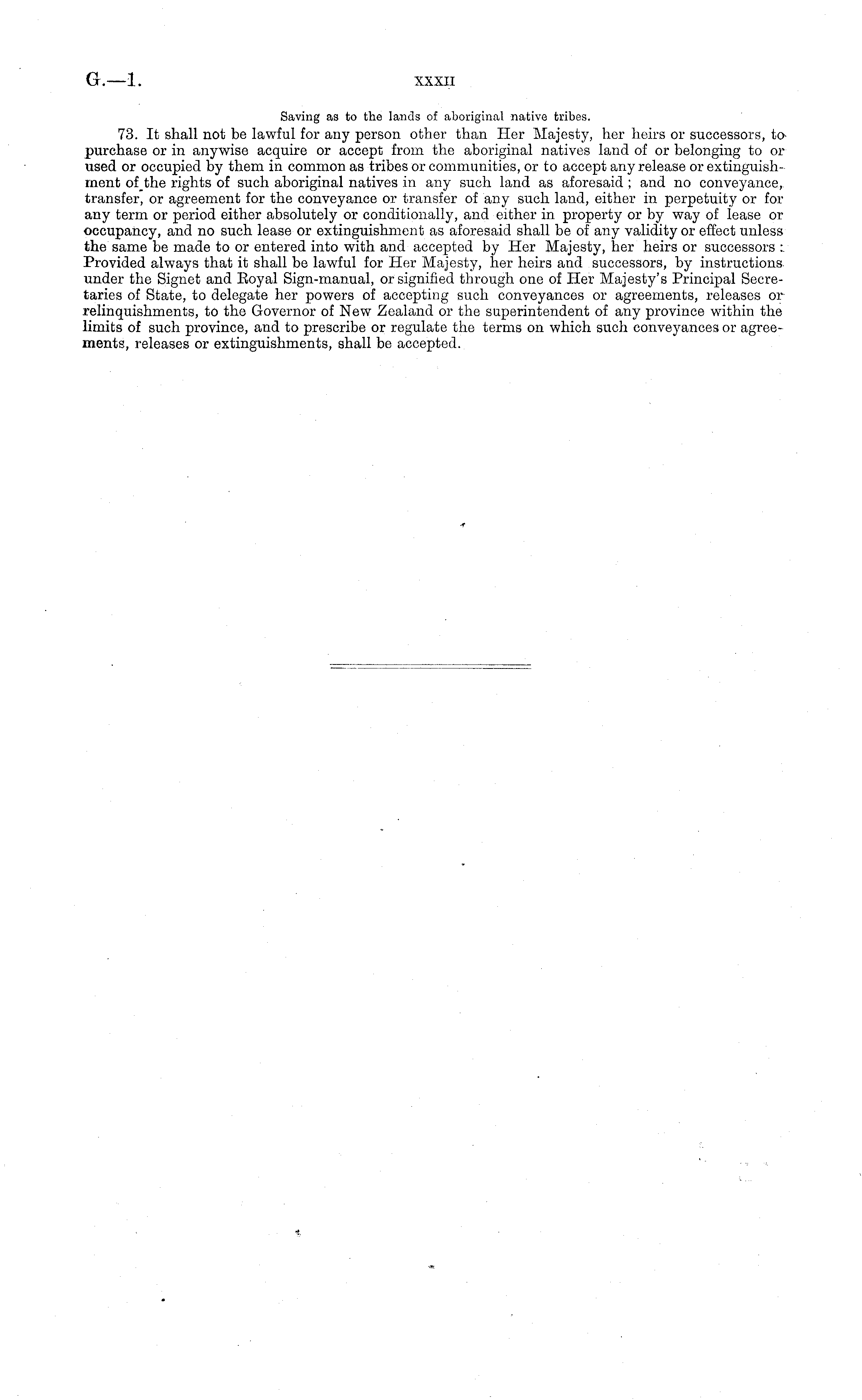 Saving as to the lands of aboriginal native tribes. 73. It shall not be lawful for any person other than Her Majesty, her heirs or successors, to purchase or in anywise acquire or accept from the aboriginal natives land of or belonging to or used or occupied by them in common as tribes or communities, or to accept any release or extinguishment of_the rights of such aboriginal natives in any such land as aforesaid ; and no conveyance, transfer, or agreement for the conveyance or transfer of any such land, either in perpetuity or for any term or period either absolutely or conditionally, and either in property or by way of lease or occupancy, and no such lease or extinguishment as aforesaid shall be of any validity or effect unless the same be made to or entered into with and accepted by Her Majesty, her heirs or successors :. Provided always that it shall be lawful for Her Majesty, her heirs and successors, by instructions under the Signet and Royal Sign-manual, or signified through one of Her Majesty's Principal Secretaries of State, to delegate her powers of accepting such conveyances or agreements, releases or relinquishments, to the Governor of New Zealand or the superintendent of any province within the limits of such province, and to prescribe or regulate the terms on which such conveyances or agreements, releases or extinguishments, shall be accepted.