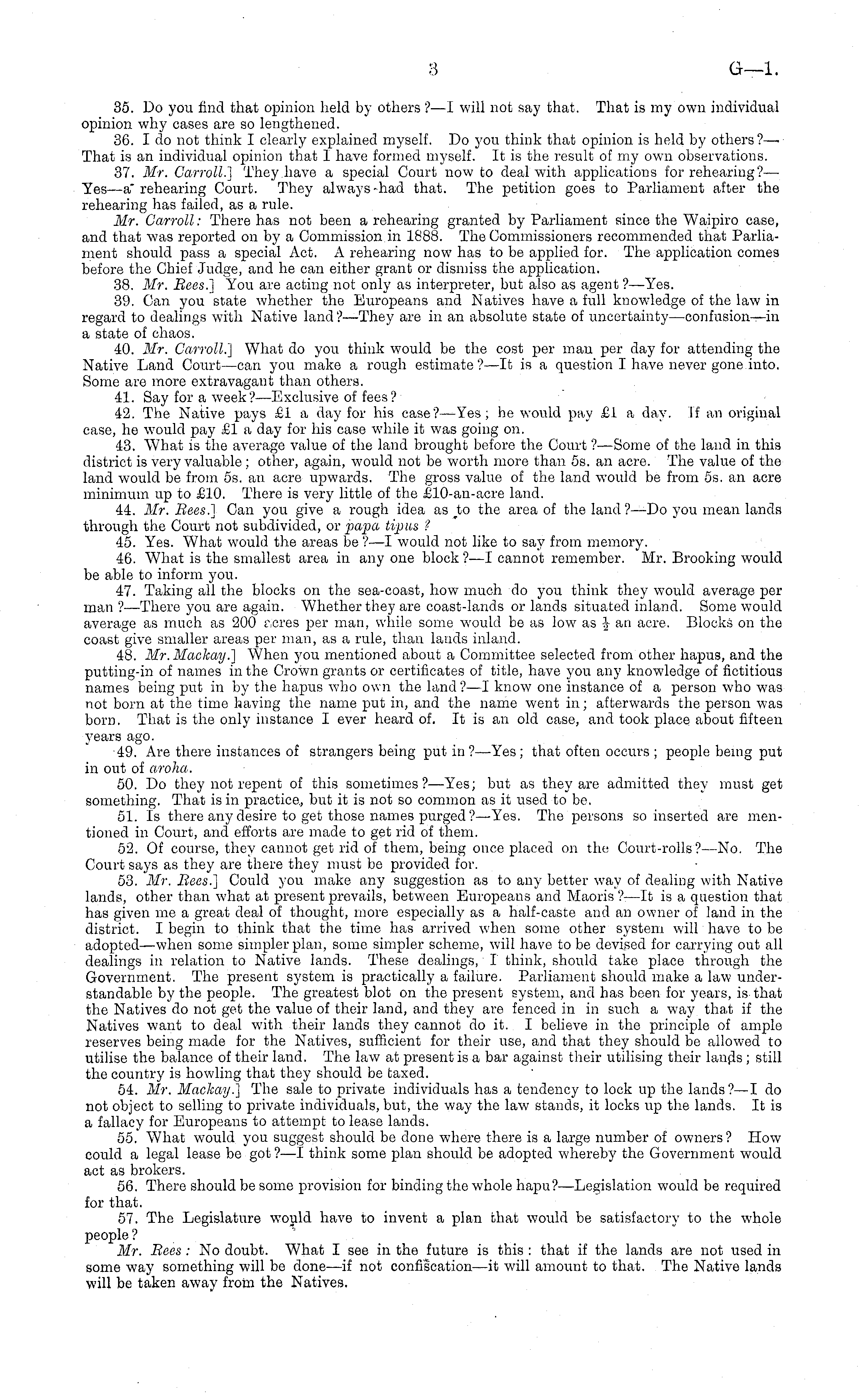 35. Do you find that opinion held by others ? —I will not say that. That is my own individual opinion why cases are so lengthened. 36. Ido not think I clearly explained myself. Do you think that opinion is held by others ?— That is an individual opinion that I have formed myself. It is the result of my own observations. 37. Mr. Carroll.] They have a special Court now to deal with applications for rehearing?— Yes —a" rehearing Court. They always-had that. The petition goes to Parliament after the rehearing has failed, as a rule. Mr. Carroll: There has not been a rehearing granted by Parliament since the Waipiro case, and that was reported on by a Commission in 1888. The Commissioners recommended that Parliament should pass a special Act. A rehearing now has to be applied for. The application comes before the Chief Judge, and he can either grant or dismiss the application. 38. Mr. Bees.] You are acting not only as interpreter, but also as agent ?—Yes. 39. Can you state whether the Europeans and Natives have a full knoAvledge of the law in regard to dealings with Native land ?—They are in an absolute state of uncertainty —confusion—in a state of chaos. 40. Mr. Carroll.] What do you think would be the cost per man per day for attending the Native Land Court —can you make a rough estimate ? —lt is a question I have never gone into. Some are more extravagant than others. 41. Say for a Aveek? —Exclusive of fees? 42. The Native pays £1 a day for his case? —Yes; lie Avould pay £1 a day. If an original case, he would pay £1 a day for his case while it was going on. 43. What is the average value of the land brought before the Court ?—Some of the land in this district is very valuable ; other, again, would not be worth more than ss. an acre. The value of the land Avould be from ss. an acre upwards. The gross value of the land would be from ss. an acre minimum up to £10. There is very little of the £10-an-acre land. 44. Mr. Bees.] Can you give a rough idea as to the area of the land? —Do you mean lands through the Court not subdivided, or papa tipns '. 45. Yes. What Avould the areas be ?—I Avould not like to say from memory. 46. What is the smallest area in any one block ?—I cannot remember. Mr. Brooking would be able to inform you. 47. Taking all the blocks on the sea-coast, how much do you think they Avould average per man ?—There you are again. Whether they are coast-lands or lands situated inland. Some Avould average as much as 200 r.cres per man, while some would be as low as \an acre. Blocks on the coast give smaller areas per man, as a rule, than lands inland. 48. Mr. Mackay.] When you mentioned about a Committee selected from other hapus, and the putting-in of names in the Crown grants or certificates of title, have you any knowledge of fictitious names being put in by the hapus Avho own the land?—l know one instance of a person Avho was not born at the time having the name put in, and the name went in; afterwards the person Avas born. That is the only instance I ever heard of. It is an old case, and took place about fifteen years ago. ■49. Are there instances of strangers being put in ? —Yes; that often occurs ; people being put in out of aroha. 50. Do they not repent of this sometimes?—Yes; but as they are admitted they must get something. That is in practice, but it is not so common as it used to be. 51. Is there any desire to get those names purged ? —Yes. The persons so inserted are mentioned in Court, and efforts are made to get rid of them. 52. Of course, they cannot get rid of them, being once placed on tin; Court-rolls?—No. The Court says as they are there they must be provided for. 53. Mr. Bees.] Could you make any suggestion as to any better way of dealing with Native lands, other than Avhat at present prevails, betAveen Europeans and Maoris ?—lt is a question that has given me a great deal of thought, more especially as a half-caste and an owner of land in the district. I begin to think that the time has arrived Avhen some other system will have to be adopted—when some simpler plan, some simpler scheme, will have to be devised for carrying out all dealings in relation to Native lands. These dealings, I think, should take place through the Government. The present system is practically a failure. Parliament should make a law understandable by the people. The greatest blot on the present system, and has been for years, is that the Natives do not get the value of their land, and they are fenced in in such a way that if the Natives want to deal Avith their lands they cannot do it. I believe in the principle of ample reserves being made for the Natives, sufficient for their use, and that they should be allowed to utilise the balance of their land. The laAv at present is a bar against their utilising their lands ; still the country is hoAvling that they should be taxed. 54. Mr. Mackay.] The sale to private individuals has a tendency to lock up the lands?—l do not object to selling to private individuals, but, the way the law stands, it locks up the lands. It is a fallacy for Europeans to attempt to lease lands. 55. What would you suggest should be done where there is a large number of owners? How could a legal lease be got ? —I think some plan should be adopted whereby the Government would act as brokers. 56. There should be some provision for binding the Avhole hapu? —Legislation would be required for that. 57. The Legislature would have to invent a plan that would be satisfactory to the Avhole people ? Mr. Bees : No doubt. What I see in the future is this : that if the lands are not used in some way something will be done —if not confiscation —it will amount to that. The Native lands will be taken away from the Natives,
