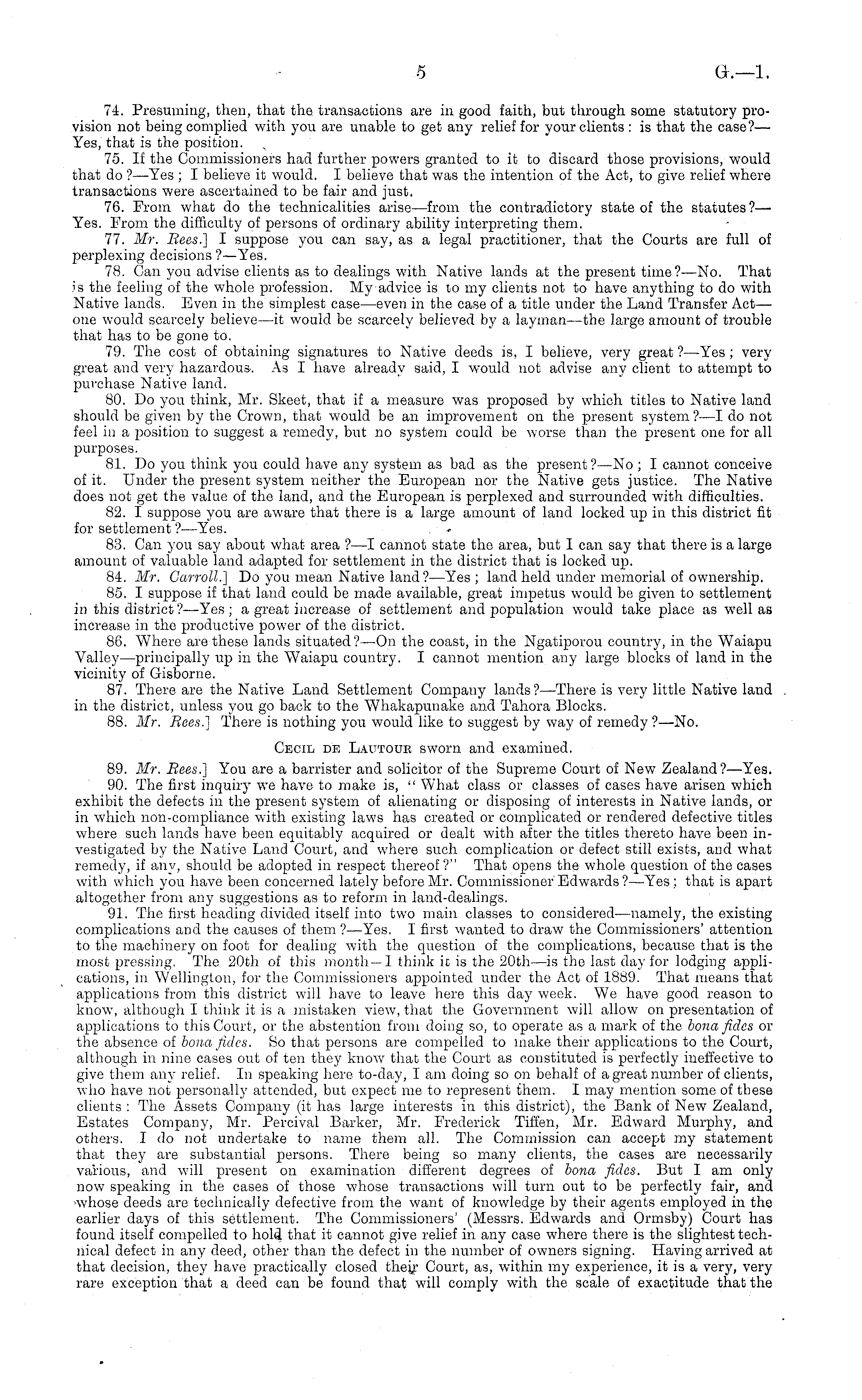 74. Presuming, then, that the transactions are in good faith, but through some statutory provision not being complied with you are unable to get any relief for your clients : is that the case?— Yes, that is the position. 75. If the Commissioners had further powers granted to it to discard those provisions, would that do ? —Yes ; I believe it would. I believe that was the intention of the Act, to give relief where transactions were ascertained to be fair and just. 76. From what do the technicalities arise—from the contradictory state of the statutes? — Yes. From the difficulty of persons of ordinary ability interpreting them. 77. Mr. Bees.] I suppose you can say, as a legal practitioner, that the Courts are full of perplexing decisions ?—Yes. 78. Can you advise clients as to dealings with Native lands at the present time?—No. That is the feeling of the whole profession. My advice is to my clients not to have anything to do with Native lands. Even in the simplest case—even in the case of a title under the Land Transfer Act— one would scarcely believe —it Avould be scarcely believed by a layman—the large amount of trouble that has to be gone to. 79. The cost of obtaining signatures to Native deeds is, I believe, very great ?—Yes; very great and very hazardous. As I have already said, I would not advise any client to attempt to purchase Native land. 80. Do you think, Mr. Skeet, that if a measure was proposed by which titles to Native land should be given by the Crown, that would be an improvement on the present system? —I do not feel in a position to suggest a remedy, but no system could be worse than the present one for all purposes. 81. Do you think you could have any system as bad as the present?—No ; I cannot conceive of it. Under the present system neither the European nor the Native gets justice. The Native does not get the value of the land, and the European is perplexed and surrounded with difficulties. 82. I suppose you are aware that there is a large amount of land locked up in this district fit for settlement ? —Yes. 83. Can you say about what area ? —I cannot state the area, but I can say that there is a large amount of valuable land adapted for settlement in the district that is locked up. 84. Mr. Carroll.] Do you mean Native land?—Yes; land held under memorial of ownership. 85. I suppose if that land could be made available, great impetus would be given to settlement in this district ? —Yes ; a great increase of settlement and population Avould take place as well as increase in the productive power of the district. 86. Where are these lands situated?—On the coast, in the Ngatiporou country, in the Waiapu Valley —principally up in the Waiapu country. I cannot mention any large blocks of land in the vicinity of Gisborne. 87. There are the Native Land Settlement Company lands? —There is very little Native land in the district, unless you go back to the Whakapuuake and Tahora Blocks. 88. Mr. Bees.] There is nothing you would like to suggest by Avay of remedy ?—No. Cecil de Lautour sworn and examined. 89. Mr. Bees.] You are a barrister and solicitor of the Supreme Court of New Zealand?—Yes. 90. The first inquiry we have to make is, " What class or classes of cases have arisen which exhibit the defects in the present system of alienating or disposing of interests in Native lands, or in which non-compliance with existing laws has created or complicated or rendered defective titles where such lands have been equitably acquired or dealt AA'ith after the titles thereto have been investigated by the Native Land Court, and where such complication or defect still exists, and Avhat remedy, if any, should be adopted in respect thereof ?" That opens the whole question of the cases Avith which you have been concerned lately before Mr. Commissioner Edwards ?—Yes; that is apart altogether from any suggestions as to reform in land-dealings. 91. The first heading divided itself into two main classes to considered—namely, the existing complications and the causes of them ? —Yes. I first Avanted to draw the Commissioners' attention to the machinery on foot for dealing with the question of the complications, because that is the most pressing. The 20th of this month—l think it is the 20th—is the last day for lodging applications, in Wellington, for the Commissioners appointed under the Act of 1889. That means that applications from this district will have to leave here this day week. We have good reason to know, although I think it is a mistaken A'iew, that the GoA'ermnent will allow on presentation of applications to this Court, or the abstention from doing so, to operate as a mark of the bona fides or the absence of bona fides. So that persons are compelled to make their applications to the Court, although in nine cases out of ten they knoAV that the Court as constituted is perfectly ineffective to give them any relief. In speaking here to-day, lam doing so on behalf of a great number of clients, who have not personally attended, but expect me to represent them. I may mention some of these clients : The Assets Company (it has large interests in this district), the Bank of New Zealand, Estates Company, Mr. Percival Barker, Mr. Frederick Tiffen, Mr. Edward Murphy, and others. I do not undertake to name them all. The Commission can accept my statement that they are substantial persons. There being so many clients, the cases are necessarily various, and will present on examination different degrees of bona fides. But I am only noAV speaking in the cases of those Avhose transactions will turn out to be perfectly fair, and •Avhose deeds are technically defective from the want of knoAvledge by their agents employed in the earlier days of this settlement. The Commissioners' (Messrs. Edwards and Ormsby) Court has found itself compelled to hold that it cannot give relief in any case where there is the slightest technical defect in any deed, other than the