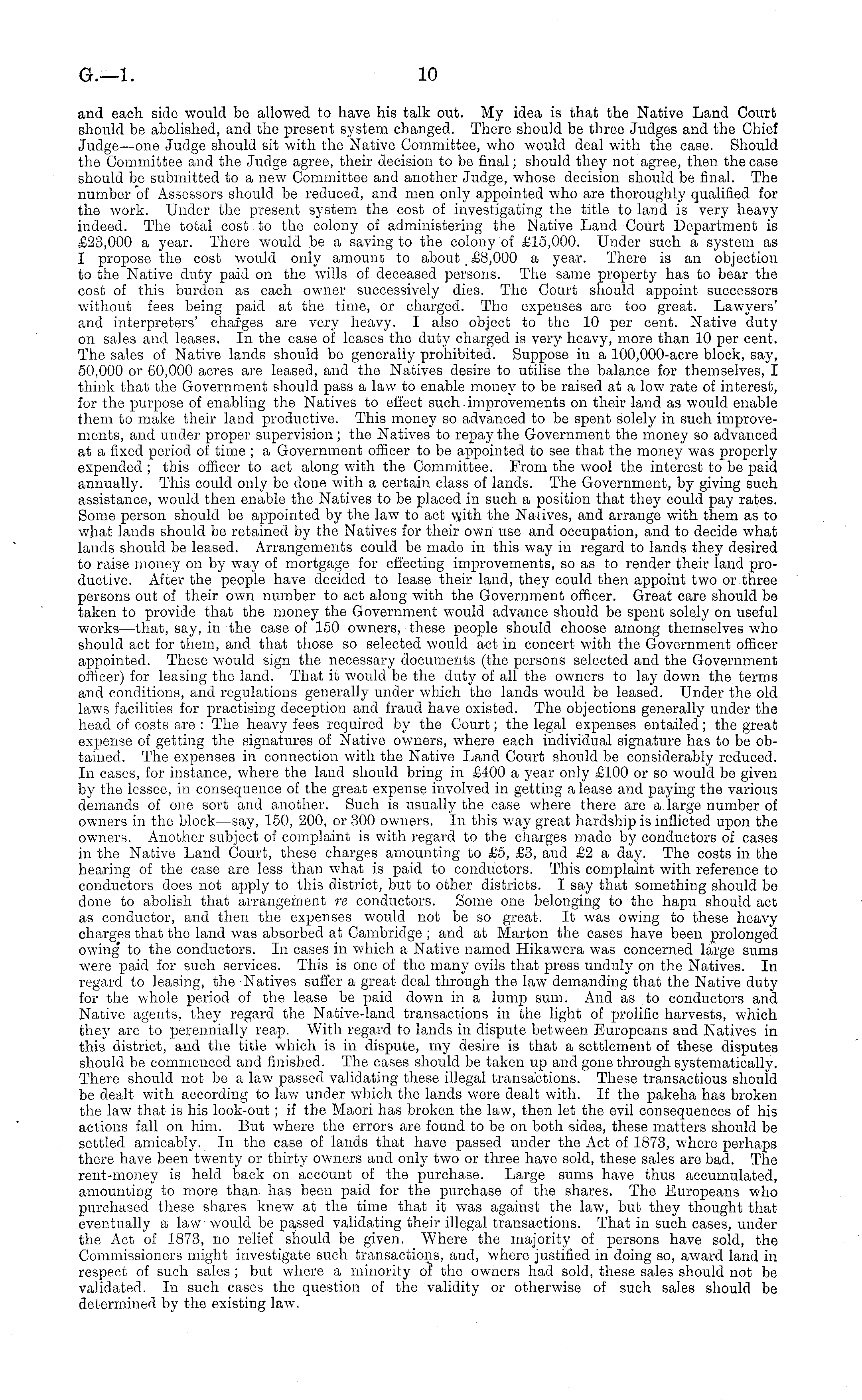 and each side would be allowed to have his talk out. My idea is that the Native Land Court should be abolished, and the present system changed. There should be three Judges and the Chief Judge—one Judge should sit Avith the Native Committee, who Avould deal with the case. Should the Committee and the Judge agree, their decision to be final; should they not agree, then the case should be submitted to a new Committee and another Judge, whose decision should be final. The number of Assessors should be reduced, and men only appointed who are thoroughly qualified for the work. Under the present system the cost of investigating the title to land is very heavy indeed. The total cost to the colony of administering the Native Land Court Department is £23,000 a year. There Avould be a saving to the colony of £15,000. Under such a system as I propose the cost Avould only amount to about £8,000 a year. There is an objection to the Native duty paid on the Avills of deceased persons. The same property has to bear the cost of this burden as each owner successively dies. The Court should appoint successors Avithout fees being paid at the time, or charged. The expenses are too great. Lawyers' and interpreters' charges are very heavy. I also object to the 10 per cent. Native duty on sales and leases. In the case of leases the duty charged is very heavy, more than 10 per cent. The sales of Native lands should be generally prohibited. Suppose in a 100,000-acre block, say, 50,000 or 60,000 acres are leased, and the Natives desire to utilise the balance for themselves, I think that the Government should pass a IaAV to enable money to be raised at a loav rate of interest, for the purpose of enabling the Natives to effect such. improvements on their land as would enable them to make their land productive. This money so advanced to be spent solely in such improvements, and under proper supervision; the Natives to repay the Government the money so advanced at a fixed period of time ; a Government officer to be appointed to see that the money Avas properly expended ; this officer to act along with the Committee. From the avool the interest to be paid annually. This could only be done with a certain class of lands. The Government, by giving such assistance, would then enable the Natives to be placed in such a position that they could pay rates. Some person should be appointed by the law to act with the Natives, and arrange with them as to what lands should be retained by the Natives for their own use and occupation, and to decide what lands should be leased. Arrangements could be made in this Avay in regard to lands they desired to raise money on by way of mortgage for effecting improvements, so as to render their land productive. After the people have decided to lease their land, they could then appoint two or three persons out of their own number to act along with the Government officer. Great care should be taken to provide that the money the Government would advance should be spent solely on useful works—that, say, in the case of 150 OAvners, these people should choose among themselves who should act for them, and that those so selected A\ 7ould act in concert with the Go\ernment officer appointed. These would sign the necessary documents (the persons selected and the Government officer) for leasing the land. That it would be the duty of all the owners to lay down the terms and conditions, and regulations generally under Avhich the lands would be leased. Under the old laws facilities for practising deception and fraud haAe existed. The objections generally under the head of costs are : The heavy fees required by the Court; the legal expenses entailed; the great expense of getting the signatures of Native OAvners, where each individual signature has to be obtained. The expenses in connection with the Native Land Court should be considerably reduced. In cases, for instance, where the land should bring in £400 a year only £100 or so would be given by the lessee, in consequence of the great expense involved in getting a lease and paying the various demands of one sort and another. Such is usually the case where there are a large number of owners in the block—say, 150, 200, or 300 owners. In this way great hardship is inflicted upon the owners. Another subject of complaint is with regard to the charges made by conductors of cases in the Native Land Court, these charges amounting to £5, £3, and £2 a day. The costs in the hearing of the case are less than Avhat is paid to conductors. This complaint with reference to conductors does not apply to this district, but to other districts. I say that something should be done to abolish that arrangement re conductors. Some one belonging to the hapu should act as conductor, and then the expenses would not be so great. It was owing to these heavy charges that the land was absorbed at Cambridge ; and at Marton the cases have been prolonged OAving' to the conductors. In cases in which a Native named Hikawera was concerned large sums were paid for such services. This is one of the many evils that press unduly on the Natives. In regard to leasing, the -Natives suffer a great deal through the IaAV demanding that the Native duty for the Avhole period of the lease be paid down in a lump sum. And as to conductors and Native agents, they regard the Native-land transactions in the light of prolific harvests, AA-hich they are to perennially reap. With regard to lands in dispute between Europeans and Natives in this district, and the title Avhich is in dispute, my desire is that a settlement of these disputes should be commenced and finished. The cases should be taken up and gone through systematically. There should not be a IaAV passed validating these illegal transactions. These transactious should be dealt with according to law under which the lands were dealt with. If the pakeha has broken the law that is his look-out; if the Maori has broken the law, then let the evil co