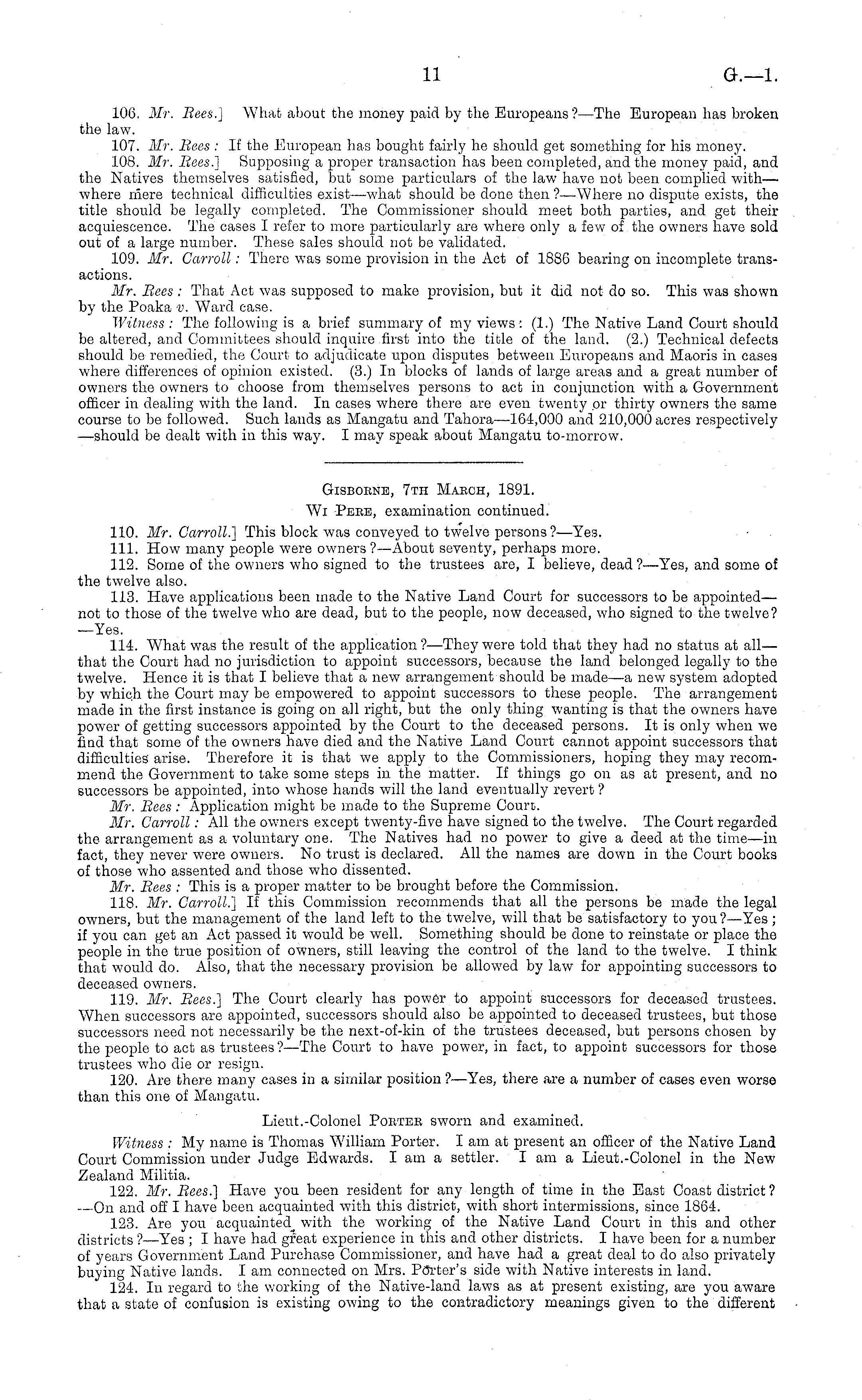 Gisborne, 7th March, 1891. Wi Pere, examination continued. 110. Mr. Carroll.] This block was conveyed to twelve persons ?—-Yes. 111. How many people were owners ?—About seventy, perhaps more. 112. Some of the owners who signed to the trustees are, I believe, dead?—Yes, and some of the twelve also. 113. Have applications been made to the Native Land Court for successors to be appointed— not to those of the twelve who are dead, but to the people, now deceased, who signed to the twelve? —Yes. 114. What was the result of the application ?—They were told that they had no status at all— that the Court had no jurisdiction to appoint successors, because the land belonged legally to the twelve. Hence it is that I believe that a new arrangement should be made—-a new system adopted by which the Court may be empowered to appoint successors to these people. The arrangement made in the first instance is going on all right, but the only thing wanting is that the owners have power of getting successors appointed by the Court to the deceased persons. It is only when we find that some of the owners have died and the Native Land Court cannot appoint successors that difficulties arise. Therefore it is that Ave apply to the Commissioners, hoping they may recommend the Government to take some steps in the matter. If things go on as at present, and no successors be appointed, into whose hands will the land eventually revert ? Mr. Bees : Application might be made to the Supreme Court. Mr. Carroll: All the owners except twenty-five have signed to the tAvelve. The Court regarded the arrangement as a voluntary one. The Natives had no poAver to give a deed at the time—in fact, they never were OAvners. No trust is declared. All the names are down in the Court books of those who assented and those who dissented. Mr. Bees : This is a proper matter to be brought before the Commission. 118. Mr. Carroll.] If this Commission recommends that all the persons be made the legal owners, but the management of the land left to the twelve, will that be satisfactory to you? —Yes ; if you can get an Act passed it would be well. Something should be clone to reinstate or place the people in the true position of owners, still leaving the control of the land to the twelve. I think that would do. Also, that the necessary provision be allowed by law for appointing successors to deceased owners. 119. Mr. Bees.] The Court clearly has power to appoint successors for deceased trustees. When successors are appointed, successors should also be appointed to deceased trustees, but those successors need not necessarily be the next-of-kin of the trustees deceased, but persons chosen by the people to act as trustees? —The Court to have power, in fact, to appoint successors for those trustees who die or resign. 120. Are there many cases in a similar position ?—Yes, there are a number of cases even worse than this one of Mangatu. Lieut.-Colonel Porter sworn and examined. Witness : My name is Thomas William Porter. lam at present an officer of the Native Land Court Commission under Judge Edwards. lam a settler. I am a Lieut.-Colonel in the New Zealand Militia. 122. Mr. Bees.] HaA'e you been resident for any length of time in the East Coast district ? —On and off I have been acquainted with this district, with short intermissions, since 1864. 123. Are you acquainted^ with the working of the Native Land Court in this and other districts ?—Yes ; I have had great experience in this and other districts. I have been for a number of years Government Land Purchase Commissioner, and have had a great deal to do also privately buying Native lands. lam connected on Mrs. Porter's side with Native interests in land. 124. In regard to the working of the Native-land laws as at present existing, are you aware that a state of confusion is existing owing to the contradictory meanings given to the different