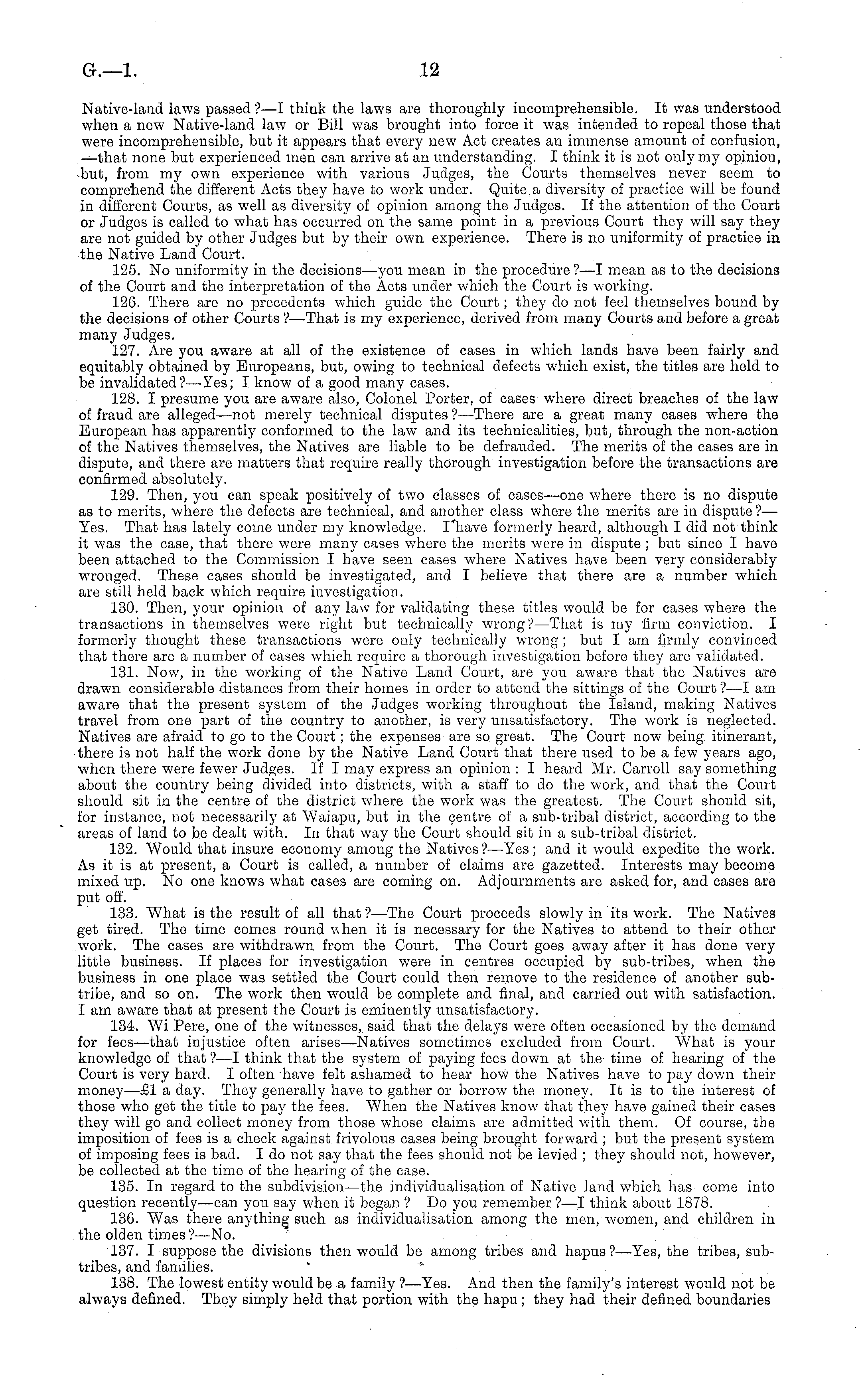 Native-land laAvs passed ?—I think the laws are thoroughly incomprehensible. It Avas understood when a new Native-land laAv or Bill was brought into force it was intended to repeal those that were incomprehensible, but it appears that every new Act creates an immense amount of confusion, —that none but experienced men can arrive at an understanding. I think it is not only my opinion, but, from my own experience with various Judges, the Courts themselves never seem to comprehend the different Acts they have to work under. Quite a diversity of practice will be found in different Courts, as well as diversity of opinion among the Judges. If the attention of the Court or Judges is called to what has occurred on the same point in a previous Court they will say they are not guided by other Judges but by their own experience. There is no uniformity of practice in the Native Land Court. 125. No uniformity in the decisions—you mean in the procedure?—l mean as to the decisions of the Court and the interpretation of the Acts under which the Court is working. 126. There are no precedents which guide the Court; they do not feel themselves bound by the decisions of other Courts ?—That is my experience, derived from many Courts and before a great many Judges. 127. Are you aware at all of the existence of cases in which lands have been fairly and equitably obtained by Europeans, but, owing to technical defects which exist, the titles are held to be invalidated? —Yes; I know of a good many cases. 128. I presume you are aware also, Colonel Porter, of cases where direct breaches of the law of fraud are alleged—not merely technical disputes ?—There are a great many cases where the European has apparently conformed to the law and its technicalities, but, through the non-action of the Natives themselves, the Natives are liable to be defrauded. The merits of the cases are in dispute, and there are matters that require really thorough investigation before the transactions are confirmed absolutely. 129. Then, you can speak positively of two classes of cases—one where there is no dispute as to merits, Avhere the defects are technical, and another class where the merits are in dispute?— Yes. That has lately coine under my knowledge. iTiave formerly heard, although I did not think it was the case, that there were many cases where the merits were in dispute ; but since I have been attached to the Commission I have seen cases where Natives have been very considerably wronged. These cases should be investigated, and I believe that there are a number which are still held back which require investigation. 130. Then, your opinion of any law for validating these titles would be for cases where the transactions in themselves Avere right but technically wrong?—That is my firm conviction. I formerly thought these transactions Avere only technically wrong; but lam firmly convinced that there are a number of cases which require a thorough investigation before they are validated. 131. Now, in the working of the Native Land Court, are you aware that the Natives are drawn considerable distances from their homes in order to attend the sittings of the Court ?—I am aware that the present system of the Judges working throughout the Island, making Natives travel from one part of the country to another, is very unsatisfactory. The work is neglected. Natives are afraid to go to the Court; the expenses are so great. The Court now being itinerant, there is not half the work done by the Native Land Court that there used to be a few years ago, when there were feAver Judges. If I may express an opinion : I heard Mr. Carroll say something about the country being divided into districts, with a staff to do the work, and that the Court should sit in the centre of the district where the work was the greatest. The Court should sit, for instance, not necessarily at Waiapu, but in the centre of a sub-tribal district, according to the areas of land to be dealt with. In that way the Court should sit in a sub-tribal district. 132. Would that insure economy among the Natives?—Yes; and it would expedite the work. As it is at present, a Court is called, a number of claims are gazetted. Interests may become mixed up. No one knows what cases are coming on. Adjournments are asked for, and eases are put off. 133. What is the result of all that ?—The Court proceeds slowly in its work. The Natives get tired. The time comes round A\hen it is necessary for the Natives to attend to their other work. The cases are withdrawn from the Court. The Court goes away after it has done very little business. If places for investigation were in centres occupied by sub-tribes, when the business in one place was settled the Court could then remove to the residence of another subtribe, and so on. The work then would be complete and final, and carried out with satisfaction. I am aware that at present the Court is eminently unsatisfactory. 134. Wi Pere, one of the AA'itnesses, said that the delays were often occasioned by the demand for fees—that injustice often arises—Natives sometimes excluded from Court. What is your knowledge of that ?—I think that the system of paying fees down at the- time of hearing of the Court is very hard. I often have felt ashamed to hear hoAV the Natives have to pay doAvn their money—£l a day. They generally have to gather or borrow the money. It is to the interest of those who get the title to pay the fees. When the Natives know that they have gained their cases they will go and collect money from those Avhose claims are admitted with them. Of course, the imposition of fees is a check against frivolous cases being brought forward ; but the present system of imposing fees is bad. Ido not say that the fees should not be levied ; they should not, however, be collected at the time of the hearing of the case. 135. In regard to the subdivision—the indrvidualisation of Native land which has come into question recently—