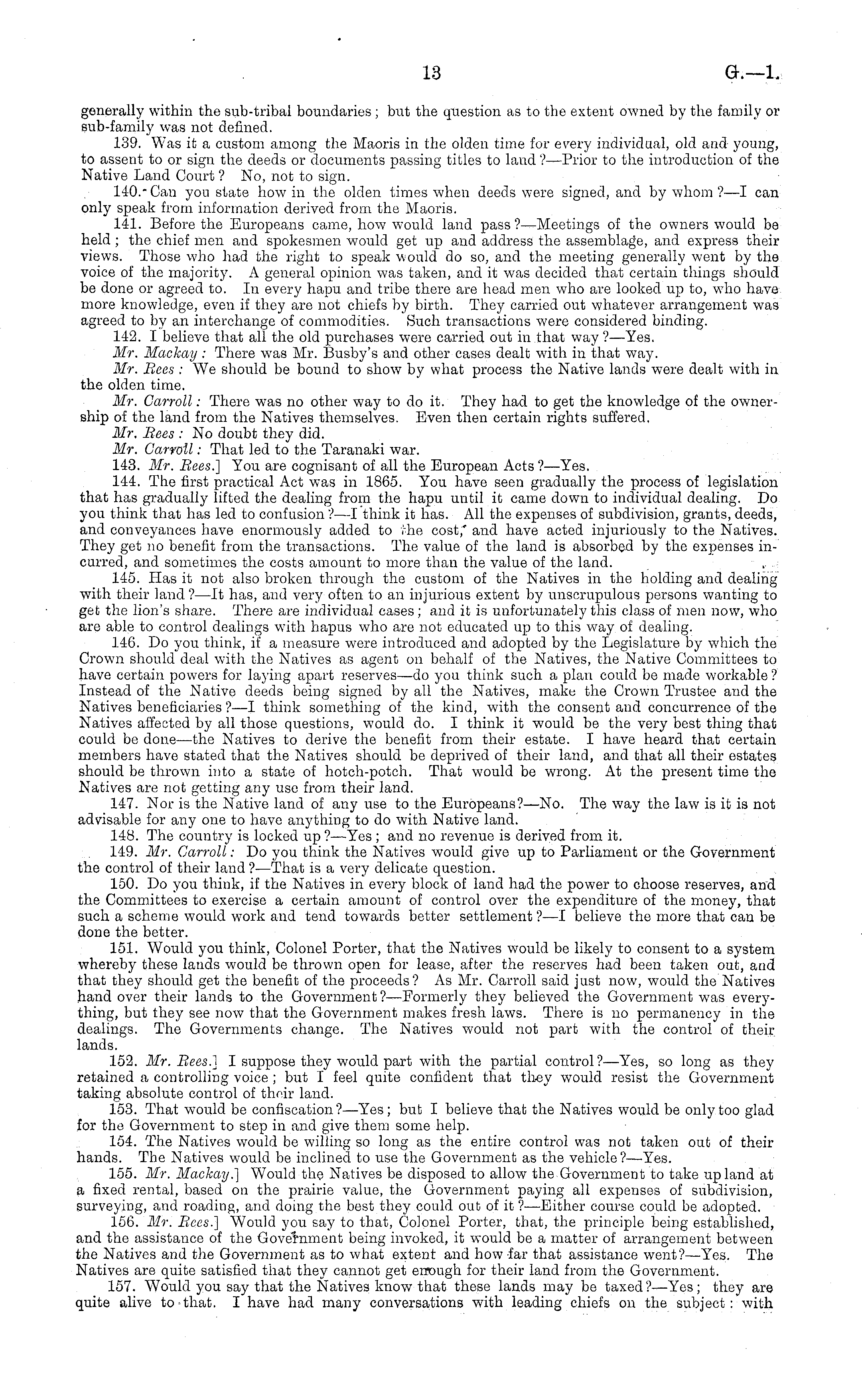generally within the sub-tribal boundaries ; but the question as to the extent owned by the family or sub-family Avas not defined. 139. Was it a custom among the Maoris in the olden time for every individual, old and young, to assent to or sign the deeds or documents passing titles to laud ?—Prior to the introduction of the Native Land Court ? No, not to sign. 140.- Can you state how in the olden times when deeds were signed, and by Avhom ? —I can only speak from information derived from the Maoris. 141. Before the Europeans came, how would land pass ? —Meetings of the owners would be held; the chief men and spokesmen would get up and address the assemblage, and express their views. Those Avho had the right to speak would do so, and the meeting generally went by the voice of the majority. A general opinion was taken, and it was decided that certain things should be done or agreed to. In every hapu and tribe there are head men who are looked up to, who have more knowledge, even if they are not chiefs by birth. They carried out whatever arrangement was agreed to by an interchange of commodities. Such transactions were considered binding. 142. I believe that all the old purchases were carried out in that way ?—Yes. Mr. Mackay: There was Mr. Busby's and other cases dealt with in that way. Mr. Bees : We should be bound to shoAv by what process the Native lands were dealt with in the olden time. Mr. Carroll: There was no other way to do it. They had to get the knowledge of the ownership of the land from the Natives themselves. Even then certain rights suffered. Mr. Bees : No doubt they did. Mr. Carroll: That led to the Taranaki war. 143. Mr. Bees.] You are cognisant of all the European Acts ? —Yes. 144. The first practical Act was in 1865. You have seen gradually the process of legislation that has gradually lifted the dealing from the hapu until it came down to individual dealing. Do you think that has led to confusion ?—I think it has. All the expenses of subdivision, grants, deeds, and conveyances have enormously added to the cost,' and have acted injuriously to the Natives. They get no benefit from the transactions. The value of the land is absorbed by the expenses incurred, and sometimes the costs amount to more than the value of the land. 145. Has it not also broken through the custom of the Natives in the holding and dealing with their land ?—lt has, and very often to an injurious extent by unscrupulous persons wanting to get the lion's share. There are individual cases ; and it is unfortunately this class of men iioaa', who are able to control dealings with hapus who are not educated up to this way of dealing. 146. Do you think, if a measure were introduced and adopted by the Legislature by which the Crown should deal with the Natives as agent on behalf of the Natives, the Native Committees to have certain powers for laying apart reserves—do you think such a plan could be made Avorkable ? Instead of the Native deeds being signed by all the Natives, make the Crown Trustee and the Natives beneficiaries ? —I think something of the kind, with the consent and concurrence of the Natives affected by all those questions, would do. I think it would be the very best thing that could be done—the Natives to derive the benefit from their estate. I have heard that certain members have stated that the Natives should be deprived of their land, and that all their estates should be throAvn into a state of hotch-potch. That Avould be Avrong. At the present time the Natives are not getting any use from their land. 147. Nor is the Native land of any use to the Europeans?—No. The Avay the law is it is not advisable for any one to have anything to do with Native land. 148. The country is locked up ? —Yes ; and no revenue is derived from it. 149. Mr. Carroll: Do you think the Natives would give up to Parliament or the Government the control of their land ?—That is a very delicate question. 150. Do you think, if the Natives in every block of land had the power to choose reserves, and the Committees to exercise a certain amount of control over the expenditure of the money, that such a scheme would work and tend towards better settlement ? —I believe the more that can be done the better. 151. Would you think, Colonel Porter, that the Natives would be likely to consent to a system whereby these lands avoulc! be thrown open for lease, after the reserves had been taken out, and that they should get the benefit of the proceeds? As Mr. Carroll said just now, Avould the Natives hand over their lands to the Government ? —Formerly they belieA'ed the Government was everything, but they see iioav that the Government makes fresh laws. There is no permanency in the dealings. The Governments change. The Natives would not part with the control of thenlands. 152. Mr. Bees.] I suppose they would part with the partial control?—Yes, so long as they retained a controlling voice ; but I feel quite confident that they would resist the Government taking absolute control of their land. 153. That would be confiscation ?—Yes ; but I believe that the Natives would be only too glad for the Government to step in and give them some help. 154. The Natives Avould be willing so long as the entire control was not taken out of their hands. The Natives would be inclined to use the Government as the vehicle?—Yes. 155. Mr. Mackay.] Would the Natives be disposed to allow the Government to take upland at a fixed rental, based on the prairie value, the Government paying all expenses of subdivision, surveying, and roading, and doing the best they could out of it ? —Either course could be adopted. 156. Mr. Bees.] Would you say to that, Colonel Porter, that, the principle being established, and the assistance of the Government being invoked, it Avould be a matter of arrangement between the Natives and the Government as to what extent and lioav far that assistance went?—Yes. The Natives are quite satisfied that they