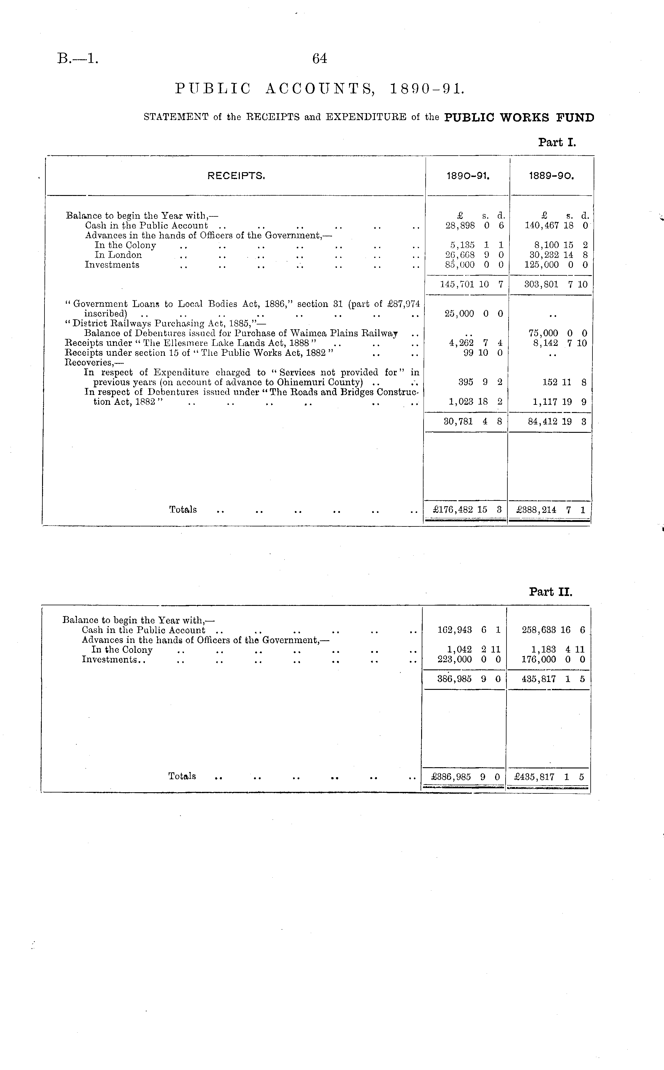 'an RECEIPTS. 1890-91. 1889-90. Balance to begin the Year with, — Cash in the Public Aocount Advances in the hands of Officers of the Government, — In the Colony In London .. .. ... Investments .. .. .. £ s. a. 28,898 0 6 5,135 1 1 26,668 9 0 85,000 0 0 £ s. d. 140,467 18 0 8,100 15 2 30,232 14 8 125,000 0 0 " Government Loans to Local Bodies Act, 1886," section 31 (part of £87,974 inscribed) " District Railways Purchasing Act, 1885," — Balance of Debentures issued for Purchase of Waimea Plains Railway Receipts under " The Ellesmere Lake Lands Act, 1888 " Receipts under section 15 of " The Public Works Act, 1882 " Recoveries, — In respect of Expenditure charged to "Services not provided for" in previous years (on account of advance to Ohinemuri County) .. In respect of Debentures issued under "The Roads and Bridges Construction Act, 1882 " 145,701 10 7 303,801 7 10 25,000 0 0 4,262 7 4 99 10 0 75,000 0 0 8,142 7 10 395 9 2 152 11 8 1,023 18 2 1,117 19 9 30,781 4 8 84,412 19 3 Totals £176,482 15 3 £388,214 7 1 Part II. Balance to begin the Year with, — Cash in the Public Account Advances in the hands of Officers of the Government, — In the Colony Investments.. 162,943 G 1 1,042 2 11 223,000 0 0 258,633 16 6 1,183 4 11 176,000 0 0 386,985 9 0 435,817 1 5 Totals £386,985 9 0 £435,817 1 5