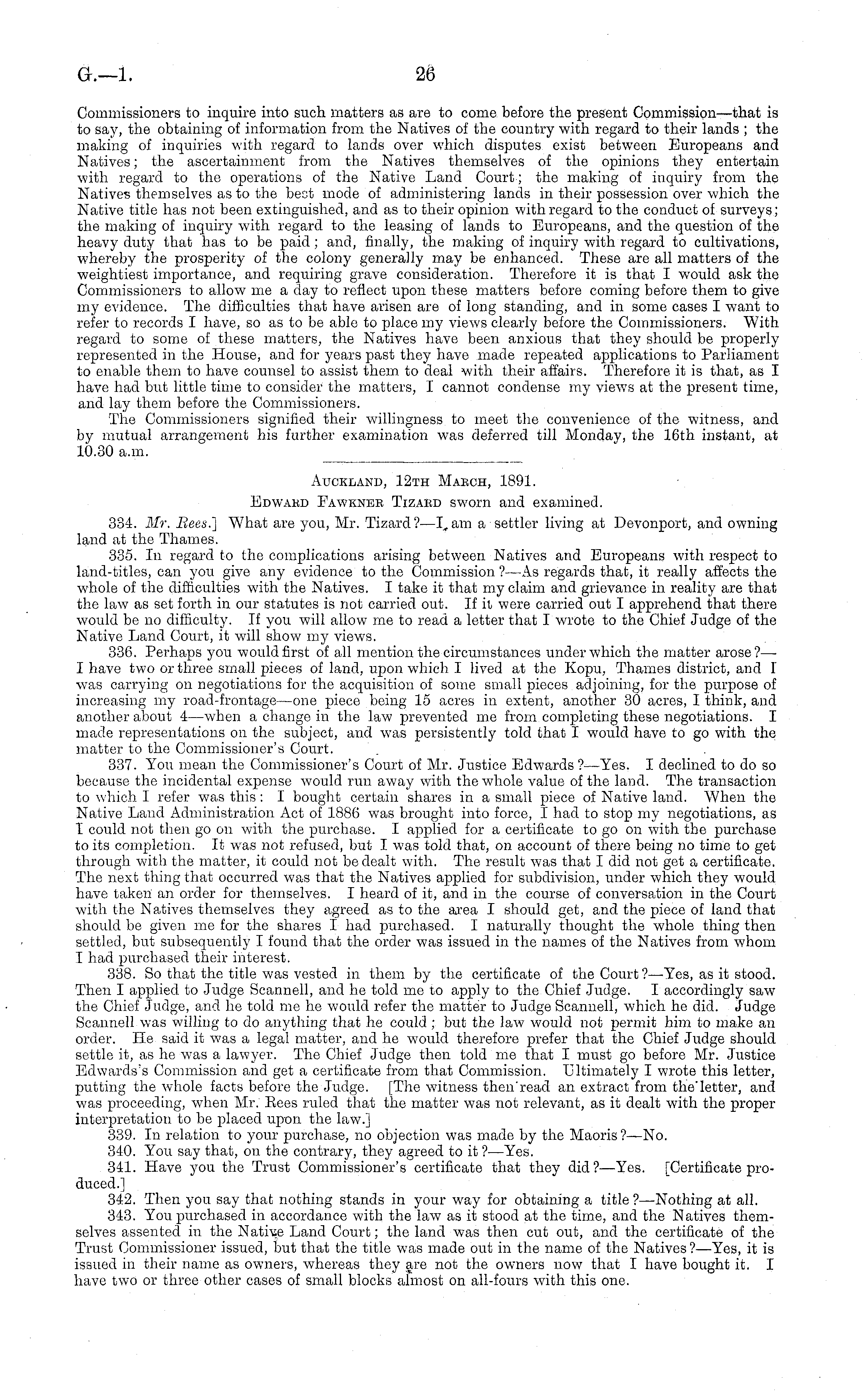 Auckland, 12th March, 1891. Edward Fawkner Tizard sworn and examined. 334. Mr. Bees.] What are you, Mr. Tizard? —I,am a settler living at Devonport, and owning land at the Thames. 335. In regard to the complications arising between Natives and Europeans with respect to land-titles, can you give any eA'idence to the Commission ? —As regards that, it really affects the Avhole of the difficulties AA'ith the Natives. I take it that my claim and grievance in reality are that the IaAV as set forth in our statutes is not carried out. If it were carried out I apprehend that there would be no difficulty. If you will allow me to read a letter that I wrote to the Chief Judge of the Native Land Court, it will show my views. 336. Perhaps you would first of all mention the circumstances under Avhich the matter arose?— I have two or three small pieces of land, upon which I lived at the Kopu, Thames district, and I Avas carrying on negotiations for the acquisition of some small pieces adjoining, for the purpose of increasing my road-frontage—one piece being 15 acres in extent, another 30 acres, I think, and another about 4 —when a change in the law prevented me from completing these negotiations. I made representations on the subject, and was persistently told that I would have to go with the matter to the Commissioner's Court. 337. You mean the Commissioner's Court of Mr. Justice Edwards ?—Yes. I declined to do so because the incidental expense Avould run away AA'ith the whole value of the land. The transaction to Avhich I refer was this : I bought certain shares in a small piece of Native land. When the Native Land Administration Act of 1886 was brought into force, I had to stop my negotiations, as 1 could not then go on Avith the purchase. I applied for a certificate to go on Avith the purchase to its completion. It was not refused, but I was told that, on account of there being no time to get through with the matter, it could not be dealt with. The result was that I did not get a certificate. The next thing that occurred was that the Natives applied for subdivision, under Avhich they would have taken an order for themselves. I heard of it, and in the course of conversation in the Court Avith the Natives themselves they agreed as to the area I should get, and the piece of land that should be given me for the shares I had purchased. I naturally thought the whole thing then settled, but subsequently I found that the order was issued in the names of the Natives from Avhom I had purchased their interest. 338. So that the title Avas vested in them by the certificate of the Court?—Yes, as it stood. Then I applied to Judge Scannell, and he told me to apply to the Chief Judge. I accordingly saw the Chief Judge, and he told me he Avould refer the matter to Judge Scannell, which he did. Judge Scannell Avas Avilling to do anything that he could ; but the IaAV Avould not permit him to make an order. He said it Avas a legal matter, and he would therefore prefer that the Chief Judge should settle it, as he was a laAvyer. The Chief Judge then told me that I must go before Mr. Justice Edwards's Commission and get a certificate from that Commission. Ultimately I wrote this letter, putting the AA'hole facts before the Judge. [The Avitness then'read an extract from the letter, and was proceeding, when Mr. Rees ruled that the matter was not relevant, as it dealt with the proper interpretation to be placed upon the law.] 339. In relation to your purchase, no objection was made by the Maoris ? —No. 340. You say that, on the contrary, they agreed to it ?—Yes. 341. Have you the Trust Commissioner's certificate that they did?—Yes. [Certificate produced.] 342. Then you say that nothing stands in your way for obtaining a title?—Nothing at all. 343. You purchased in accordance Avith the IaAV as it stood at the time, and the Natives themselves assented in the Nativ.e Land Court; the land was then cut out, and the certificate of the Trust Commissioner issued, but that the title was made out in the name of the Natives ?—Yes, it is issued in their name as OAvners, whereas they are not the o\A 7ners now that I have bought it. I have two or three other cases of small blocks almost on all-fours AA'ith this one.