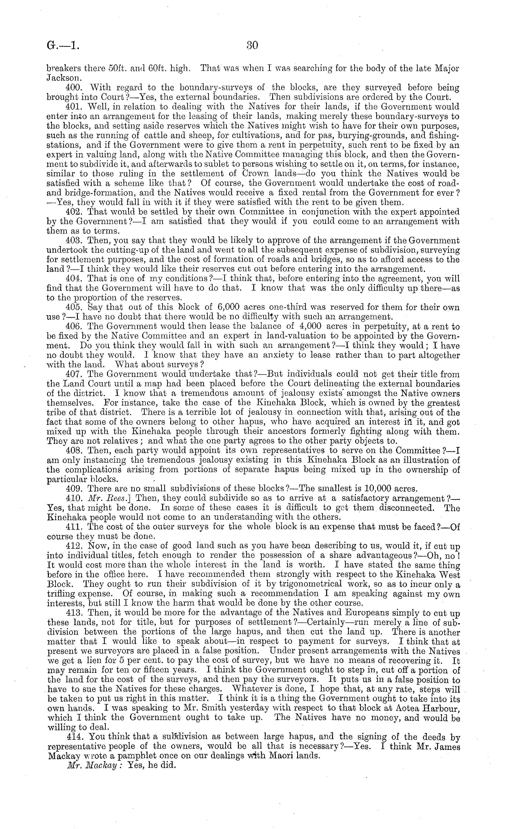 breakers there 50ft. and 60ft. high. That Avas when I was searching for the body of the late Major Jackson. 400. With regard to the boundary-surveys of the blocks, are they surveyed before being brought into Court?—Yes, the external boundaries. Then subdivisions are ordered by the Court. 401. Well, in relation to dealing with the Natives for their lands, if the Government would enter into an arrangement for the leasing of their lands, making merely these boundary-surveys to the blocks, and setting aside reserves which the Natives might Avish to have for their own purposes, such as the running of cattle and sheep, for cultivations, and for pas, burying-grotinds, and fishingstations, and if the Government were to give them a rent in perpetuity, such rent to be fixed by an expert in valuing land, along with the NatiA'e Committee managing this block, and then the Government to subdivide it, and afterwards to sublet to persons Avishing to settle on it, on terms, for instance, similar to those ruling in the settlement of Crown lands—do you think the Natives would be satisfied with a scheme like that ? Of course, the Government would undertake the cost of roadand bridge-formation, and the Natives would receive a fixed rental from the Government for ever ? ■ —Yes, they would fall in with it if they were satisfied with the rent to be given them. 402. That Avould be settled by their own Committee in conjunction Avith the expert appointed by the Government ? —I am satisfied that they would if you could come to an arrangement With them as to terms. 403. Then, you say that they Avould be likely to approve of the arrangement if the Government undertook the cutting-up of the land and Avent to all the subsequent expense of subdivision, surveying for settlement purposes, and the cost of formation of roads and bridges, so as to afford access to the land ?—I think they would like their reserves cut out before entering into the arrangement. 404. That is one of my conditions? —I think that, before entering into the agreement, you will find that the GoA'ernment will have to do that. I know that was the only difficulty up there—as to the proportion of the reserves. 405. Say that out of this Mock of 6,000 acres one-third was reserved for them for their own use ? —I have no doubt that there would be no difficulty with such an arrangement. 406. The Government would then lease the balance of 4,000 acres in perpetuity, at a rent to be fixed by the Native Committee and an expert in land-valuation to be appointed by the Government. Do you think they would fall in with such an arrangement ?—I think they would ; I have no doubt they would. I knoAv that they haA'e an anxiety to lease rather than to part altogether Avith the land. What about surveys ? 407. The Government would undertake that? —But individuals could not get their title from the Land Court until a map had been placed before the Court delineating the external boundaries of the district. I know that a tremendous amount of jealousy exists' amongst the Native owners themselves. For instance, take the case of the Kinehaka Block, which is owned by the greatest tribe of that district. There is a terrible lot of jealousy in connection with that, arising out of the fact that some of the owners belong to other hapus, Avho have acquired an interest ifl it, and got mixed up with the Kinehaka people through their ancestors formerly fighting along with them. They are not relatives ; and what the one party agrees to the other party objects to. 408. Then, each party Avould appoint its own representatives to servo on the Committee ? —I am only instancing the tremendous jealousy existing in this Kinehaka Block as an illustration of the complications arising from portions of separate hapus being mixed up in the ownership of particular blocks. 409. There are no small subdivisions of these blocks ? —The smallest is 10,000 acres. 410. Mr. Bees.] Then, they could subdivide so as to arrive at a satisfactory arrangement?— Yes, that might be done. In some of these cases it is difficult to get them disconnected. The Kinehaka people would not come to an understanding with the others. 411. The cost of the outer surveys for the whole block is an expense that must be faced?—Of course they must be done. 412. Now, in the case of good land such as you have bean describing to us, would it, if cut up into individual titles, fetch enough to render the possession of a share advantageous ?—Oh, no ! It would cost more than the whole interest in the land is worth. I have stated the same thing before in the office here. I haA'e recommended them strongly with respect to the Kinehaka West Block. They ought to run their subdivision of it by trigonometrical Avork, so as to incur only a trifling expense. Of course, in making such a recommendation I am speaking against my own interests, but still I know the harm that would be done by the other course. 413. Then, it would be more for the advantage of the Natives and Europeans simply to cut up these lands, not for title, but for purposes of settlement ?—Certainly —run merely a line of subdivision between the portions of the large hapus, and then cut the land up. There is another matter that I would like to speak about—in respect to payment for surveys. I think that at present we surveyors are placed in a false position. Under present arrangements with the Natives we get a lien for 5 per cent, to pay the cost of survey, but Ave have no means of recovering it. It may remain for ten or fifteen years. I think the Government ought to step in, cut off a portion of the land for the cost of the surveys, and then pay the surveyors. It puts us in a false position to have to sue the Natives for these charges. Whatever is done, I hope that, at any rate, steps will be taken to put us right in this matter. I think it is a thing the Government ought to take into its own hands. I Avas speaking to Mr. Smith yesterday Avith respect to 