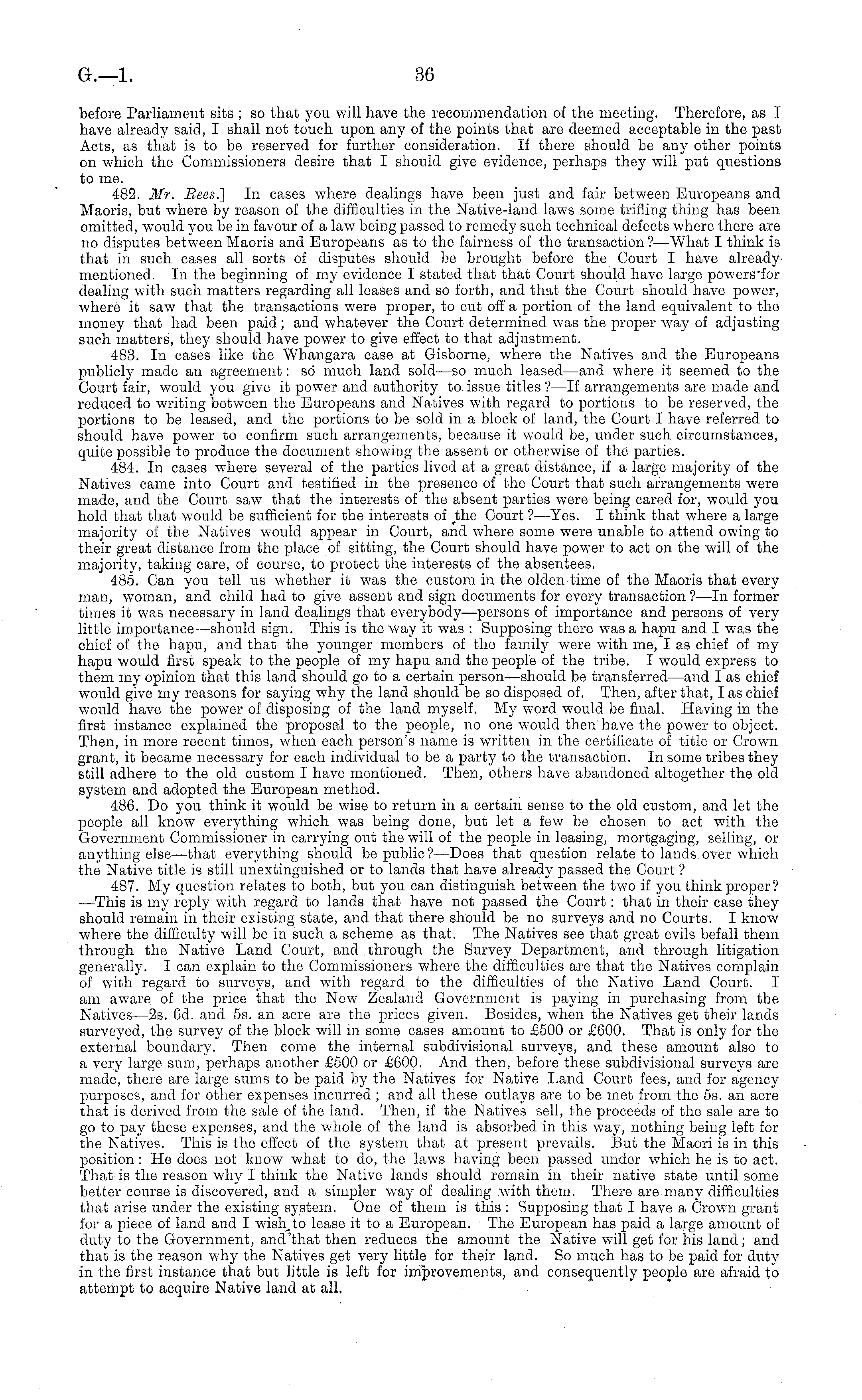 before Parliament sits ;so that you Avill have the recommendation of the meeting. Therefore, as I have already said, I shall not touch upon any of the points that are deemed acceptable in the past Acts, as that is to be reserved for further consideration. If there should be any other points on Avhich the Commissioners desire that I should give evidence, perhaps they will put questions to me. 482. Mr. Bees.] In cases where dealings have been just and fair between Europeans and Maoris, but where by reason of the difficulties in the Native-land laws some trifling thing has been omitted, would you be in favour of a law being passed to remedy such technical defects where there are no disputes between Maoris and Europeans as to the fairness of the transaction?.—What I think is that in such cases all sorts of disputes should be brought before the Court I have alreadymentioned. In the beginning of my evidence I stated that that Court should have large powers "for dealing with such matters regarding all leases and so forth, and that the Court should have power, Avhere it saw that the transactions were proper, to cut off a portion of the land equivalent to the money that had been paid; and whatever the Court determined was the proper way of adjusting such matters, they should have power to give effect to that adjustment. 483. In cases like the Whangara case at Gisborne, Avhere the Natives and the Europeans publicly made an agreement: so much land sold—so much leased—and where it seemed to the Court fair, AA'ould you give it power and authority to issue titles ?—lf arrangements are made and reduced to writing between the Europeans and Natives with regard to portions to be reserved, the portions to be leased, and the portions to be sold in a block of land, the Court I have referred to should haA'e power to confirm such arrangements, because it would be, under such circumstances, quite possible to produce the document showing the assent or otherwise of the parties. 484. In cases where several of the parties lived at a great distance, if a large majority of the Natives came into Court and testified in the presence of the Court that such arrangements were made, and the Court saAV that the interests of the absent parties were being cared for, Avould you hold that that Avould be sufficient for the interests of o the Court ?—Yes. I think that Avhere a large majority of the Natives would appear in Court, and where some were unable to attend owing to their great distance from the place of sitting, the Court should have power to act on the will of the majority, taking care, of course, to protect the interests of the absentees. 485. Can you tell us Avhether it was the custom in the olden time of the Maoris that every man, woman, and child had to give assent and sign documents for every transaction ?—ln former times it was necessary in land dealings that everybody—persons of importance and persons of very little importance —should sign. This is the way it was : Supposing there Avas a hapu and I was the chief of the hapu, and that the younger members of the family were with me, I as chief of my hapu Avould first speak to the people of my hapu and the people of the tribe. I would express to them my opinion that this land should go to a certain person —should be transferred—and I as chief Avould give my reasons for saying why the land should be so disposed of. Then, after that, las chief would have the power of disposing of the land myself. My word would be final. Having in the first instance explained the proposal to the people, no one Avould then'have the power to object. Then, in more recent times, when each person's name is written in the certificate of title or Crown grant, it became necessary for each individual to be a party to the transaction. In some tribes they still adhere to the old custom I have mentioned. Then, others have abandoned altogether the old system and adopted the European method. 486. Do you think it would be Avise to return in a certain sense to the old custom, and let the people all knoAV everything Avhich was being done, but let a feAv be chosen to act with the Government Commissioner in carrying out the will of the people in leasing, mortgaging, selling, or anything else —that everything should be public?—Does that question relate to lands.over AA'hich the Native title is still unextinguished or to lands that have already passed the Court ? 487. My question relates to both, but you can distinguish between the two if you think proper? —This is my reply Avith regard to lands that have not passed the Court : that in their case they should remain in their existing state, and that there should be no surveys and no Courts. I know where the difficulty will be in such a scheme as that. The Natives see that great evils befall them through the Native Land Court, and through the Survey Department, and through litigation generally. I can explain to the Commissioners where the difficulties are that the NatiA'es complain of Avith regard to surveys, and with regard to the difficulties of the NatiA'e Land Court. I am aAvare of the price that the New Zealand Government is paying in purchasing from the Natives—2s. 6d. and ss. an acre are the prices giA'en. Besides, when the Natives get their lands surveyed, the survey of the block will in some cases amount to £500 or £600. That is only for the external boundary. Then come the internal subdivisional surveys, and these amount also to a very large sum, perhaps another £500 or £600. And then, before these subdivisional surveys are made, there are large sums to be paid by the Natives for Native Land Court fees, and for agency purposes, and for other expenses incurred ; and all these outlays are to be met from the ss. an acre that is derived from the sale of the land. Then, if the Natives sell, the proceeds of the sale are to go to pay these expenses, and the whole of the land is absorbed in this way, nothing being left for th