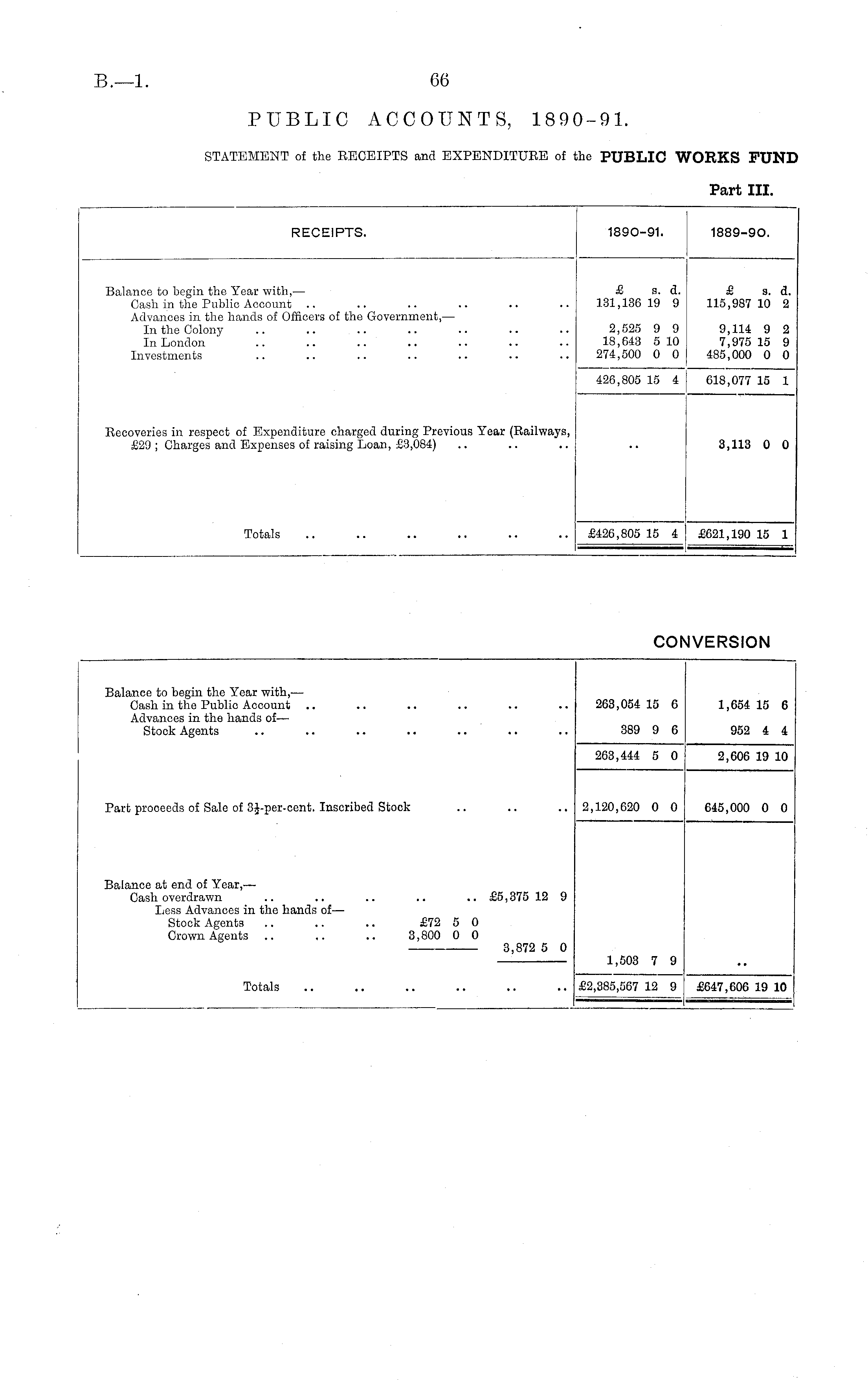 'ar RECEIPTS. 1890-91. 1889-9O. Balance to begin the Year with, — Gash in the Public Account Advances in the hands of Officers of the Government, — In the Colony In London Investments £ s. d. 131,136 19 9 2,525 9 9 18,843 5 10 274,500 0 0 £ s. d. 115,987 10 2 9,114 9 2 7,975 15 9 485,000 0 0 426,805 15 4 618,077 15 1 Recoveries in respect of Expenditure charged during Previous Year (Railways, £29 ; Charges and Expenses of raising Loan, £3,084) 3,113 0 0 Totals £426,805 15 4 £621,190 15 1 CO VERSION Balanee to begin the Year with, — Gash in the Public Account Advances in the hands of — Stock Agents 263,054 15 6 389 9 6 1,654 15 6 952 4 4 263,444 5 0 2,606 19 10 Part prooeeds of Sale of 3£-per-cent. Inscribed Stock 2,120,620 0 0 645,000 0 0 Balance at end of Year, — Cash overdrawn .. .. .. .. .. £5,375 12 9 Less Advances in the hands of — Stock Agents .. .. .. £72 5 0 Crown Agents .. ,. .. 3,800 0 0 3,872 5 0 1,503 7 9 Totals £2,385,567 12 9 £647,606 19 10