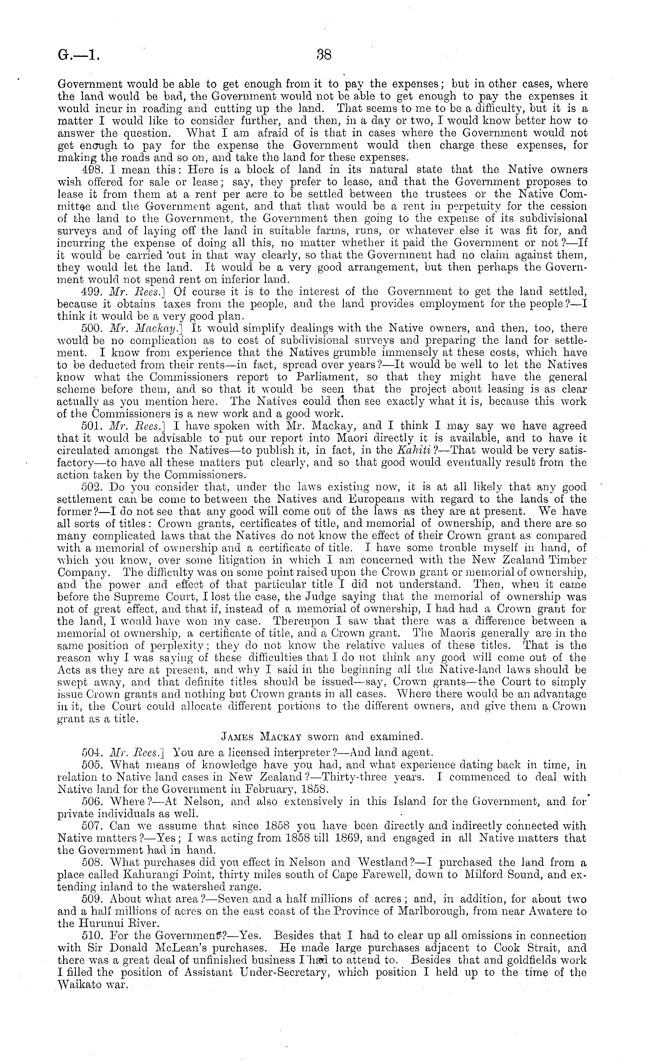 Government would be able to get enough from it to pay the expenses; but in other cases, where the land Avould be bad, the Government Avould not be able to get enough to pay the expenses it would incur in roading and cutting up the land. That seems to me to be a difficulty, but it is a matter I would like to consider further, and then, in a clay or two, I would know better how to answer the question. What lam afraid of is that in cases where the Government would not get enough to pay for the expense the Government would then charge these expenses, for making the roads and so on, and take the land for these expenses. 498. I mean this: Here is a block of land in its natural state that the Native owners wish offered for sale or lease; say, they prefer to lease, and that the Government proposes to lease it from them at a rent per acre to be settled between the trustees or the Native Committee and the Government agent, and that that Avould be a rent in perpetuity for the cession of the land to the Government, the Government then going to the expense of its subdivisional surveys and of laying off the land in suitable farms, runs, or whatever else it Avas fit for, and incurring the expense of doing all this, no matter Avhether it paid the Government or not ? —lf it Avould be carried 'out in that Avay clearly, so that the Government had no claim against them, they Avould let the land. It would be a very good arrangement, but then perhaps the Government Avould not spend rent on inferior land. 499. Mr. Bees.] Of course it is to the interest of the Government to get the land settled, because it obtains taxes from the people, and the land provides employment for the people ?—I think it Avould be a very good plan. 500. Mr. Mackay.] It would simplify dealings with the Native owners, and then, too, there Avould be no complication as to cost of subdivisional surveys and preparing the land for settlement. I know from experience that the Natives grumble immensely at these costs, which have to be deducted from their rents —in fact, spread over years ?—lt would be well to let the Natives know what the Commissioners report to Parliament, so that they might have the general scheme before them, and so that it would be seen that the project about leasing is as clear actually as you mention here. The Natives could then see exactly AA'hat it is, because this Avork of the Commissioners is a neAv Avork and a good work. 501. Mr. Bees.] I have spoken AA'ith Mr. Mackay, and I think I may say we have agreed that it would be advisable to put our report into Maori directly it is available, and to have it circulated amongst the NatiA'es —to publish it, in fact, in the Kahiti ?—That would be very satisfactory —to have all these matters put clearly, and so that good would eventually result from the action taken by the Commissioners. 502. Do you consider that, under the laws existing now, it is at all likely that any good settlement can be come to between the Natives and Europeans with regard to the lands of the former?—l do not see that any good will come out of the laws as they are at present. We haA'e all sorts of titles: Crown grants, certificates of title, and memorial of ownership, and there are so many complicated laws that the NatiA'es do not know the effect of their Crown grant as compared Avith a memorial of ownership and a certificate of title. I have some trouble myself in hand, of Avhich you know, OA'er some litigation in Avhich I am concerned with the NeAv Zealand Timber Company. The difficulty was on some point raised upon the Crown grant or memorial of ownership, and the power and effect of that particular title I did not understand. Then, when it came before the Supreme Court, I lost the case, the Judge saying that the memorial of ownership was not of great effect, and that if, instead of a memorial of ownership, I had had a Crown grant for the land, I would have Avon my case. Thereupon I saw that there was a difference betAveen a memorial of ownership, a certificate of title, and a Crown grant. The Maoris generally are in the same position of perplexity; they do not know the relative values of these titles. That is the reason why I was saying of these difficulties that I do not think any good will come out of the Acts as they are at present, and why I said in the beginning all the Native-land laAvs should be swept aAA'ay, and that definite titles should be issued —say, Crown grants —the Court to simply issue Crown grants and nothing but CroAvn grants in all cases. Where there would be an advantage in it, the Court could allocate different portions to the different owners, and give them a Crown grant as a title. James Mackay sworn and examined. 504. Mr. Bees.] You are a licensed interpreter?—And land agent. 505. What means of knowledge haA'e you had, and vvhat experience dating back in time, in relation to Native land cases in New Zealand ?—Thirty-three years. I commenced to deal with Native land for the Government in February, 1858. 506. Where?—At Nelson, and also extensively in this Island for the Government, and for private individuals as well. 507. Can Ave assume that since 1858 you have been directly and indirectly connected with Native matters ? —Yes; I was acting from 1858 till 1869, and engaged in all Native matters that the Government had in hand. 508. What purchases did you effect in Nelson and Westland?—l purchased the land from a place called Kahurangi Point, thirty miles south of Cape Farewell, down to Milford Sound, and extending inland to the watershed range. 509. About what area?—Seven and a half millions of acres; and, in addition, for about two and a half millions of acres on the east coast of the Province of Marlborough, from near AAvatere to the HUrunui River. 510. For the Government?-?—Yes. Besides that I had to clear up all omissions in connection AA'ith Sir Donald McLean's purchases. He made large purchases adjacent to Cook Strait, and there was a great