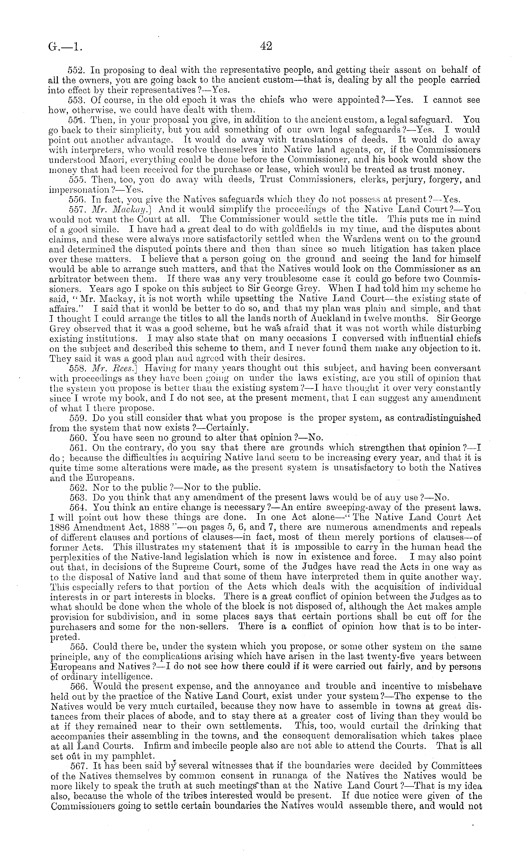 552. In proposing to deal with the representative people, and getting their assent on behalf of all the OAA'ners, you are going back to the ancient custom —that is, dealing by all the people carried into effect by their representatives ?—Yes. 553. Of course, in the old epoch it was the chiefs who were appointed?—Yes. I cannot see how, Otherwise, Ave could have dealt with them. 554. Then, in your proposal you give, in addition to the ancient custom, a legal safeguard. You go back to their simplicity, but you add something of our oavii legal safeguards?—Yes. I would point out another advantage. It would do away with translations of deeds. It would do away with interpreters, who would resolve themselves into Native land agents, or, if the Commissioners understood Maori, everything could be done before the Commissioner, and his book would show the money that had been received for the purchase or lease, AA'hich would be treated as trust money. 555. Then, too, you do away with deeds, Trust Commissioners, clerks, perjury, forgery, and impersonation ?—Yes. 556. In fact, you give the NatiA'es safeguards which they do not possess at present?—Yes. 557. Mr. Mackay.] And it would simplify the proceedings of the Native Land Court?—You would not want the Court at all. The Commissioner Avould settle the title. This puts me in mind of a good simile. I haA'e had a great deal to do with goldfields in my time, and the disputes about claims, and these were always more satisfactorily settled Avhen the Wardens went on to the ground and determined the disputed points there and then than since so much litigation has taken place over these matters. I believe that a person going on the ground and seeing the land for himself would be able to arrange such matters, and that the Natives would look on the Commissioner as an arbitrator between them. If there was any very troublesome case it could go before tAvo Commissioners. Years ago I spoke on this subject to Sir George Grey. When I had told him my scheme he said, "Mr. Mackay, it is not worth while upsetting the Native Land Court—the existing state of affairs." I said that it AA'ould be better to do so, and that my plan Avas plain and simple, and that I thought I could arrange the titles to all the lands north of Auckland in tAveh'e months. Sir George Grey observed that it was a good scheme, but he was afraid that it Avas not worth while disturbing existing institutions. I may also state that on many occasions I conversed with influential chiefs on the subject and described this scheme to them, and I never found them make any objection to it. They said it was a good plan and agreed with their desires. 558. Mr. Bees.] Having for many years thought out this subject, and having been conversant with proceedings as they have been going on under the laws existing, are you still of opinion that the system you propose is better than the existing system?—l have thought it over very constantly since I wrote my book, and I do not see, at the present moment, that I can suggest any amendment of Avhat I there propose. 559. Do you still consider that what you propose is the proper system, as contradistinguished from the system that iioav exists ? —Certainly. 560. You have seen no ground to alter that opinion ?—No. 561. On the contrary, do you say that there are grounds Avhich strengthen that opinion ?—I do; because the difficulties in acquiring NatiA'e land seem to be increasing every year, and that it is quite time some alterations were made, as the present system is unsatisfactory to both the NatiA'es and the Europeans. 562. Nor to the public ? —Nor to the public. 563. Do you think that any amendment of the present laAvs would be of any use ? —No. 564. You think an entire change is necessary?—An entire sweeping- aAvay of the present laAvs. I will point out hoAV these things are done. In one Act alone—" The Native Land Court Act 1886 Amendment Act, 1888 "■—on pages 5, 6, and 7, there are numerous amendments and repeals of different clauses and portions of clauses —in fact, most of them merely portions of clauses—of former Acts. This illustrates my statement that it is impossible to carry in the human head the perplexities of the Native-land legislation which is now in existence and force. I may also point out that, in decisions of the Supreme Court, some of the Judges have read the Acts in one way as to the disposal of Native land and that some of them have interpreted them in quite another way. This especially refers to that portion of the Acts AA'hich deals with the acquisition of individual interests in or part interests in blocks. There is a great conflict of opinion between the Judges as to Avhat should be done when the whole of the block is not disposed of, although the Act makes ample provision for subdivision, and in some places says that certain portions shall be cut off for the purchasers and some for the non-sellers. There is a conflict of opinion how that is to be interpreted. 565. Could there be, under the system which you propose, or some other system on the same principle, any of the complications arising which have arisen in the last twenty-five years between Europeans and Natives ? —I do not see how there could if it were carried out fairly, and by persons of ordinary intelligence. 566. Would the present expense, and the annoyance and trouble and incentiA'e to misbehave held out by the practice of the Native Land Court, exist under your system? —The expense to the Natives Avould be very much curtailed, because they now have to assemble in towns at great distances from their places of abode, and to stay there at a greater cost of living than they would be at if they remained near to their own settlements. This, too, would curtail the drinking that accompanies their assembling in the towns, and the consequent demoralisation which takes place at all Land Courts. Infirm and imbecile people also are not able to attend the Cou