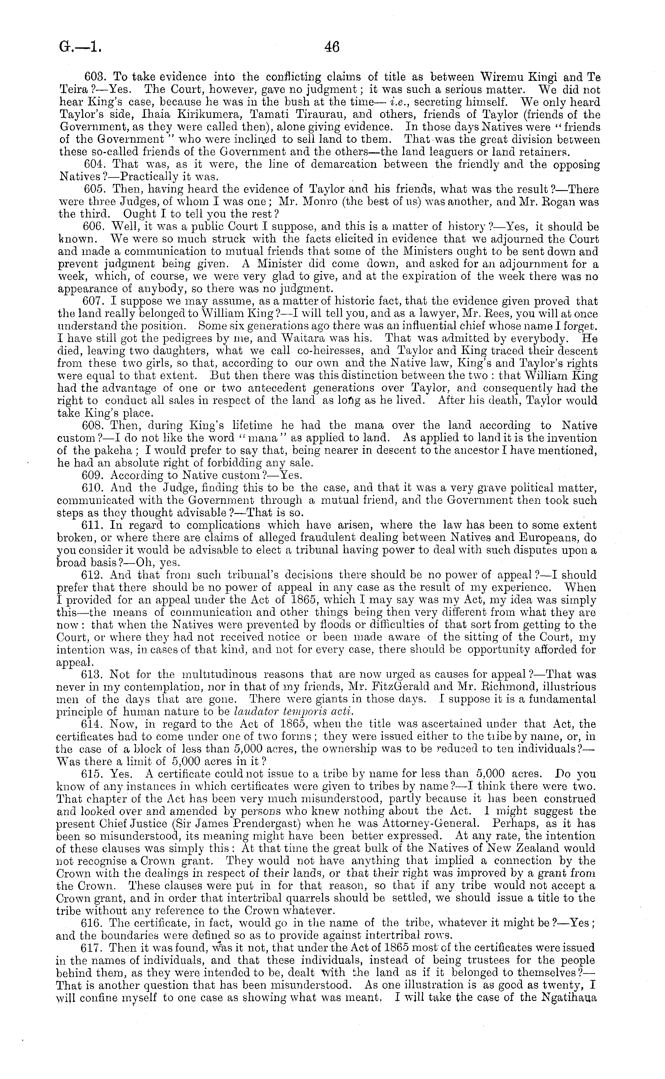 603. To take evidence into the conflicting claims of title as between Wiremu Kingi and Te Teira ?—Yes. The Court, however, gave no judgment; it was such a serious matter. We did not hear King's case, because he was in the bush at the time— i.e., secreting himself. We only heard Taylor's side, Ihaia Kirikumera, Tamati Tiraurau, and others, friends of Taylor (friends of the Government, as they were called then), alone giving evidence. In those days Natives were " friends of the Government " who were inclined to sell land to them. That was the great division betAveen these so-called friends of the Government and the others—the land leaguers or land retainers. 604. That was, as it were, the line of demarcation between the friendly and the opposing Natives?—Practically it Avas. 605. Then, having heard the evidence of Taylor and his friends, what Avas the result ?—There Avere three Judges, of whom I Avas one ; Mr. Monro (the best of us) Avas another, and Mr. Rogan was the third. Ought Ito tell you the rest ? 606. Well, it was a public Court I suppose, and this is a matter of history ?—Yes, it should be known. We were so much struck with the facts elicited in evidence that Ave adjourned the Court and made a communication to mutual friends that some of the Ministers ought to be sent down and prevent judgment being given. A Minister did come down, and asked for an adjournment for a Aveek, Avhich, of course, Ave Avere very glad to give, and at the expiration of the Aveek there Avas no appearance of anybody, so there was no judgment. 607. I suppose we may assume, as a matter of historic fact, that the evidence given proved that the land really belonged to William King ?—I Avill tell you, and as a lawyer, Mr. Rees, you will at once understand the position. Some six generations ago there Avas an influential chief whose name I forget. I have still got the pedigrees by me, and Waitara Avas his. That Avas admitted by everybody. He died, leaving tAvo daughters, what we call co-heiresses, and Taylor and King traced their descent from these two girls, so that, according to our oAvn and the Native law, King's and Taylor's rights Avere equal to that extent. But then there was this distinction betAveen the tAvo : that William King had the advantage of one or two antecedent generations OA'er Taylor, and consequently had the right to conduct all sales in respect of the land as long as he lived. After his death, Taylor AA'ould take King's place. 608. Then, during King's lifetime he had the mana over the land according to Native custom ?—I do not like the Avord " mana "as applied to land. As applied to land it is the invention of the pakeha ; I Avould prefer to say that, being nearer in descent to the ancestor I have mentioned, he had an absolute right of forbidding any sale. 609. According to Native custom ? —Yes. 610. And the Judge, finding this to be the case, and that it Avas a very grave political matter, communicated with the Government through a mutual friend, and the Government then took such steps as they thought advisable ? —That is so. 611. In regard to complications which have arisen, Avhere the law has been to some extent broken, or Avhere there are claims of alleged fraudulent dealing between Natives and Europeans, do you consider it would be advisable to elect a tribunal having poAver to deal Avith such disputes upon a broad basis?—Oh, yes. 612. And that from such tribunal's decisions there should be no poAver of appeal ?—I should prefer that there should be no poAver of appeal in any case as the result of my experience. When I provided for an appeal under the Act of 1865, which I may say was my Act, my idea was simply this —the means of communication and other things being then very different from what they are noAv : that when the Natives Avere prevented by floods or difficulties of that sort from getting to the Court, or where they had not received notice or been made aAvare of the sitting of the Court, my intention was, in cases of that kind, and not for every case, there should be opportunity afforded for appeal. 613. Not for the multitudinous reasons that are now urged as causes for appeal ?—That was never in my contemplation, nor in that of my friends, Mr. FitzGerald and Mr. Richmond, illustrious men of the days that are gone. There were giants in those days. I suppose it is a fundamental principle of human nature to be laudator temporis acti. 6.14. Noav, in regard to the Act of 1865, when the title Avas ascertained under that Act, the certificates had to come under one of tAvo forms ; they were issued either to the tribe by name, or, in the case of a block of less than 5,000 acres, the ownership was to be reduced to ten individuals?—■ Was there a limit of 5,000 acres in it ? 615. Yes. A certificate could not issue to a tribe by name for less than 5,000 acres. Do you know of any instances in which certificates were given to tribes by name?—l think there Avere two. That chapter of the Act has been very much misunderstood, partly because it has been construed and looked over and amended by persons who knew nothing about the Act. I might suggest the present Chief Justice (Sir James Prendergast) AA'hen he Avas Attorney-General. Perhaps, as it has been so misunderstood, its meaning might have been better expressed. At any rate, the intention of these clauses was simply this : At that trine the great bulk of the Natives of Noav Zealand would not recognise a CroAvn grant. They Avould not haA'e anything that implied a connection by the CroAvn with the dealings in respect of their lands, or that their right was improved by a grant from the CroAvn. These clauses were put in for that, reason, so that if any tribe would not accept a Crown grant, and in order that intertribal quarrels should be settled, Ave should issue a title to the tribe without any reference to the CroAvn Avhatever. 616. The certificate, in fact, would go in the name of the tribe, A\'hateA rer it mig