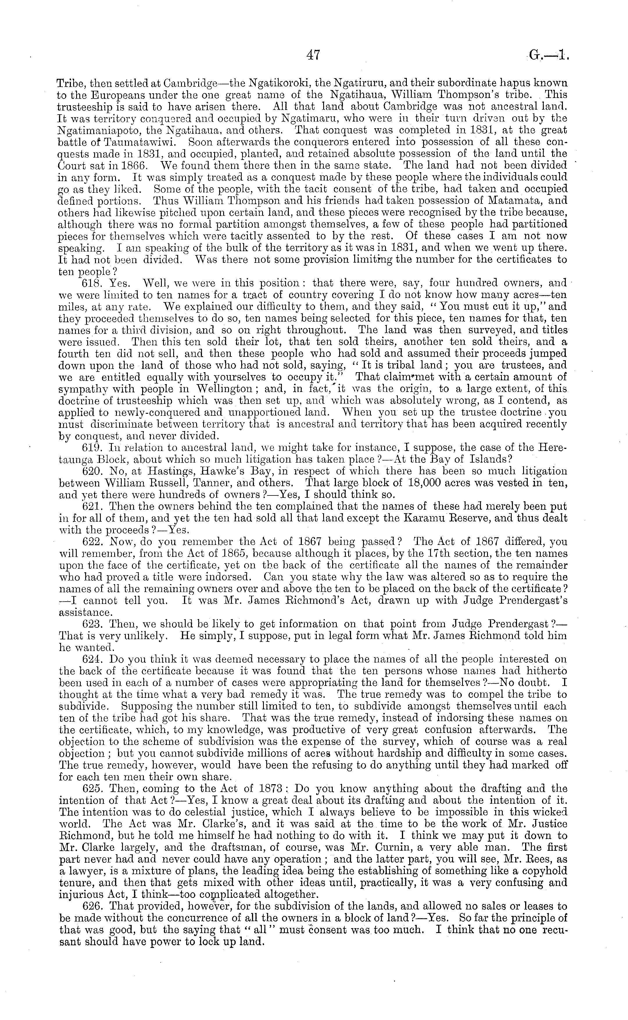 Tribe, then settled at Cambridge —the Ngatikoroki, the Ngatiruru, and their subordinate hapus known to the Europeans under the one great name of the Ngatihaua, William Thompson's tribe. This trusteeship is said to have arisen there. All that land about Cambridge Avas not ancestral land. It was territory conquered and occupied by Ngatimaru, Who were in their turn driven out by the Ngatimaniapoto, the Ngatihaua, and others. That conquest Avas completed in 1831, at tho great battle of TaUmatawiwi. Soon afterwards the conquerors entered into possession of all these conquests made in 1831, and occupied, planted, and retained absolute possession of the land until the Court sat in 1866. We found them there then in the same state. The land had not been divided in any form. It was simply treated as a conquest made by these people where the individuals could go as they liked. Some of the people, with the tacit consent of the tribe, had taken and occupied defined portions. Thus William Thompson and his friends had taken possession of Matamata, and others had likewise pitched upon certain land, and these pieces were recognised by the tribe because, although there was no formal partition amongst themselves, a few of these people had partitioned pieces for themselves which AA'ere tacitly assented to by the rest. Of these cases I am not now speaking. lam speaking of the bulk of the territory as it was in 1831, and Avhen we went up there. It had not been divided. Was there not some provision limiting the number for the certificates to ten people ? 618. Yes. Well, Ave were in this position : that there were, say, four hundred owners, and Ave were limited to ten names for a tract of country covering I do not know hoAV many acres—ten miles, at any rate. We explained our difficulty to them, and they said, " You must cut it up," and they proceeded themselves to do so, ten names being selected for this piece, ten names for that, ten names for a third division, and so on right throughout. The land was then surveyed, and titles were issued. Then this ten sold their lot, that ten sold theirs, another ten sold theirs, and a fourth ten did not sell, and then these people who had sold and assumed their proceeds jumped doAvn upon the land of those who had not sold, saying, "It is tribal land; you are trustees, and Ave are entitled equally Avith yourselves to occupy it." That claim'met Avith a certain amount of sympathy with people in Wellington; and, in fact, it Avas the origin, to a large extent, of this doctrine of trusteeship which was then set up, and which was absolutely wrong, as I contend, as applied to newly-conquered and unapportioned land. When you setup the trustee doctrine ■ you must discriminate between territory that is ancestral and territory that has been acquired recently by conquest, and never divided. 619. In relation to ancestral land, Ave might take for instance, I suppose, the case of the Heretauuga Block, about which so much litigation has taken place ?—At the Bay of Islands? 620. No, at Hastings, Hawke's Bay, in respect of which there has been so much litigation between William Russell, Tanner, and others. That large block of 18,000 acres was vested in ten, and yet there were hundreds of owners ?—Yes, I should think so. 621. Then the owners behind the ten complained that the names of these had merely been put in for all of them, and yet the ten had sold all that land except the Karamu Reserve, and thus dealt AA'ith the proceeds ?—Yes. 622. Now, do you remember the Act of 1867 being passed? The Act of 1867 differed, you will remember, from the Act of 1865, because although it places, by the 17th section, the ten names upon the face of the certificate, yet on the back of the certificate all the names of the remainder who had proved a title were indorsed. Can you state why the law was altered so as to require the names of all the remaining owners over and above the ten to be placed on the back of the certificate ? —I cannot tell you. It was Mr. James Richmond's Act, drawn up with Judge Prendergast's assistance. 623. Then, we should be likely to get information on that point from Judge Prendergast ?— That is very unlikely. He simply, I suppose, put in legal form what Mr. James Richmond told him he wanted. 624. Do you think it was deemed necessary to place the names of all the people interested on the back of the certificate because it was found that the ten persons whose names had hitherto been used in each of a number of cases were appropriating the land for themselves ?—No doubt. I thought at the time what a very bad remedy it was. The true remedy was to compel the tribe to subdivide. Supposing the number still limited to ten, to subdivide amongst themselves until each ten of the tribe had got his share. That was the true remedy, instead of indorsing these names on the certificate, which, to my knowledge, was productive of very great confusion afterwards. The objection to the scheme of subdivision Avas the expense of the survey, which of course Avas a real objection ; but you cannot subdivide millions of acres without hardship and difficulty in some cases. The true remedy, however, would have been the refusing to do anything until they had marked off for each ten men their own share. 625. Then, coming to the Act of 1873 :. Do you know anything about the drafting and the intention of that Act ?—Yes, I know a great deal about its drafting and about the intention of it. The intention was to do celestial justice, which I always believe to be impossible in this wicked world. The Act was Mr. Clarke's, and it was said at the time to be the work of Mr. Justice Richmond, but he told me himself he had nothing to do with it. I think we may put it doAvn to Mr. Clarke largely, and the draftsman, of course, was Mr. Curnin, a very able man. The first part never had and never could have any operation ; and the latter part, you will see, Mr. Rees, as a lawyer, is a mixture of plans, the lead
