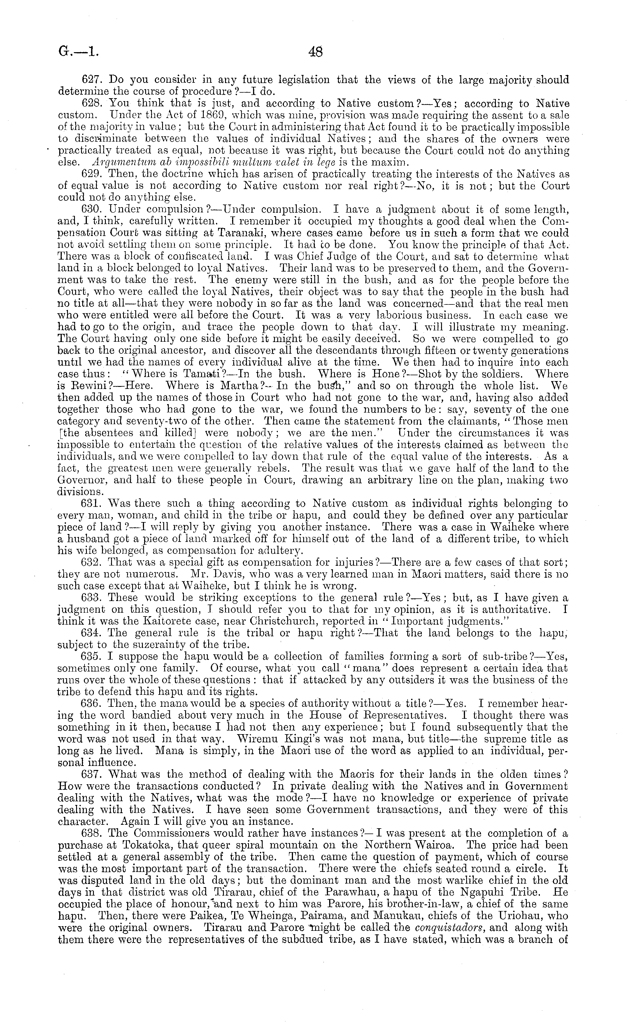 627. Do you consider in any future legislation that the views of the large majority should determine the course of procedure ?—I do. 628. You think that is just, and according to NatiA'e custom ?—Yes; according to Native custom. Under the Act of 1869, which was mine, provision was made requiring the assent to a sale of the majority in value ; but the Court in administering that Act found it to be practically impossible to discriminate between the values of individual Natives; and the shares of the oAvners were practically treated as equal, not because it was right, but because the Court could not do anything else. Argumentum ab invpossibili multum valet in lege is the maxim. 629. Then, the doctrine which has arisen of practically treating the interests of the Natives as of equal value is not according to NatiA'e custom nor real right?—No, it is not; but the Court could not do anything else. 630. Under compulsion ?—Under compulsion. I have a judgment about it of some length, and, I think, carefully written. I remember it occupied my thoughts a good deal when the Compensation Court Avas sitting at Taranaki, where cases came before us in such a form that we could not aA'oid settling them on some principle. It had to be done. You know the principle of that i\.ct. There was a block of confiscated land. I was Chief Judge of the Court, and sat to determine what land in a block belonged to loyal Natives. Their land AA'as to be preserved to them, and the Government Avas to take the rest. The enemy were still in the bush, and as for the people before the Court, who Avere called the loyal Natives, their object was to say that the people in the bush had no title at all—that they were nobody in so far as the land was concerned—and that the real men who were entitled were all before the Court. It was a very laborious business. In each case Ave had to go to the origin, and trace the people down to that day. I will illustrate my meaning. The Court haA'ing only one side before it might be easily deceived. So we were compelled to go back to the original ancestor, and discover all the descendants through fifteen or twenty generations until we had the names of every individual alive at the time. We then had to inquire into each case thus : " Where is Tamati?—ln the bush. Where is Hone?—Shot by the soldiers. Where is Rewini?—Here. Where is Martha?- In the bush," and so on through the whole list. We then added up the names of those in Court who had not gone to the war, and, having also added together those Avho had gone to the Avar, Ave found the numbers to be : say, seventy of the one category and seventy-two of the other. Then came the statement from the claimants, " Those men [the absentees and killed] were nobody; Ave are the men." Under the circumstances it was impossible to entertain the question of the relative values of the interests claimed as betAveen the individuals, and Ave were compelled to lay doAvn that rule of the equal value of the interests. As a fact, the greatest men were generally rebels. The result was that A\e gave half of the land to the Governor, and half to these people in Court, draAving an arbitrary line on the plan, making two divisions. 631. Was there such a thing according to Native custom as individual rights belonging to every man, woman, and child in the tribe or hapu, and could they be defined over any particular piece of land ?—I will reply by giving you another instance. There was a case in Waiheke where a husband got a piece of laud marked off for himself out of the land of a different tribe, to Avhich his wife belonged, as compensation for adultery. 632. That was a special gift as compensation for injuries?—There are a few cases of that sort; they are not numerous. Mr. Davis, who was a very learned man in Maori matters, said there is no such case except that at Waiheke, but I think he is wrong. 633. These would be striking exceptions to the general rule ?—Yes; but, as I have given a judgment on this question, I should refer you to that for my opinion, as it is authoritative. I think it was the Kaitorete case, near Christchurch, reported in "Important judgments." 634. The general rule is the tribal or hapu right ?—That the land belongs to the hapu, subject to the suzerainty of the tribe. 635. I suppose the hapu would be a collection of families forming a sort of sub-tribe?—Yes, sometimes only one family. Of course, what you call " mana " does represent a certain idea that runs over the whole of these questions : that if attacked by any outsiders it was the business of the tribe to defend this hapu and its rights. 636. Then, the mana would be a species of authority without a title? —Yes. I remember hearing the word bandied about very much in the House of Representatives. I thought there was something in it then, because I had not then any experience; but I found subsequently that the word was not used in that way. Wiremu Kingi's was not mana, but title—the supreme title as long as he lived. Mana is simply, in the Maori use of the word as applied to an individual, personal influence. 637. What was the method of dealing with the Maoris for their lands in the olden times? Hoav were the transactions conducted ? In private dealing with the Natives and in Government dealing with the Natives, what was the mode ? —I have no knowledge or experience of private dealing with the Natives. I have seen some Government transactions, and they AA'ere of this character. Again I aaIII give you an instance. 638. The Commissioners Avould rather have instances ?— I was present at the completion of a purchase at Tokatoka, that queer spiral mountain on the Northern Wairoa. The price had been settled at a general assembly of the tribe. Then came the question of payment, which of course was the most important part of the transaction. There were the chiefs seated round a circle. It was disputed land in the old days; but the dominant man and tho most warlike chief i