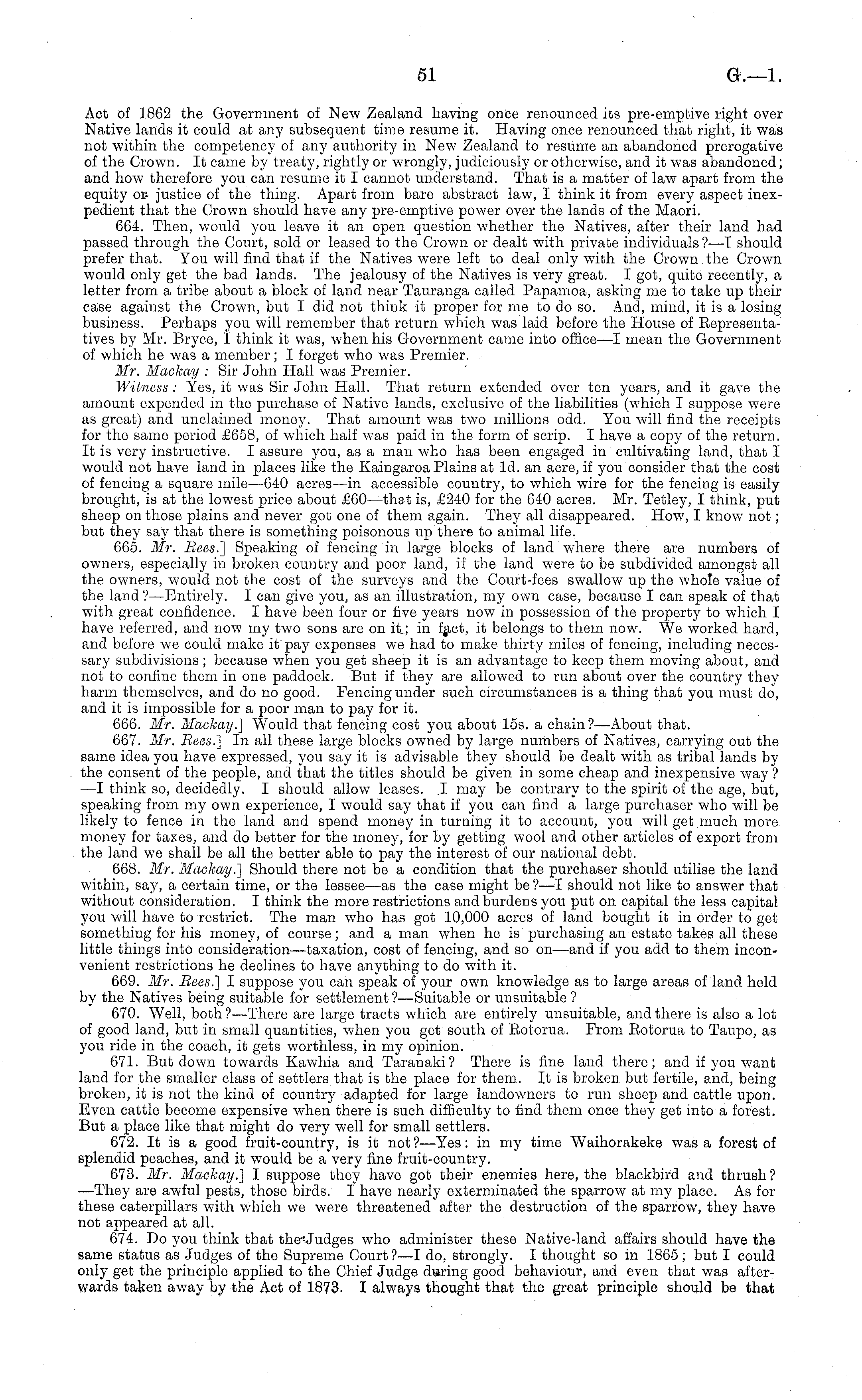 Act of 1862 the Government of New Zealand having once renounced its pre-emptive right over Native lands it could at any subsequent time resume it. Having once renounced that right, it was not within the competency of any authority in New Zealand to resume an abandoned prerogative of the Crown. It came by treaty, rightly or wrongly, judiciously or otherwise, and it was abandoned; and how therefore you can resume it I cannot understand. That is a matter of law apart from the equity or- justice of the thing. Apart from bare abstract law, I think it from every aspect inexpedient that the Crown should have any pre-emptive power over the lands of the Maori. 664. Then, would you leave it an open question whether the Natives, after their land had passed through the Court, sold or leased to the Crown or dealt with private individuals ?—I should prefer that. You will find that if the Natives were left to deal only with the Crown the Crown would only get the bad lands. The jealousy of the Natives is very great. I got, quite recently, a letter from a tribe about a block of land near Tauranga called Eapainoa, asking me to take up their case against the Crown, but I did not think it proper for me to do so. And, mind, it is a losing business. Perhaps you will remember that return which was laid before the House of Eepresentatives by Mr. Bryce, I think it was, when his Government came into office—l mean the Government of which he was a member; I forget who was Premier. Mr. Mackay : Sir John Hall was Premier. Witness: Yes, it was Sir John Hall. That return, extended over ten years, and it gave the amount expended in the purchase of Native lands, exclusive of the liabilities (which I suppose were as great) and unclaimed money. That amount was two millions odd. You will find the receipts for the same period £658, of which half was paid in the form of scrip. I have a copy of the return. It is very instructive. I assure you, as a man who has been engaged in cultivating land, that I would not have land in places like the Kaingaroa Plains at Id. an acre, if you consider that the cost of fencing a square mile—64o acres —in accessible country, to which wire for the fencing is easily brought, is at the lowest price about £60 —that is, £240 for the 640 acres. Mr. Tetley, I think, put sheep on those plains and never got one of them again. They all disappeared. How, I know not; but they say that there is something poisonous up there to animal life. 665. Mr. Bees.] Speaking of fencing in large blocks of land where there are numbers of owners, especially in broken country and poor land, if the land were to be subdivided amongst all the owners, would not the cost of the surveys and the Court-fees swallow up the whole value of the land ? —Entirely. I can give you, as an illustration, my own case, because I can speak of that with great confidence. I have been four or five years now in possession of the property to which I have referred, and now my two sons are on it; in fact, it belongs to them now. We worked hard, and before we could make it pay expenses we had to make thirty miles of fencing, including necessary subdivisions; because when you get sheep it is an advantage to keep them moving about, and not to confine them in one paddock. But if they are allowed to run about over the country they harm themselves, and do no good. Fencing under such circumstances is a thing that you must do, and it is impossible for a poor man to pay for it. 666. Mr. Mackay.] Would that fencing cost you about 15s. a chain?—About that. 667. Mr. Bees.] In all these large blocks owned by large numbers of Natives, carrying out the same idea you have expressed, you say it is advisable they should be dealt with as tribal lands by the consent of the people, and that the titles should be given in some cheap and inexpensive way ? —I think so, decidedly. I should allow leases. I may be contrary to the spirit of the age, but, speaking from my own experience, I would say that if you can find a large purchaser who will be likely to fence in the land and spend money in turning it to account, you will get much more money for taxes, and do better for the money, for by getting wool and other articles of export from the land we shall be all the better able to pay the interest of our national debt. 668. Mr. Mackay.] Should there not be a condition that the purchaser should utilise the land within, say, a certain time, or the lessee—as the case might be ?—I should not like to answer that without consideration. I think the more restrictions and burdens you put on capital the less capital you will have to restrict. The man who has got 10,000 acres of land bought it in order to get something for his money, of course; and a man when he is purchasing an estate takes all these little things into consideration—taxation, cost of fencing, and so on —and if you add to them inconvenient restrictions he declines to have anything to do with it. 669. Mr. Bees.] I suppose you can speak of your own knowledge as to large areas of land held by the Natives being suitable for settlement? —Suitable or unsuitable? 670. Well, both ?—There are large tracts which are entirely unsuitable, and there is also a lot of good land, but in small quantities, when you get south of Eotorua. From Eotorua to Taupo, as you ride in the coach, it gets worthless, in my opinion. 671. But down towards Kawhia and Taranaki? There is fine land there; and if you want land for the smaller class of settlers that is the place for them. It is broken but fertile, and, being broken, it is not the kind of country adapted for large landowners to run sheep and cattle upon. Even cattle become expensive when there is such difficulty to find them once they get into a forest. But a place like that might do very well for small settlers. 672. It is a good fruit-country, is it not?—Yes: in my time Waihorakeke was a forest of splendid peaches, and it would be a very fine fruit-country. 673.