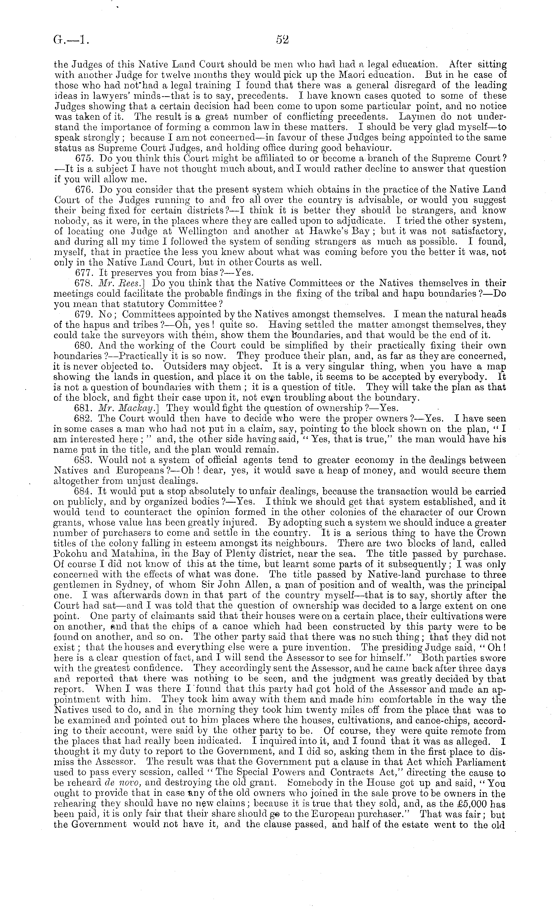 the Judges of this Native Land Court should be men who had had a legal education. After sitting with another Judge for twelve months they would pick up the Maori education. But in he case of those who had not'had a legal training I found that there was a general disregard of the leading ideas in lawyers' minds—that is to say, precedents. I have known cases quoted to some of these Judges showing that a certain decision had been come to upon some particular point, and no notice was taken of it. The result is a great number of conflicting precedents. Laymen do not understand the importance of forming a common law in these matters. I should be very glad myself —to speak strongly; because I am not concerned—in favour of these Judges being appointed to the same status as Supreme Court Judges, and holding office during good behaviour. 675. Do you think this Court might be affiliated to or become a branch of the Supreme Court ? —It is a subject I have not thought much about, and I would rather decline to answer that question if you will allow me. 676. Do you consider that the present system which obtains in the practice of the Native Land Court of the Judges running to and fro all over the country is advisable, or would you suggest their being fixed for certain districts?—l think it is better they should bo strangers, and know nobody, as it were, in the places where they are called upon to adjudicate. I tried the other system, of locating one Judge at Wellington and another at Hawke's Bay ; but it was not satisfactory, and during all my time I followed the system of sending strangers as much as possible. I found, myself, that in practice the less you knew about what was coming before you the better it was, not only in the Native Land Court, but in other Courts as well. 677. It preserves you from bias?—Yes. 678. Mr. Bees.] Do you think that the Native Committees or the Natives themselves in their meetings could facilitate the probable findings in the fixing of the tribal and hapu boundaries ?—Do you mean that statutory Committee ? 679. No ; Committees appointed by the Natives amongst themselves. I mean the natural heads of the hapus and tribes ?—Oh, yes ! quite so. Having settled the matter amongst themselves, they could take the surveyors with thein, show them the boundaries, and that would be the end of it. 680. And the working of the Court could be simplified by their practically fixing their own boundaries ?—Practically it is so now. They produce their plan, and, as far as they are concerned, it is never objected to. Outsiders may object. It is a very singular thing, when you have a map showing the lands in question, and place it on the table, it seems to be accepted by everybody. It is not a question of boundaries with them ; it is a question of title. They will take the plan as that of the block, and fight their case upon it, not even troubling about the boundary. 681. Mr. Mackay.] They would fight the question of ownership?—Yes. 682. The Court would then have to decide who were the proper owners ? —Yes. I have seen in some cases a man who had not put in a claim, say, pointing to the block shown on the plan, " I am interested here ; " and, the other side having said, " Yes, that is true," the man would have his name put in the title, and the plan would remain. 683. Would not a system of official agents tend to greater economy in the dealings between Natives and Europeans ?—Oh ! dear, yes, it would save a heap of money, and would secure them, altogether from unjust dealings. 684. It would put a stop absolutely to unfair dealings, because the transaction would be carried on publicly, and by organized bodies ? —Yes. I think we should get that system established, and it would tend to counteract the opinion formed in the other colonies of the character of our Crown grants, whose value has been greatly injured. By adopting such a system we should induce a greater number of purchasers to come and settle in the country. It is a serious thing to have the Crown titles of the colony falling in esteem amongst its neighbours. There are two blocks of land, called Pokohu and Matahina, in the Bay of Plenty district, near the sea. The title passed by purchase. Of course I did not know of this at the time, but learnt some parts of it subsequently; I was only concerned with the effects of what was done. The title passed by Native-land purchase to three gentlemen in Sydney, of whom Sir John Allen, a man of position and of wealth, was the principal one. I was afterwards down in that part of the country myself—that is to say, shortly after the Court had sat—and I was told that the question of ownership was decided to a large extent on one point. One party of claimants said that their houses were on a certain place, their cultivations were on another, and that the chips of a canoe which had been constructed by this party were to be found on another, and so on. The other party said that there was no such thing; that they did not exist ; that the houses and everything else were a pure invention. The presiding Judge said, "Oh ! here is a clear question of fact, and I will send the Assessor to see for himself." Both parties swore with the greatest confidence. They accordingly sent the Assessor, and he came back after three days and reported that there was nothing to be seen, and the judgment was greatly decided by that report. When I was there I found that this party had got hold of the Assessor and made an appointment with him. They took him away with them and made him comfortable in the way the Natives used to do, and in the morning they took him twenty miles off from the place that was to be examined and pointed out to him places where the houses, cultivations, and canoe-chips, according to their account, were said by the other party to be. Of course, they were quite remote from the places that had really been indicated. I inquired into it, and I found that it was as alleged. I though