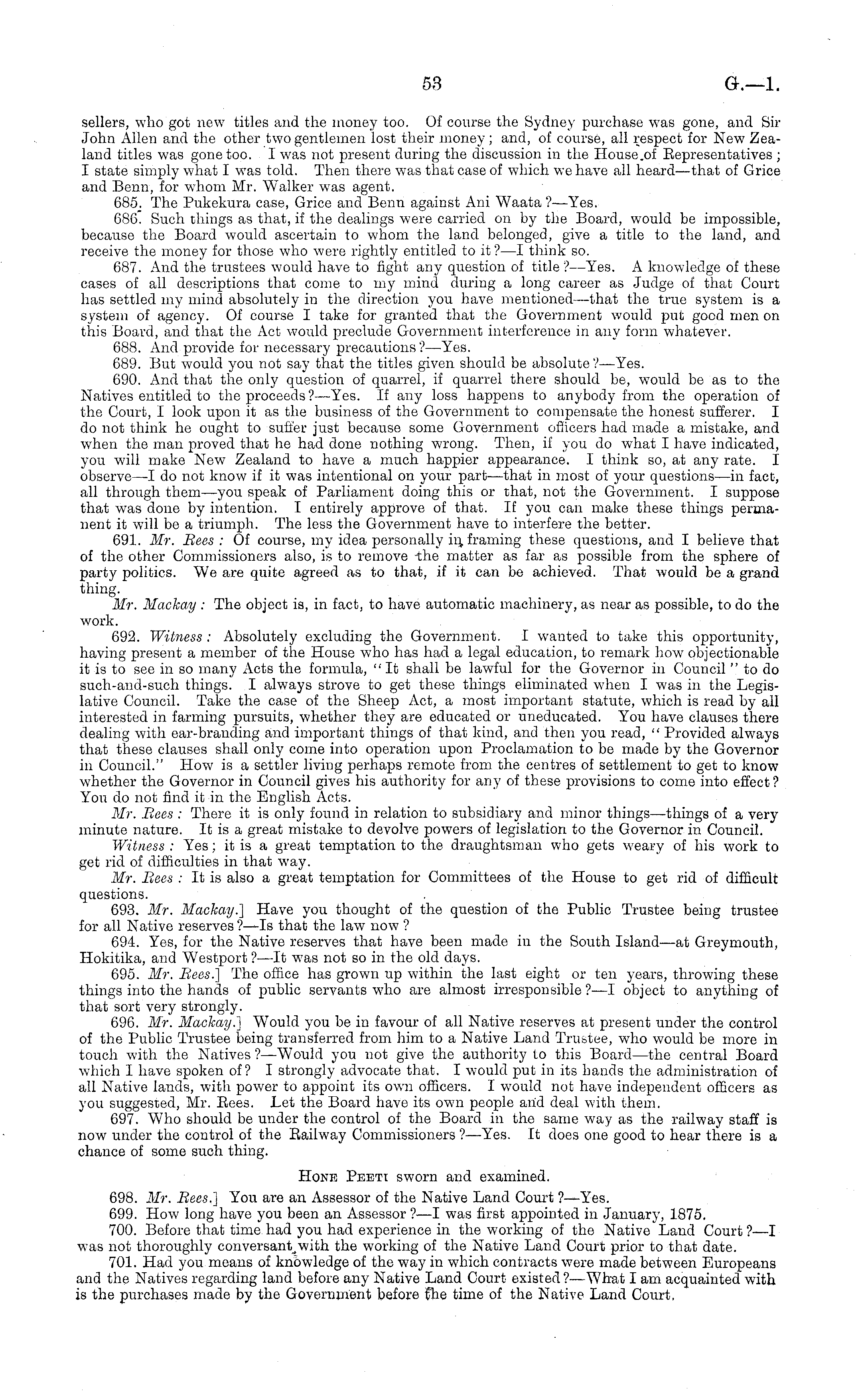 sellers, who got new titles and the money too. Of course the Sydney purchase was gone, and Sir John Allen and the other tAvo gentlemen lost their money ; and, of course, all respect for New Zealand titles was gone too. I Avas not present during the discussion in the House .of Representatives ; I state simply Avhat I was told. Then there was that case of which we haA'e all heard—that of Grice and Benn, for whom Mr. Walker was agent. 685 ; The Pukekura case, Grice and Benn against Ani Waata ?—Yes. 686. Such things as that, if the dealings were carried on by the Board, Avould be impossible, because the Board would ascertain to whom the land belonged, give a title to the land, and receive the money for those who were rightly entitled to it ?—I think so. 687. And the trustees Avould have to fight any question of title ?—Yes. A knowledge of these cases of all descriptions that come to my mind during a long career as Judge of that Court has settled my mind absolutely in the direction you have mentioned—that the true system is a system of agency. Of course I take for granted that the Government Avould put good men on this Board, and that the Act would preclude Government interference in any form whatever. 688. And provide for necessary precautions ? —Yes. 689. But Avould you not say that the titles given should be absolute ?—Yes. 690. And that the only question of quarrel, if quarrel there should be, would be as to the Natives entitled to the proceeds?—Yes. If any loss happens to anybody from the operation of the Court, I look upon it as the business of the Government to compensate the honest sufferer. I do not think he ought to suffer just because some Government officers had made a mistake, and when the man proved that he had done nothing wrong. Then, if you do what I have indicated, you will make New Zealand to have a much happier appearance, I think so, at any rate. I observe—l do not know if it was intentional on your part—that in most of your questions—in fact, all through them—you speak of Parliament doing this or that, not the Government. I suppose that was done by intention. I entirely approve of that. If you can make these things permanent it will be a triumph. The less the Government have to interfere the better. 691. Mr. Bees : Of course, my idea personally ii; framing these questions, and I believe that of the other Commissioners also, is to remove the matter as far as possible from the sphere of party politics. We are quite agreed as to that, if it can be achieved. That Avould be a grand thing. Mr. Mackay : The object is, in fact, to have automatic machinery, as near as possible, to do the work. 692. Witness : Absolutely excluding the Government. I wanted to take this opportunity, having present a member of the House Avho has had a legal education, to remark how objectionable it is to see in so many Acts the formula, "It shall be lawful for the Governor in Council " to do such-and-such things. I always strove to get these things eliminated when I was in the Legislative Council. Take the case of the Sheep Act, a most important statute, Avhich is read by all interested in farming pursuits, whether they are educated or uneducated. You have clauses there dealing with ear-branding and important things of that kind, and then you read, " Provided always that these clauses shall only come into operation upon Proclamation to be made by the Governor in Council." Hoav is a settler living perhaps remote from the centres of settlement to get to knoAv AA'hether the Governor in Council gives his authority for any of these provisions to come into effect? You do not find it in the English Acts. Mr. Bees : There it is only found in relation to subsidiary and minor things—things of a very minute nature. It is a great mistake to devolve poAvers of legislation to the Governor in Council. Witness: Yes; it is a great temptation to the draughtsman who gets weary of his Avork to get rid of difficulties in that way. Mr. Bees : It is also a great temptation for Committees of the House to get rid of difficult questions. 693. Mr. Mackay.] Have you thought of the question of the Public Trustee being trustee for all Native reserves ? —ls that the law now ? 694. Yes, for the Native reserves that have been made in the South Island—at Greymouth, Hokitika, and Westport ?—lt was not so in the old days. 695. Mr. Bees.] The office has grown up Avithin the last eight or ten years, throwing these things into the hands of public servants who are almost irresponsible?—l object to anything of that sort very strongly. 696. Mr. Mackay.] Would you be in favour of all Native reserves at present under the control of the Public Trustee being transferred from him to a Native Land Trustee, who would be more in touch with the Natives?—Would you not give the authority to this Board—the central Board which I haA'e spoken of? I strongly adA'Ocate that. I would put in its bands the administration of all NatiA'e lands, with power to appoint its own officers. I would not have independent officers as you suggested, Mr. Rees. Let the Board have its oavii people and deal Avith them. 697. Who should be under the control of the Board in the same way as the railway staff is now under the control of the Railway Commissioners ? —Yes. It does one good to hear there is a chance of some such thing. Hone Peeti sworn and examined. 698. Mr. Bees.] You are an Assessor of the Native Land Court ?—Yes. 699. How long have you been an Assessor ?—I was first appointed in January, 1875. 700. Before that time, had you had experience in the working of the Native Land Court ?—I was not thoroughly conversant,with the Avorking of the Native Land Court prior to that date. 701. Had you means of knowledge of the way in which contracts were made between Europeans and the Natives regarding land before any Native Land Court existed?—What I am acquainted with is the purchases made by the Government before the time of the Nat