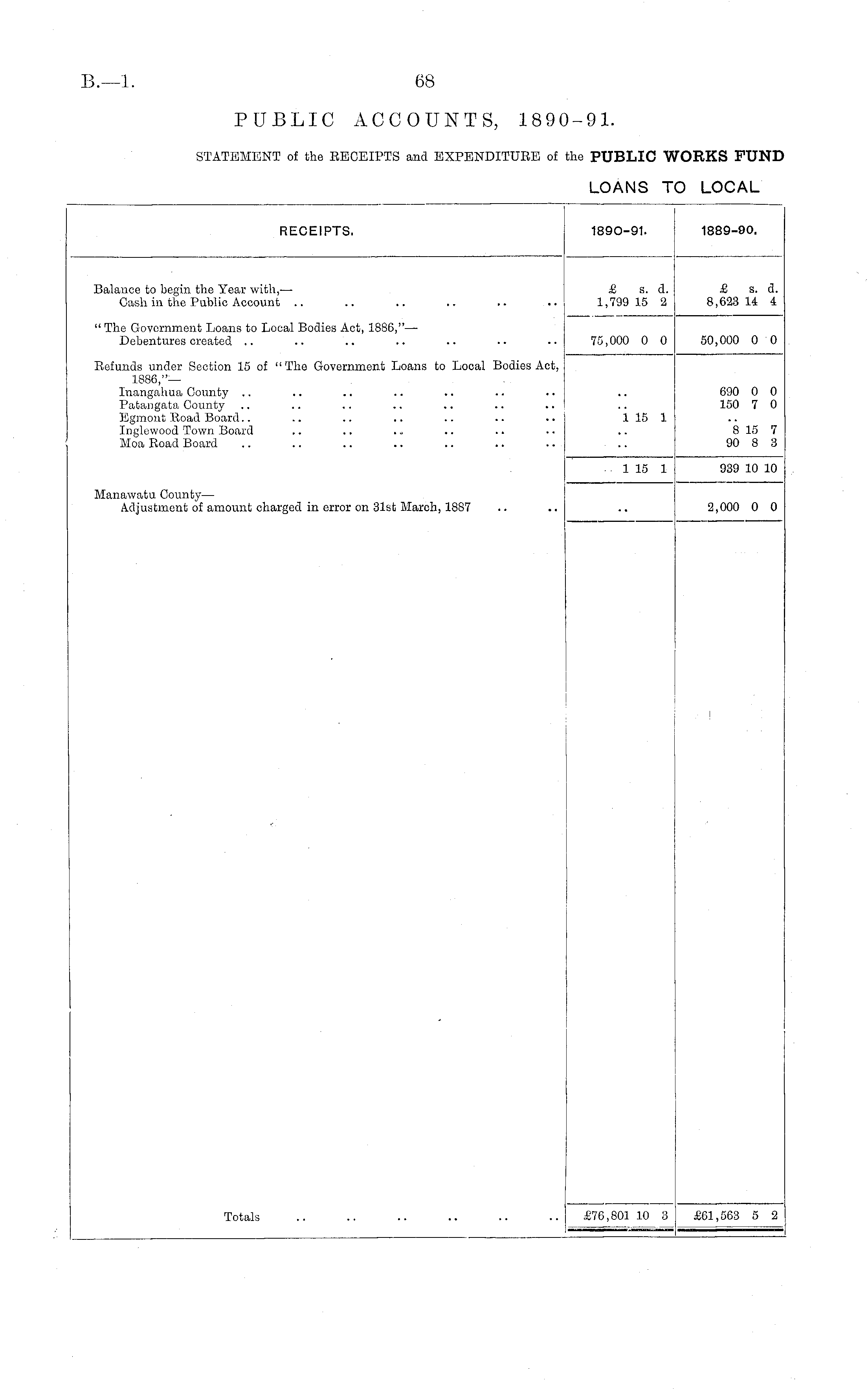 RECEIPTS. 1890-91. 1889-90. Balance to begin the Year with, — Gasli in the Public Account £ s. a. 1,799 15 2 £ s. a. 8,623 14 4 ' The Government Loans to Local Bodies Act, 1886," — Debentures created 75,000 0 0 50,000 0 0 Refunds under Section 15 of "The Government Loans to Local Bodies Act, 1886,"— Inangahua County .. Patangata County Egmont Road Board Inglewood Town Board Moa Road Board 1 15 1 690 0 0 150 7 0 - 8 15 7 90 8 3 Manawatu County— Adjustment of amount charged in error on 31st March, 1887 1 15 1 939 10 10 2,000 0 0 Totals £76,801 10 3 £61,563 5 2