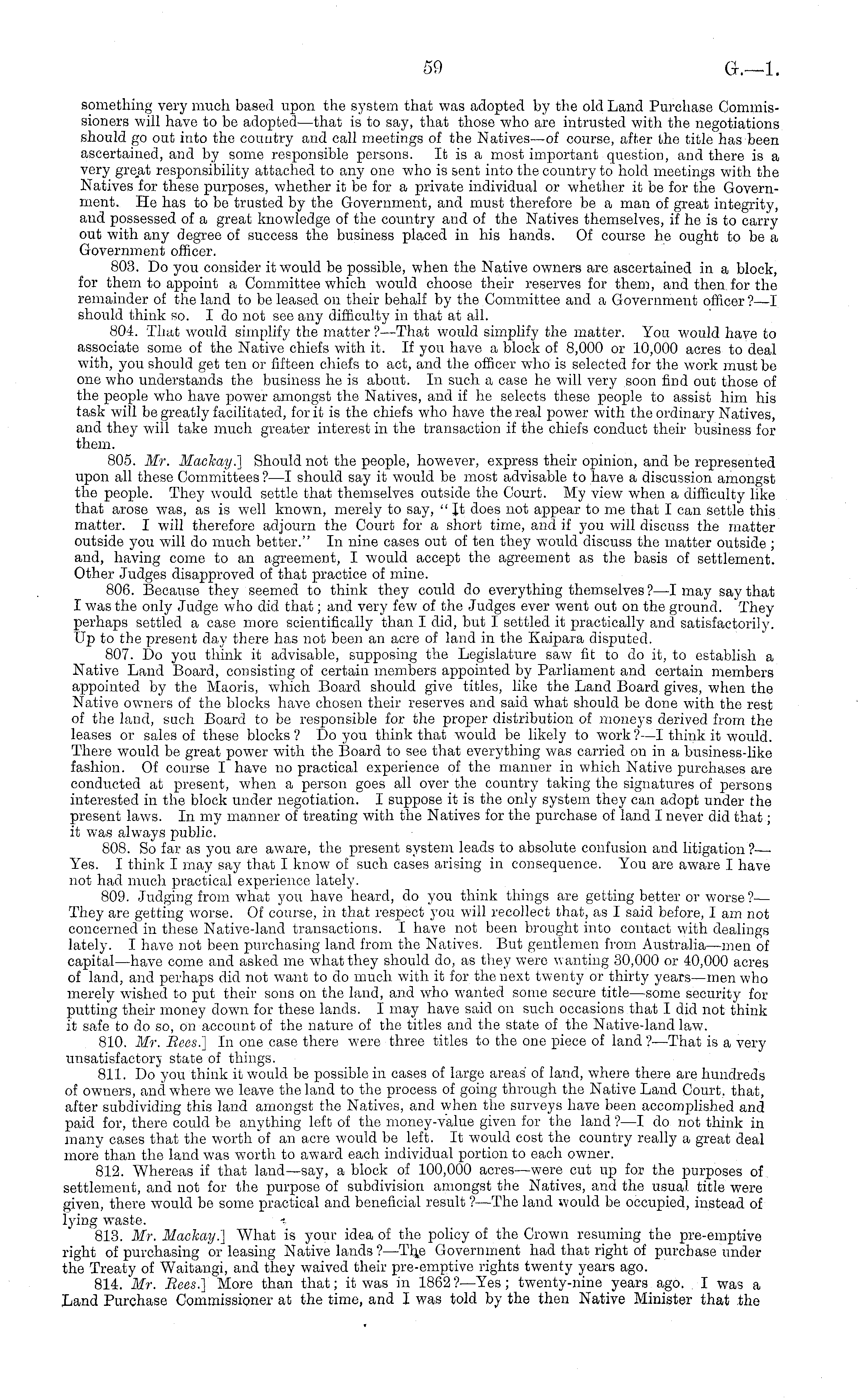 something very much based upon the system that was adopted by the old Land Purchase Commissioners will have to be adopted—that is to say, that those who are intrusted with the negotiations should go out into the country and call meetings of the Natives—of course, after the title has been ascertained, and by some responsible persons. It is a most important question, and there is a very gre_at responsibility attached to any one who is sent into the country to hold meetings with the Natives for these purposes, Avhether it be for a private individual or Avhether it be for the Government. He has to be trusted by the Government, and must therefore be a man of great integrity, and possessed of a great knowledge of the country and of the Natives themselves, if he is to carry out with any degree of success the business placed in his hands. Of course he ought to be a Government officer. 803. Do you consider it would bo possible, when the Native owners are ascertained in a block, for them to appoint a Committee which would choose their reserves for them, and then for the remainder of the land to be leased on their behalf by the Committee and a Government officer ? —I should think so. I do not see any difficulty in that at all, 804. That Avould simplify the matter?—That Avould simplify the matter. Y^ou would have to associate some of the Native chiefs with it. If you have a block of 8,000 or 10,000 acres to deal with, you should get ten or fifteen chiefs to act, and the officer who is selected for the work must be one who understands the business he is about. In such a case he will very soon find out those of the people who have power amongst the Natives, and if he selects these people to assist him his task will be greatly facilitated, for it is the chiefs who have the real power with the ordinary Natives, and they will take much greater interest in the transaction if the chiefs conduct their business for them. 805. Mr. Mackay.] Should not the people, however, express their opinion, and be represented upon all these Committees ? —I should say it Avould be most advisable to haA'e a discussion amongst the people. They Avould settle that themselves outside the Court. My view when a difficulty like that arose was, as is well known, merely to say, " It does not appear to me that I can settle this matter. I will therefore adjourn the Court for a short time, and if you will discuss the matter outside you will do much better." In nine cases out of ten they would discuss the matter outside ; and, having come to an agreement, I Avould accept the agreement as the basis of settlement. Other Judges disapproved of that practice of mine. 806. Because they seemed to think they could do everything themselves ? —I may say that I was the only Judge who did that; and very few of the Judges ever went out on the ground. They perhaps settled a case more scientifically than I did, but 1 settled it practically and satisfactorily. Up to the present day there has not been an acre of land in the Kaipara disputed. 807. Do you think it advisable, supposing the Legislature saAV fit to do it, to establish a Native Laud Board, consisting of certain members appointed by Parliament and certain members appointed by the Maoris, which Board should give titles, like the Land Board gives, when the Native OAvners of the blocks haA'e chosen their reserves and said what should be done with the rest of the land, such Board to be responsible for the proper distribution of moneys derived from the leases or sales of these blocks ? Do you think that would be likely to Avork ?—I think it would. There would be great poAver Avith the Board to see that everything v?as carried on in a business-like fashion. Of course I have no practical experience of the manner in which Native purchases are conducted at present, when a person goes all over the country taking the signatures of persons interested in the block under negotiation. I suppose it is the only system they can adopt under the present laAvs. In my manner of treating with the Natives for the purchase of land I never did that; it was always public. 808. So far as you are aware, the present system leads to absolute confusion and litigation ?—■ Yes. I think I may say that I knoAv of such cases arising in consequence. You are aAvare I have not had much practical experience lately. 809. Judging from what you have heard, do you think things are getting better or Avorse ?— They are getting Avorse. Of course, in that respect you will recollect that, as I said before, lam not concerned in these Native-land transactions. I have not been brought into contact with dealings lately. I have not been purchasing land from the Natives. But gentlemen from Australia—men of capital —have come and asked me Avhatthey should do, as they Avere a\ anting 30,000 or 40,000 acres of land, and perhaps did not want to do much with it for the next twenty or thirty years—men who merely Avished to put their sons on the land, and AA'ho wanted some secure title—some security for putting their money down for these lands. 1 may have said on such occasions that I did not think it safe to do so, on account of the nature of the titles and the state of the Native-land law. 810. Mr. Bees.] In one case there Avere three titles to the one piece of land ?—That is a very unsatisfactory state of things. 811. Do"you think it Avould be possible in cases of large areas' of land, where there are hundreds of owners, and where we leave the land to the process of going through the Native Land Court, that, after subdividing this land amongst the Natives, and Avhen the surveys have been accomplished and paid for, there could be anything left of the money-value given for the land ?—I do not think in many cases that the Avorth of an acre would be left. It Avould cost the country really a great deal more" than the land Avas Avorth to aAvard each individual portion to each owner. 812. Whereas if that land —say, a block of 