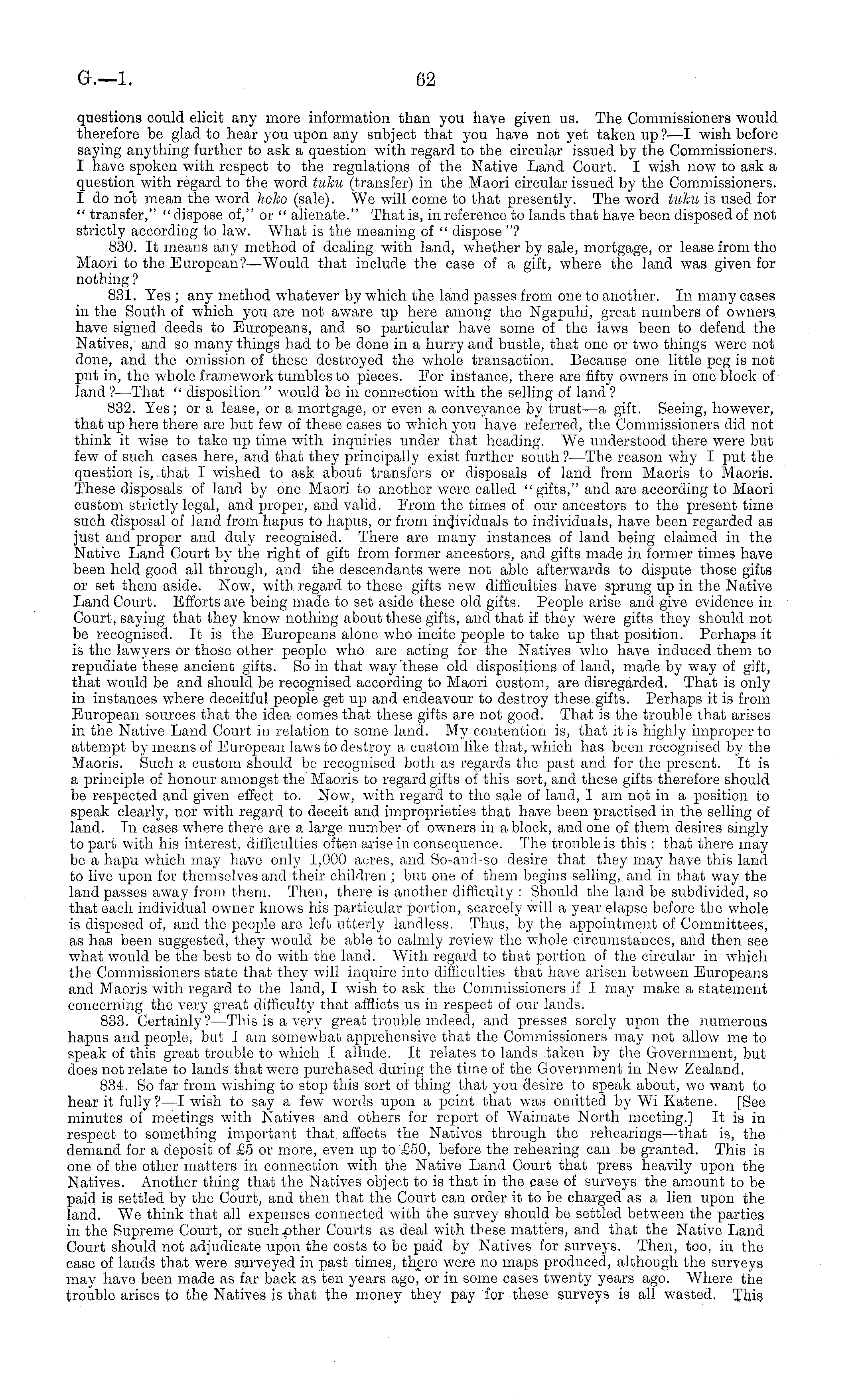 questions could elicit any more information than you have given us. The Commissioners would therefore be glad to hear you upon any subject that you have not yet taken up? —I wish before saying anything further to ask a question with regard to the circular issued by the Commissioners. I have spoken with respect to the regulations of the Native Land Court. I wish now to ask a question with regard to the word tuku (transfer) in the Maori circular issued by the Commissioners. Ido no't mean the word hoko (sale). We will come to that presently. The word tuku is used for " transfer," " dispose of," or " alienate." That is, in reference to lands that have been disposed of not strictly according to law. What is the meaning of " dispose "'? 830. It means any method of dealing with land, w7hether by sale, mortgage, or lease from the Maori to the European?—Would that include the case of a gift, where the land was given for nothing? 831. Yes ; any method whatever by which the land passes from one to another. In many cases in the South of w7hich you are not aware up here among the Ngapuhi, great numbers of owners have signed deeds to Europeans, and so particular have some of the laws been to defend the Natives, and so many things had to be done in a hurry and bustle, that one or two things were not done, and the omission of these destroyed the whole transaction. Because one little peg is not put in, the whole framework tumbles to pieces. For instance, there are fifty owners in one block of land ?■—That " disposition " would be in connection w Tith the selling of land ? 832. Yes; or a lease, or a mortgage, or even a conveyance by trust—a gift. Seeing, however, that up here there are but few of these cases to which you have referred, the Commissioners did not think it wise to take up time with inquiries under that heading. We understood there were but few of such cases here, and that they principally exist further south ?—The reason why I put the question is, that I wished to ask about transfers or disposals of land from Maoris to Maoris. These disposals of land by one Maori to another were called "gifts," and are according to Maori custom strictly legal, and proper, and valid. From the times of our ancestors to the present time such disposal of land from hapus to hapus, or from individuals to individuals, have been regarded as just and proper and duly recognised. There are many instances of land being claimed in the Native Land Court by the right of gift from former ancestors, and gifts made in former times have been held good all through, and the descendants were not able afterwards to dispute those gifts or set them aside. Now, with regard to these gifts new difficulties have sprung up in the Native Land Court. Efforts are being made to set aside these old gifts. People arise and give evidence in Court, saying that they know nothing about these gifts, and that if they were gifts they should not be recognised. It is the Europeans alone who incite people to take up that position. Perhaps it is the lawyers or those other people who are acting for the Natives who have induced them to repudiate these ancient gifts. So in that way "these old dispositions of land, made by way of gift, that would be and should be recognised according to Maori custom, are disregarded. That is only in. instances where deceitful people get up and endeavour to destroy these gifts. Perhaps it is from European sources that the idea comes that these gifts are not good. That is the trouble that arises in the Native Land Court in relation to some land. My contention is, that it is highly improper to attempt by means of European laws to destroy a custom like that, which has been recognised by the Maoris. Such a custom should be recognised both as regards the past and for the present. It is a principle of honour amongst the Maoris to regard gifts of this sort, and these gifts therefore should be respected and given effect to. Now, with regard to the sale of land, I am not in a position to speak clearly, nor with regard to deceit and improprieties that have been practised in the selling of land. In cases where there are a large number of owners in a block, and one of them desires singly to part with his interest, difficulties often arise in consequence. The trouble is this : that there may be a hapu which may have only 1,000 acres, and So-and-so desire that they may have this land to live upon for themselves and their children ; but one of them begins selling, and in that way the land passes away from them. Then, there is another difficulty : Should the land be subdivided, so that each individual owner knows his particular portion, scarcely will a year elapse before the whole is disposed of, and the people are left utterly landless. Thus, by the appointment of Committees, as has been suggested, they would be able to calmly review the whole circumstances, and then see what would be the best to do with the land. With regard to that portion of the circular in which the Commissioners state that they will inquire into difficulties that have arisen between Europeans and Maoris with regard to the land, I wish to ask the Commissioners if I may make a statement concerning the very great difficulty that afflicts us in respect of our lands. 833. Certainly?—This is a very great trouble indeed, and presses sorely upon the numerous hapus and people, but I am somewhat apprehensive that the Commissioners may not allow me to speak of this great trouble to which I allude. It relates to lands taken by the Government, but does not relate to lands that were purchased during the time of the Government in New Zealand. 834. So far from wishing to stop this sort of thing that you desire to speak about, we want to hear it fully?—l wish to say a few words upon a point that was omitted by Wi Katene. [See minutes of meetings with Natives and others for report of Waimate North meeting.] It is in respect to something important that affects the Natives